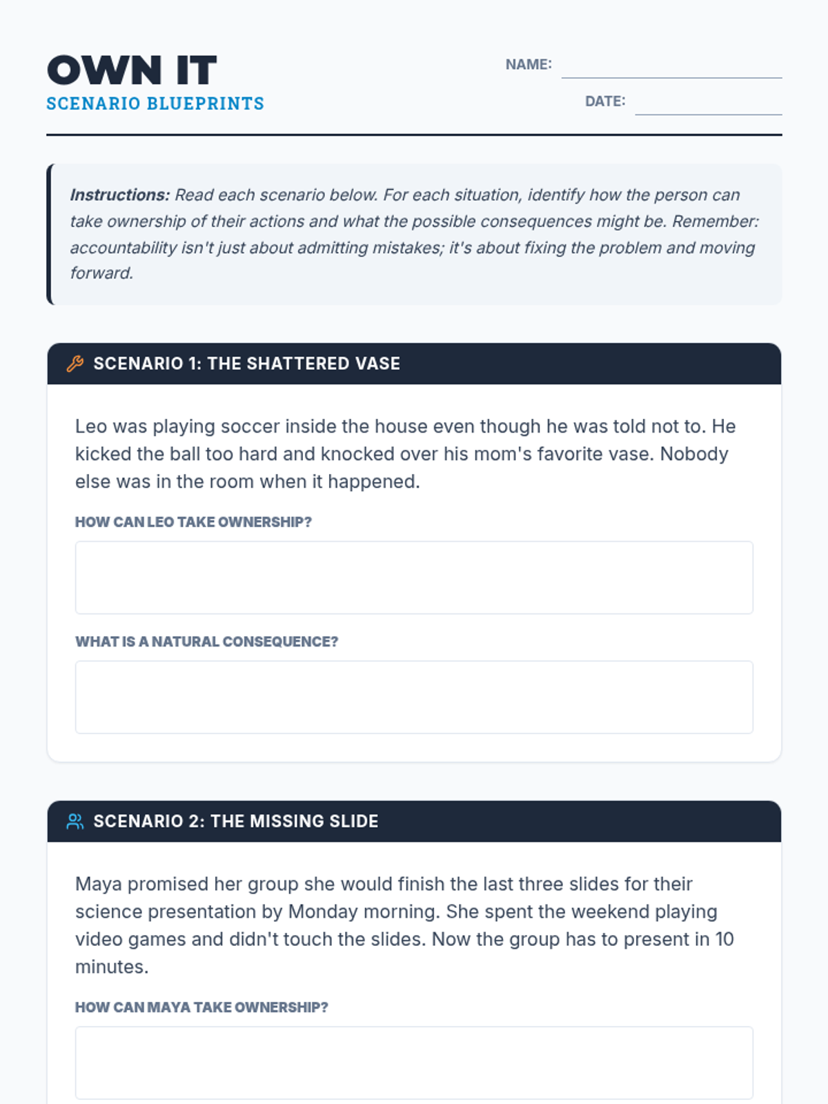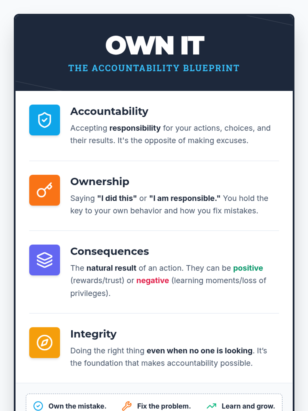 A foundational lesson on accountability that teaches students how to take ownership of their actions and understand the resulting consequences through clear definitions and real-world application.