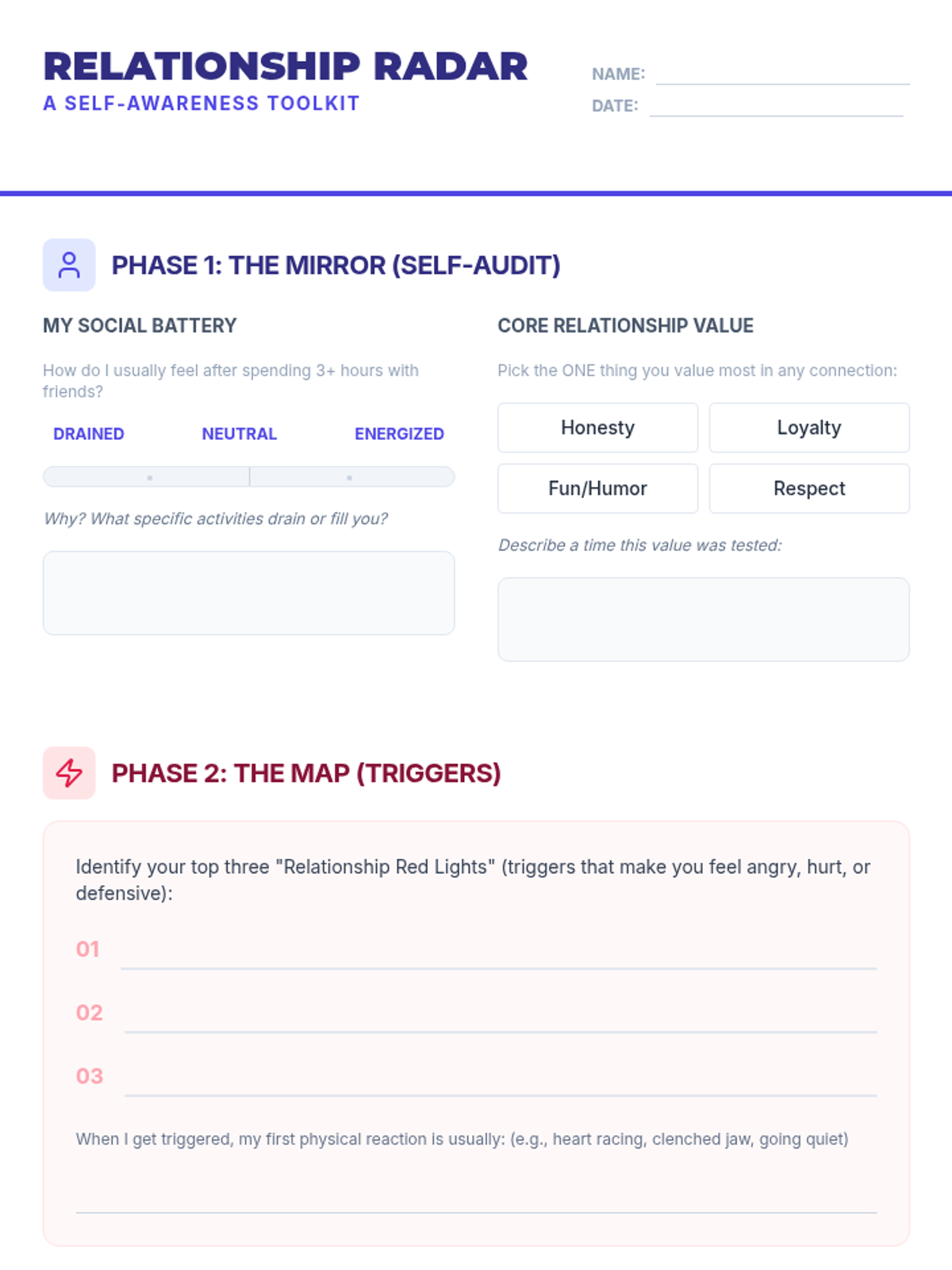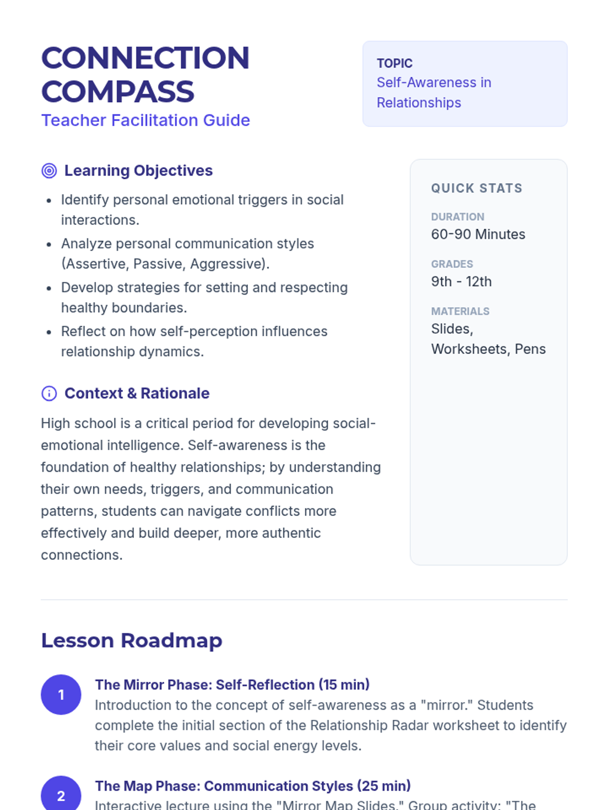 A high school lesson focusing on self-awareness within relationships, helping students identify their communication styles, boundaries, and emotional triggers to build healthier connections.