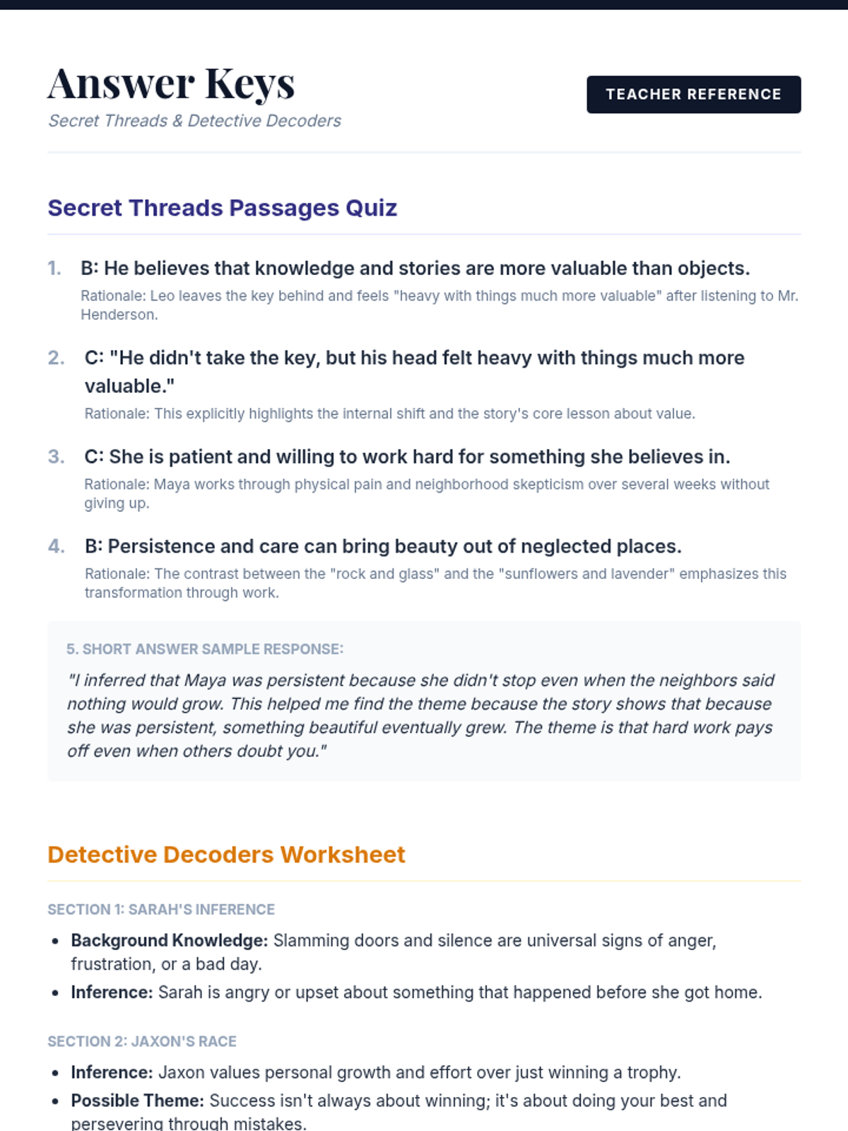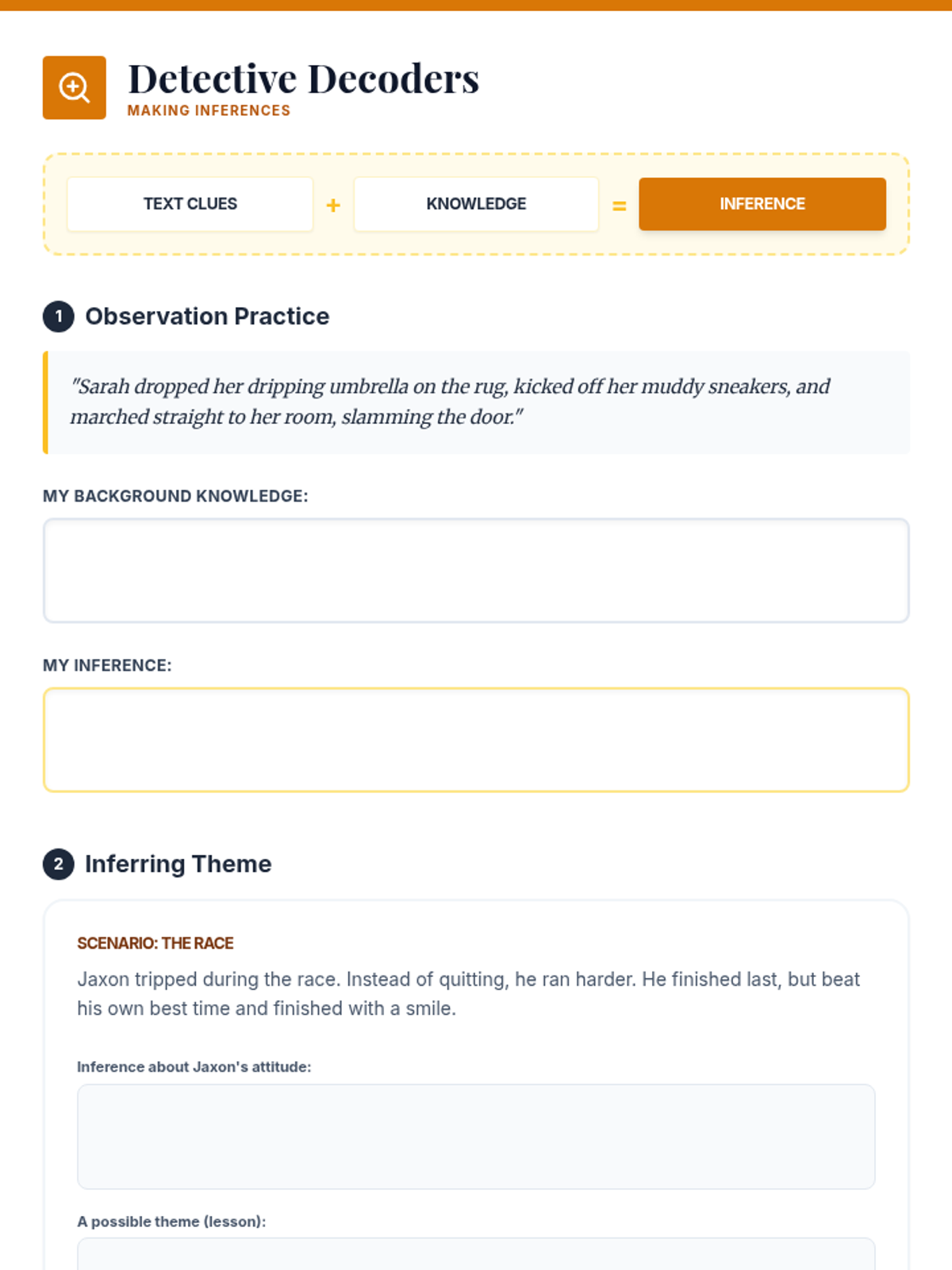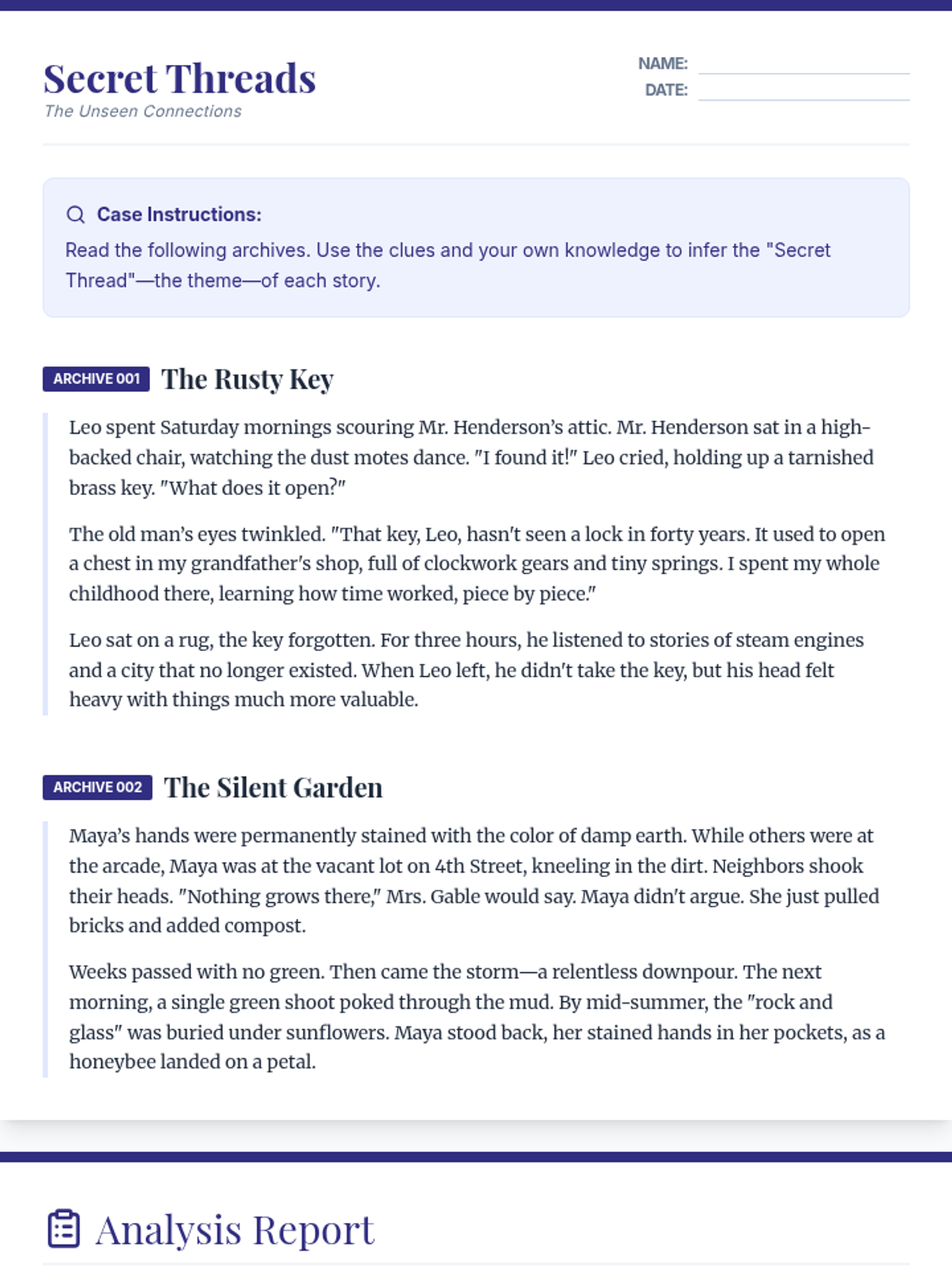 A lesson focused on uncovering deeper meanings in fiction through inference and theme identification using a 'detective' aesthetic.
