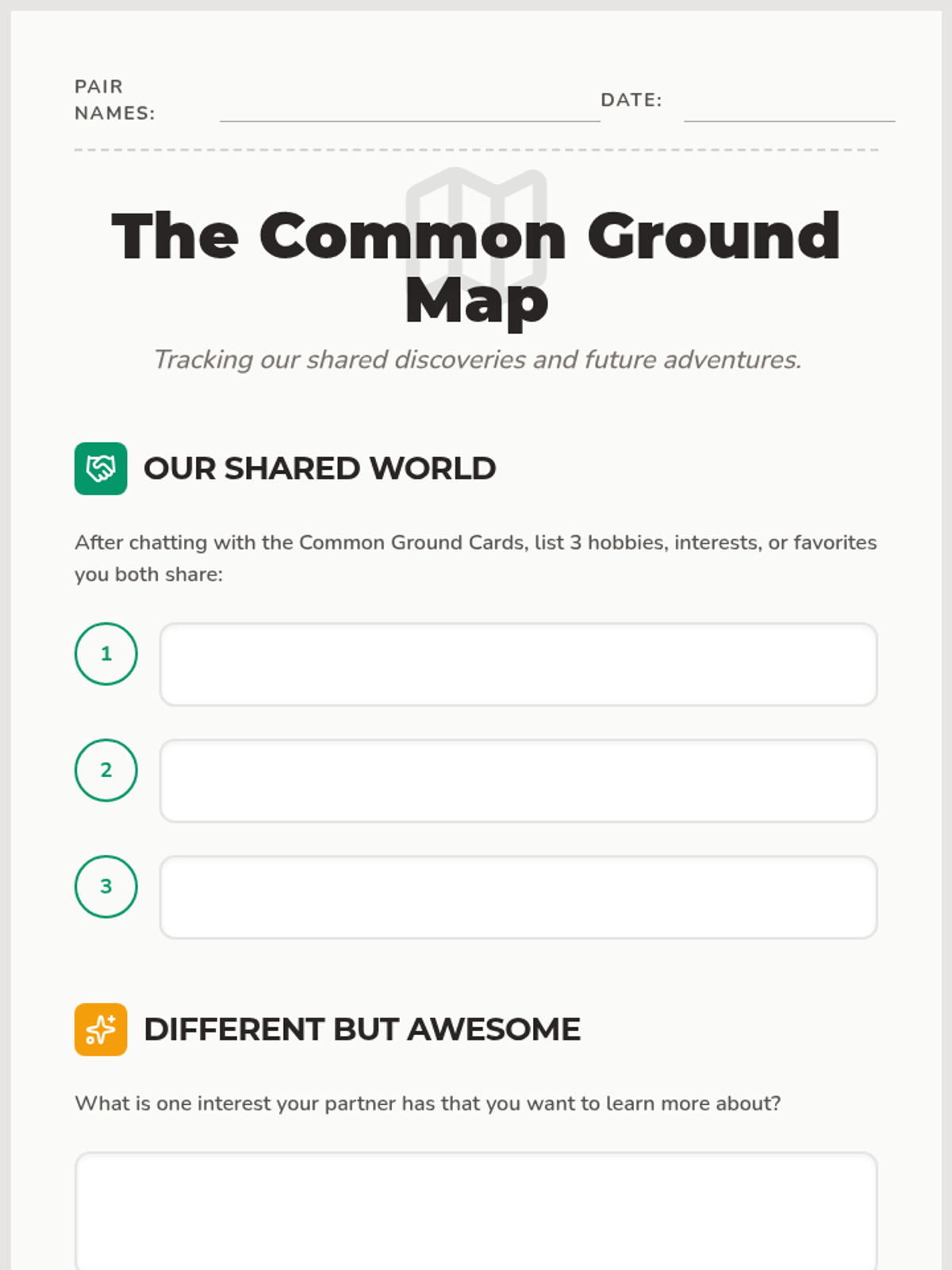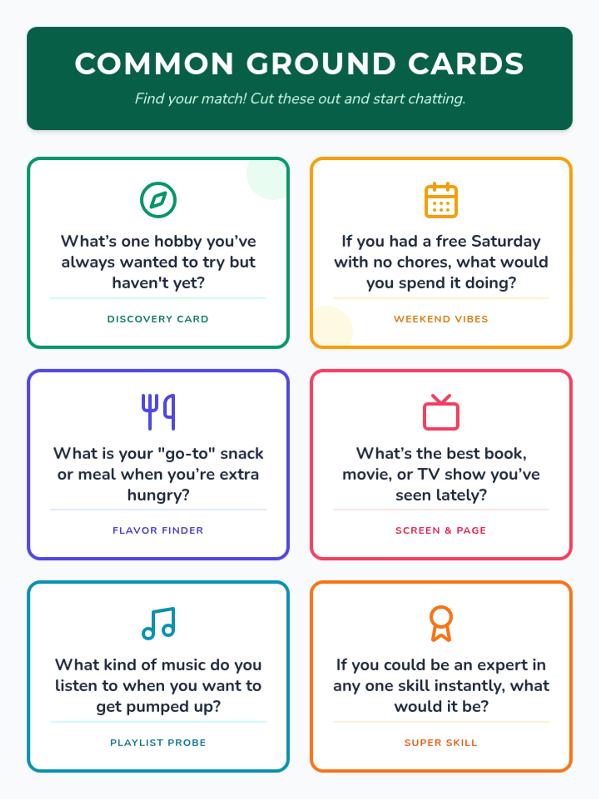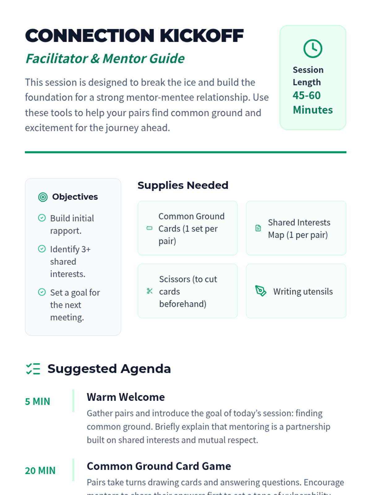 A structured first meeting for mentor-mentee pairs to build rapport and identify shared interests through interactive conversation and discovery.