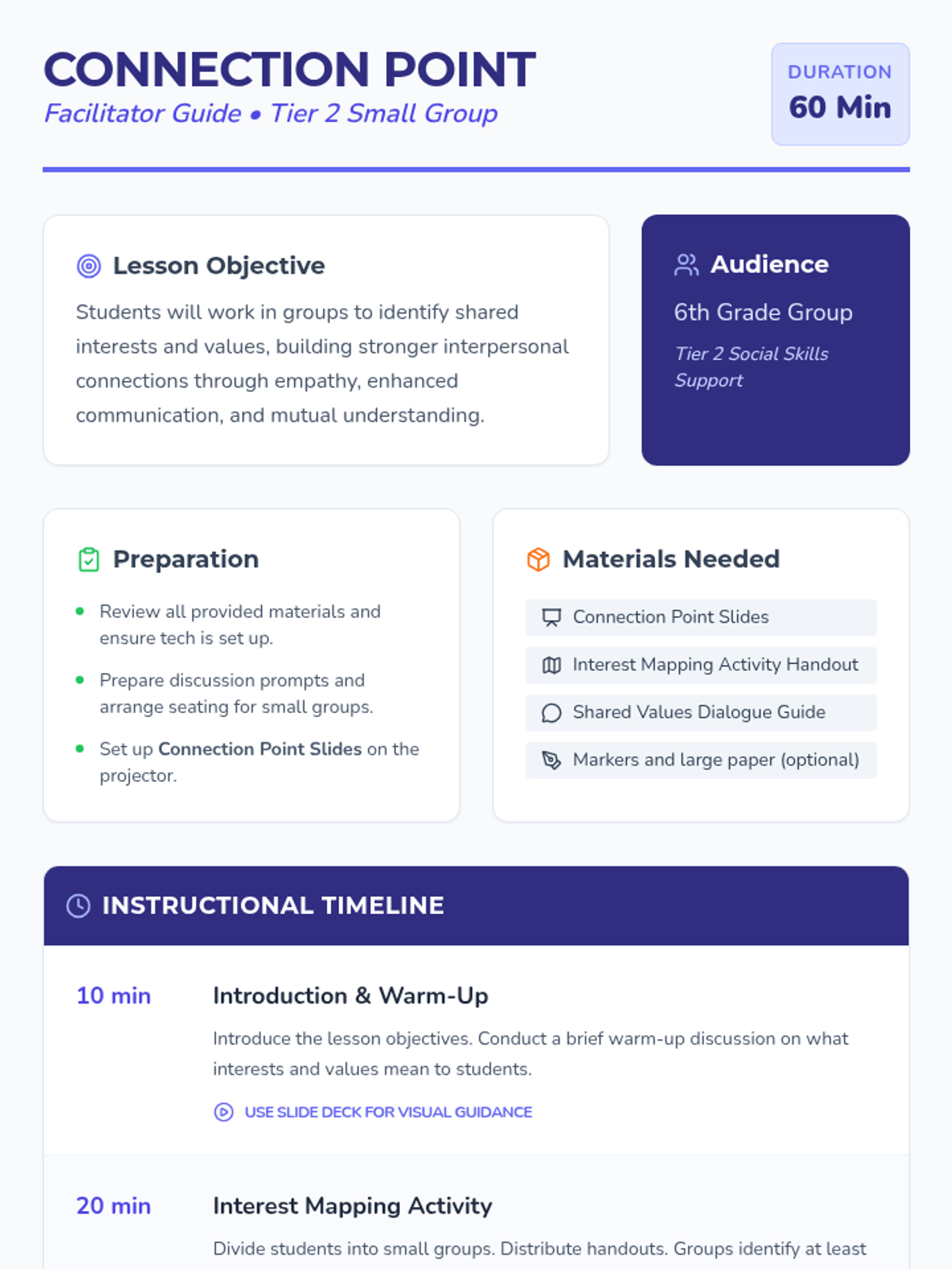 A 60-minute small group lesson for 6th graders focused on identifying common interests and shared values to build empathy and strengthen peer relationships through interactive mapping and discussion.