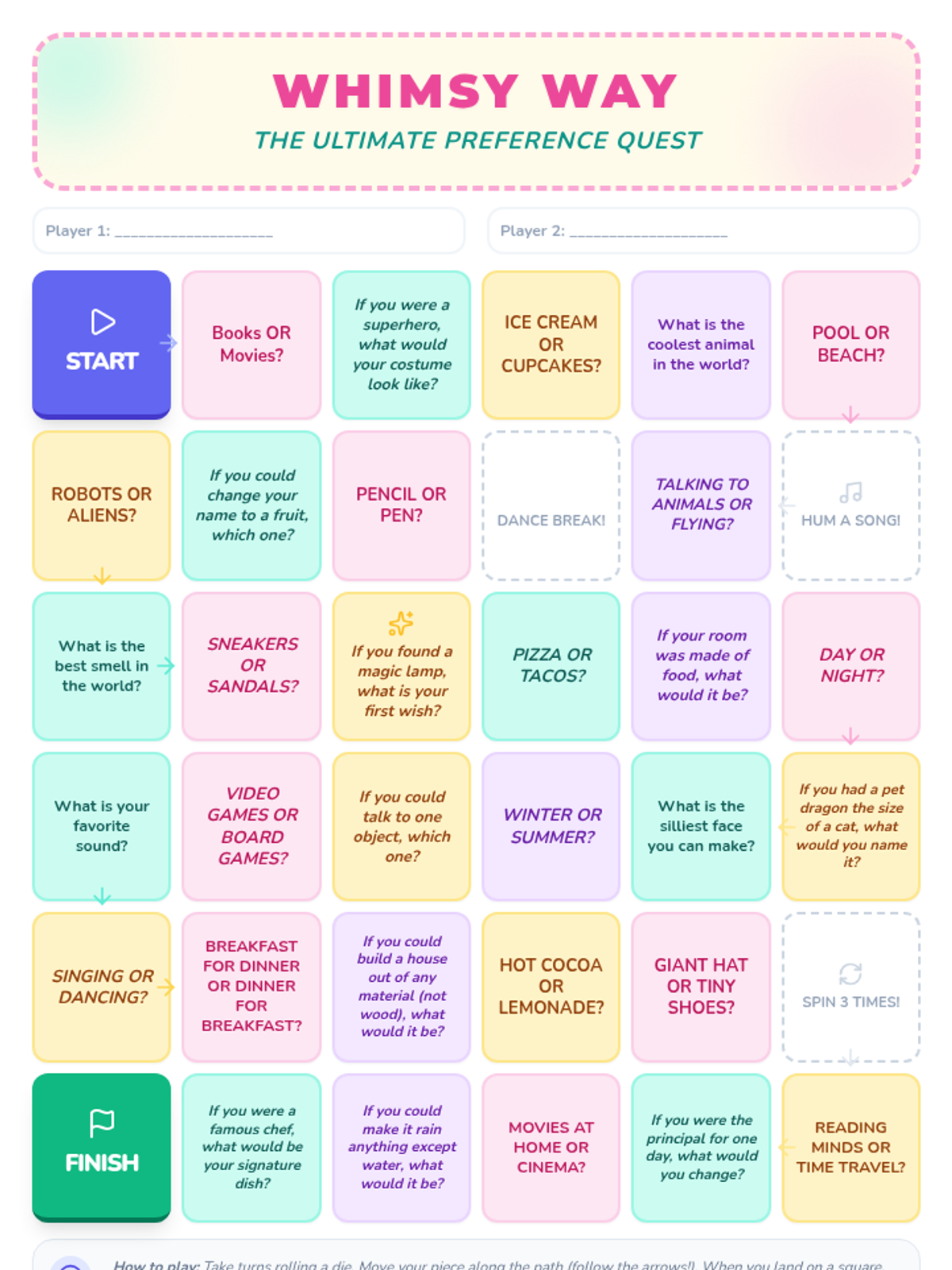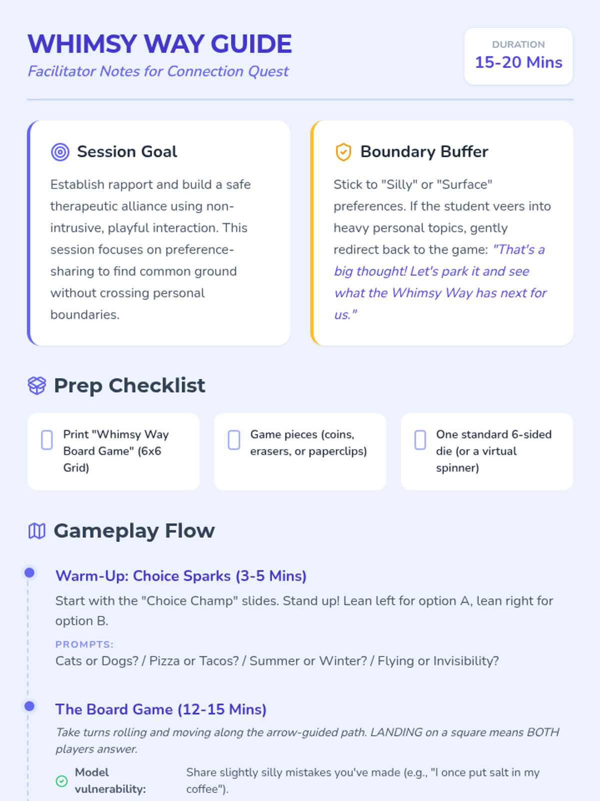 An engaging, boundary-respecting individual session for a 4th grade student to build rapport through playful 'This or That' choices and a whimsical board game focused on silly preferences.
