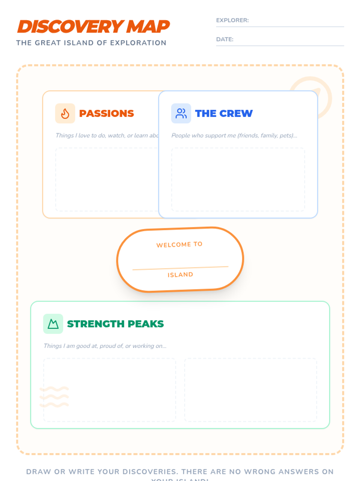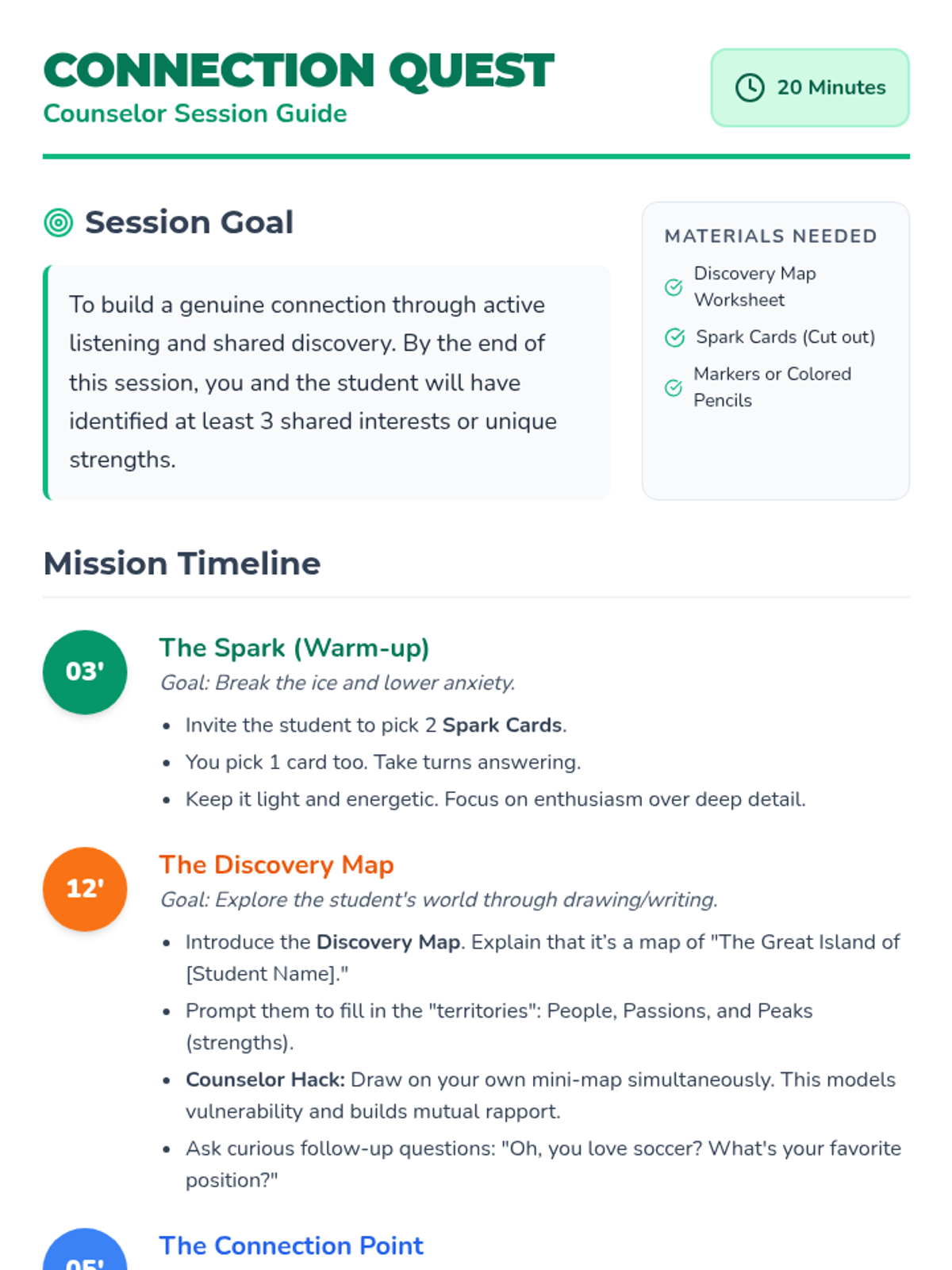 A 20-minute individual counseling session focused on building rapport through a hands-on 'Discovery Map' activity. The lesson emphasizes mutual sharing and creating a safe, engaging environment for students to share their interests and strengths.