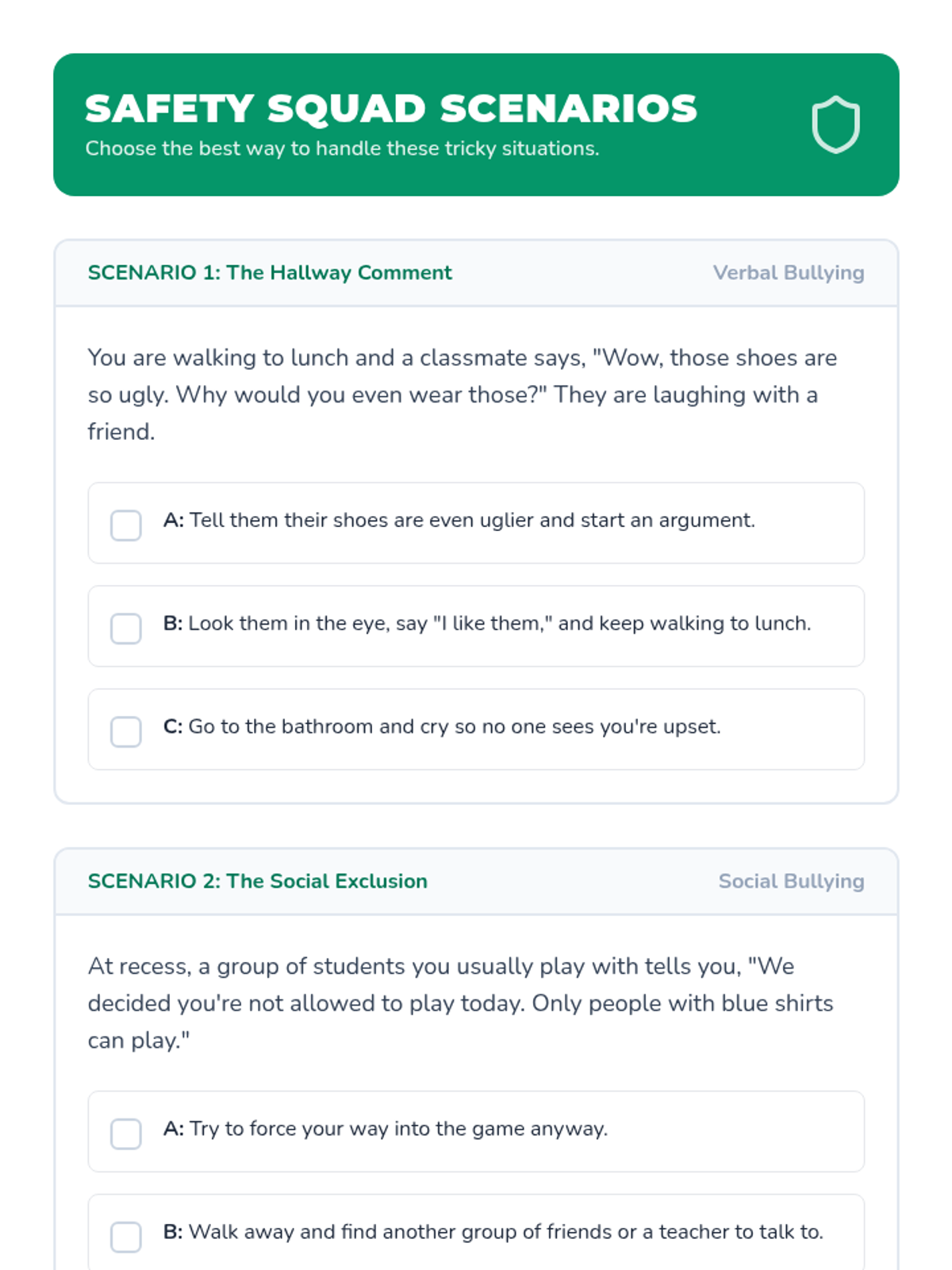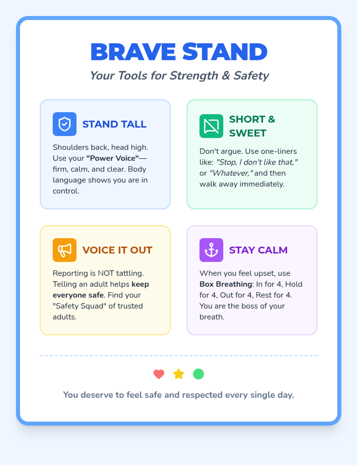 A supportive counseling session designed for 5th graders to build resilience against bullying, identify emotions, and learn practical strategies for standing up for themselves and seeking help.