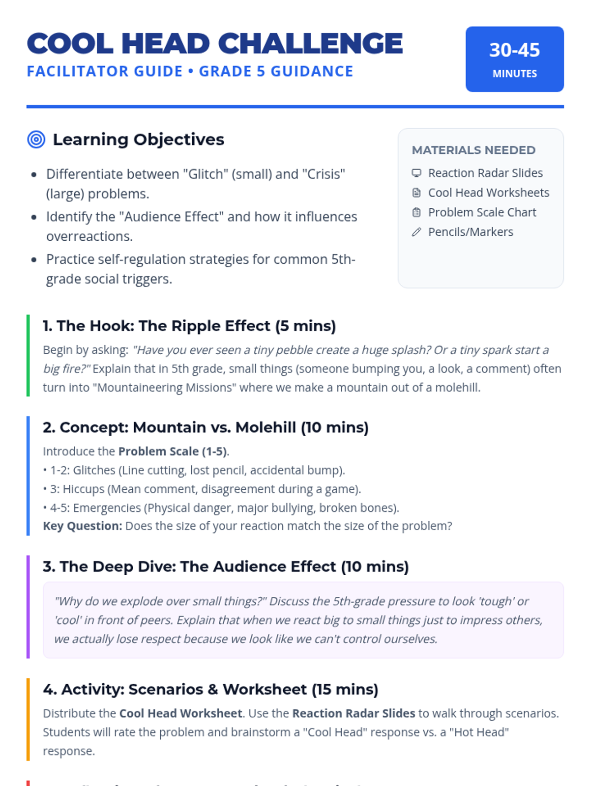 A guidance lesson for 5th graders focused on distinguishing between small and large problems, managing overreactions, and understanding the social pressure to 'prove' oneself in front of peers.