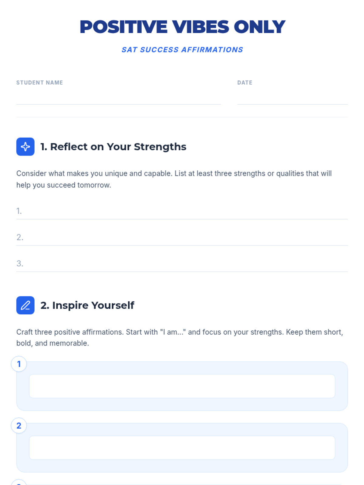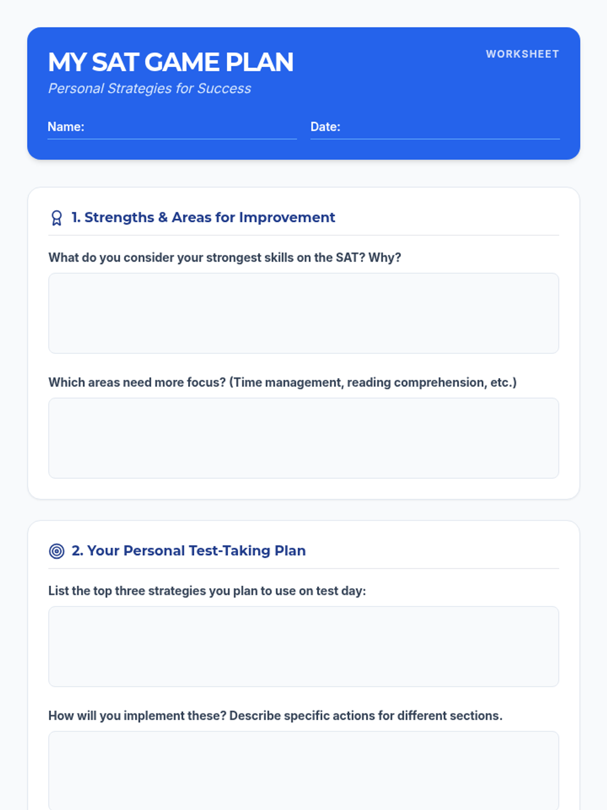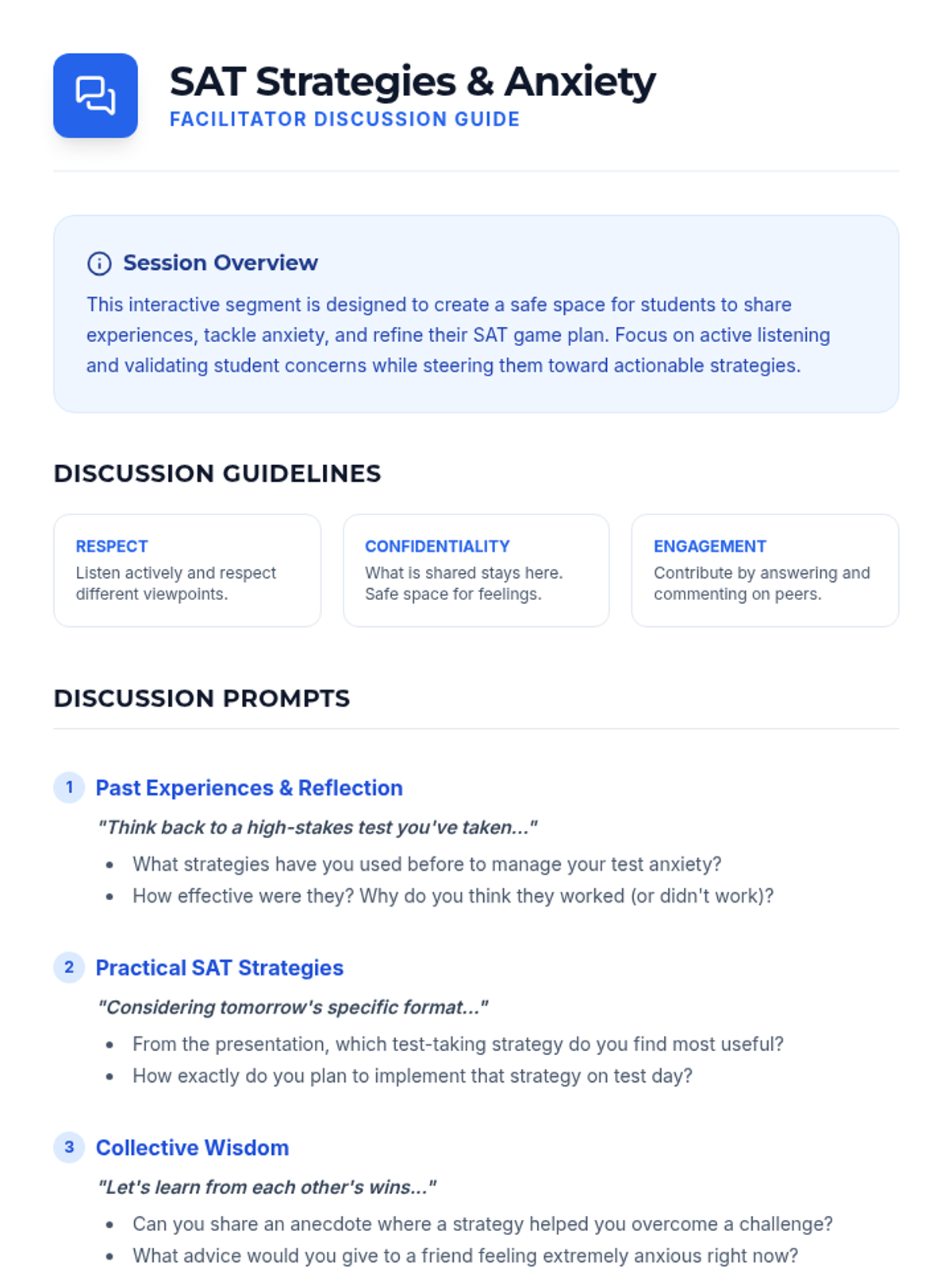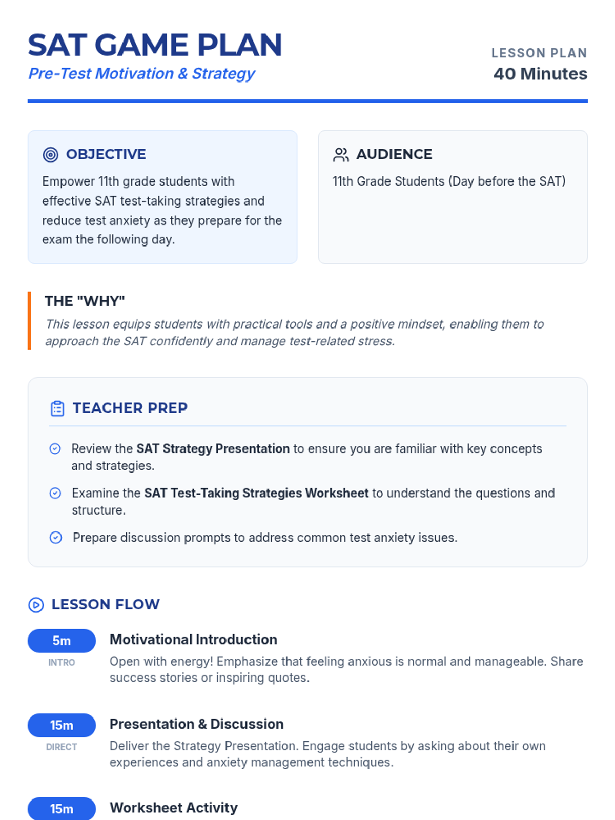 A high-energy, motivational lesson for 11th graders the day before the SAT, focusing on practical test-taking strategies and anxiety management techniques.