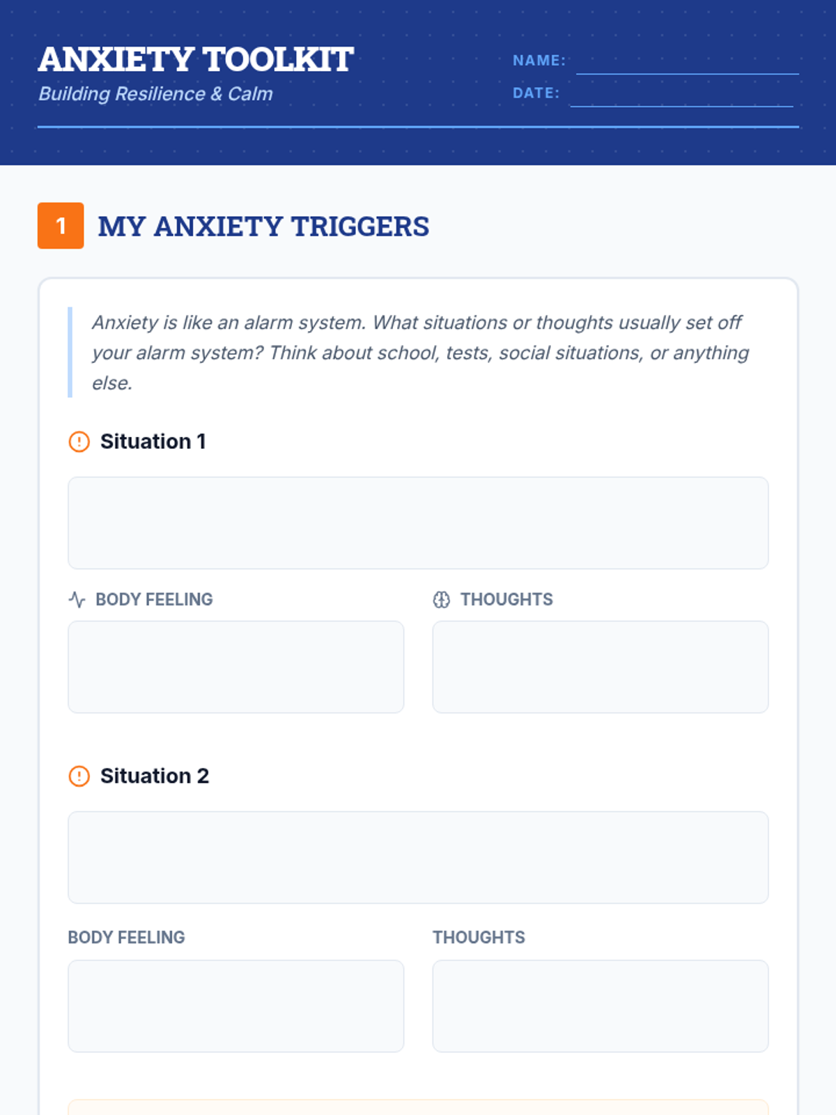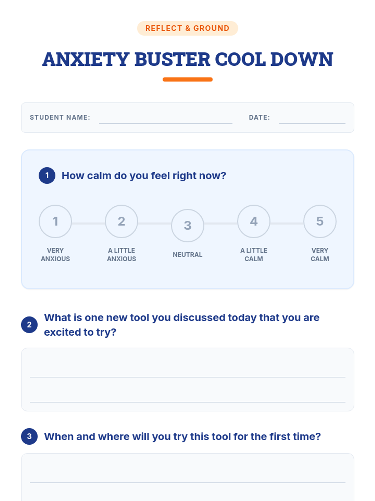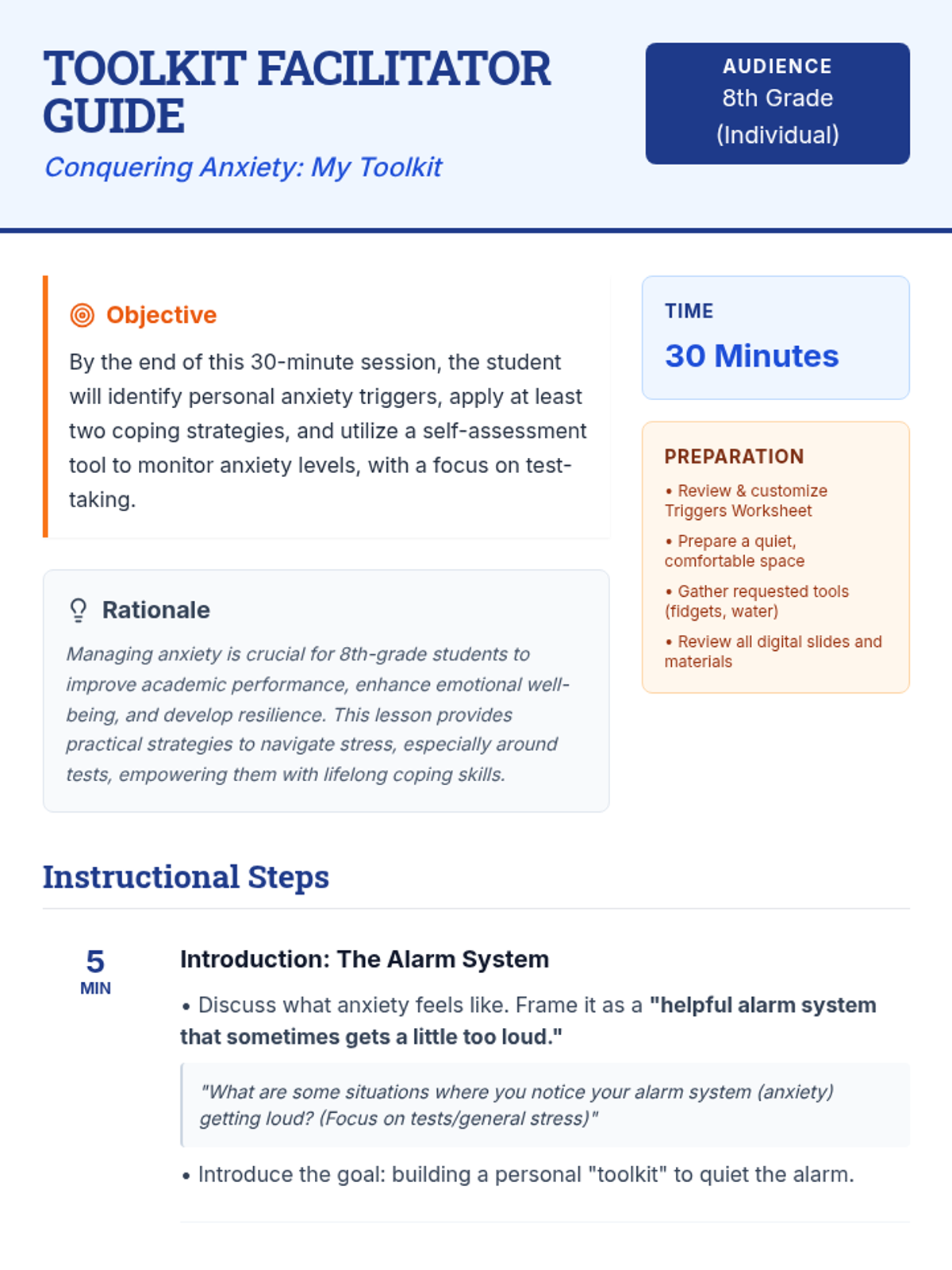 This individual lesson provides an 8th-grade student with strategies and tools to identify, manage, and reduce general and test-taking anxiety through personalized coping mechanisms.