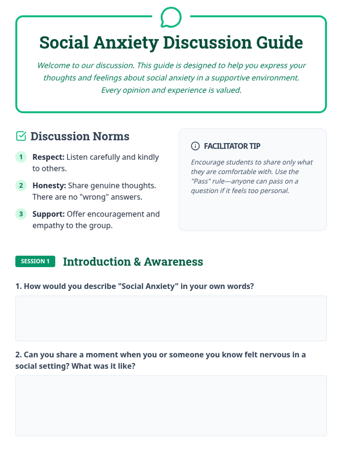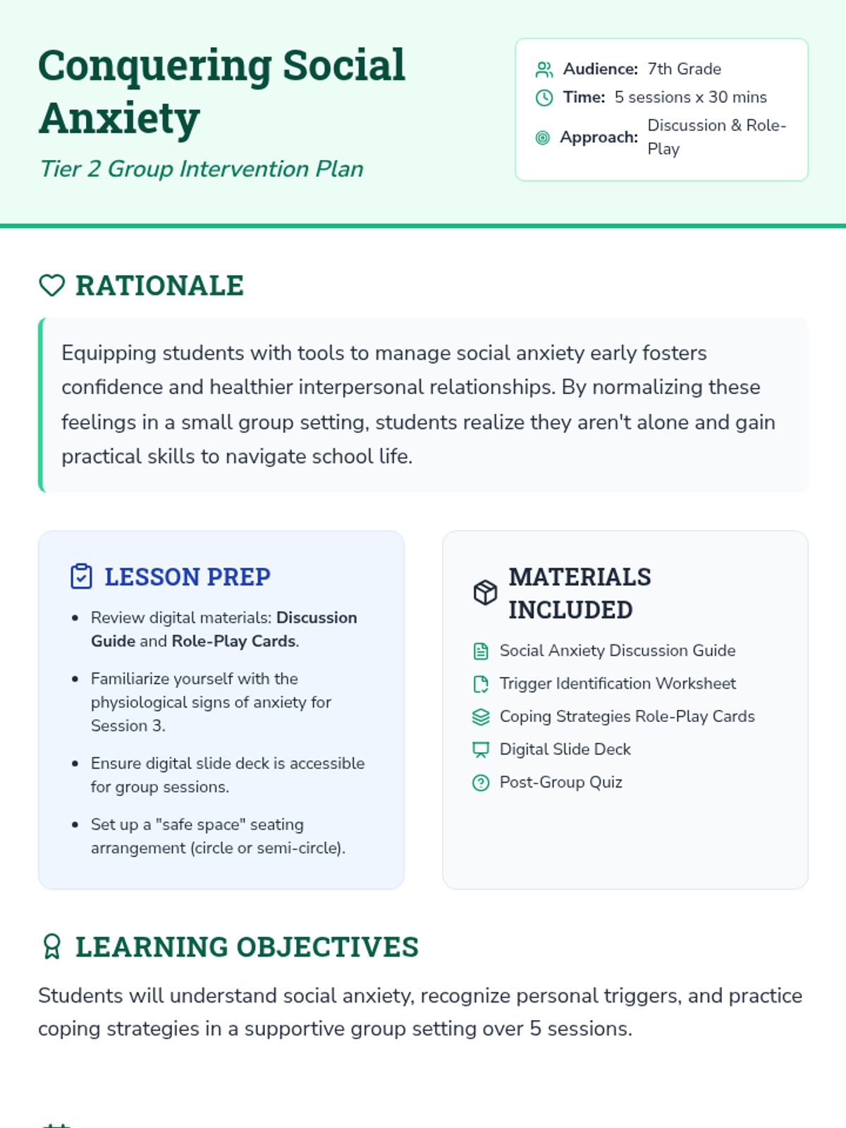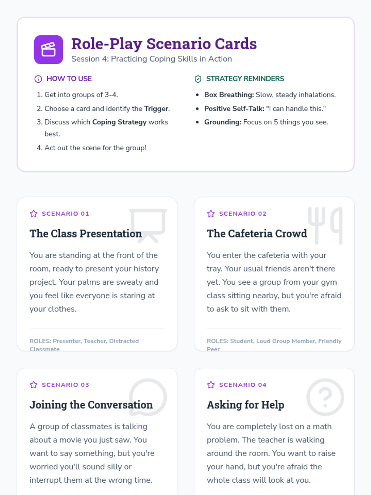 A 5-session comprehensive program for 7th graders to understand, identify, and manage social anxiety through group discussion and role-play.