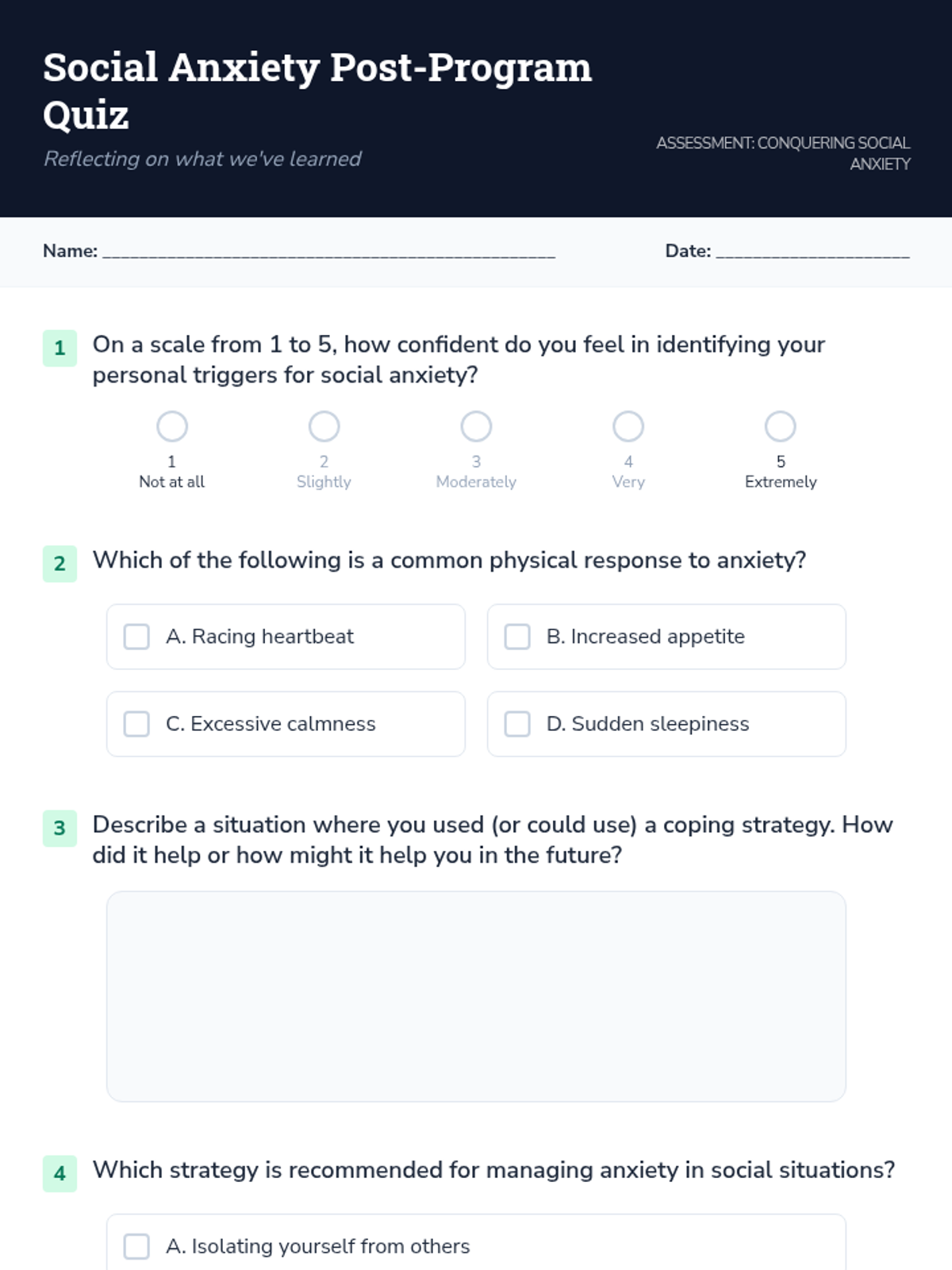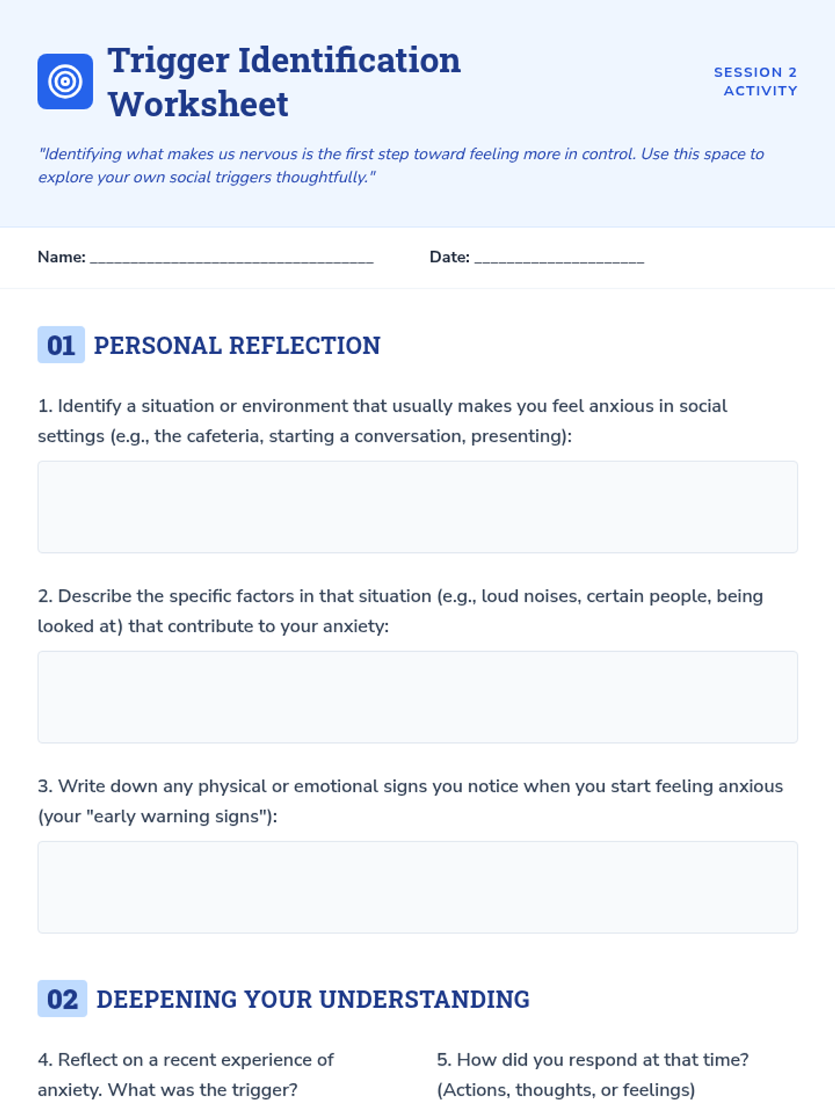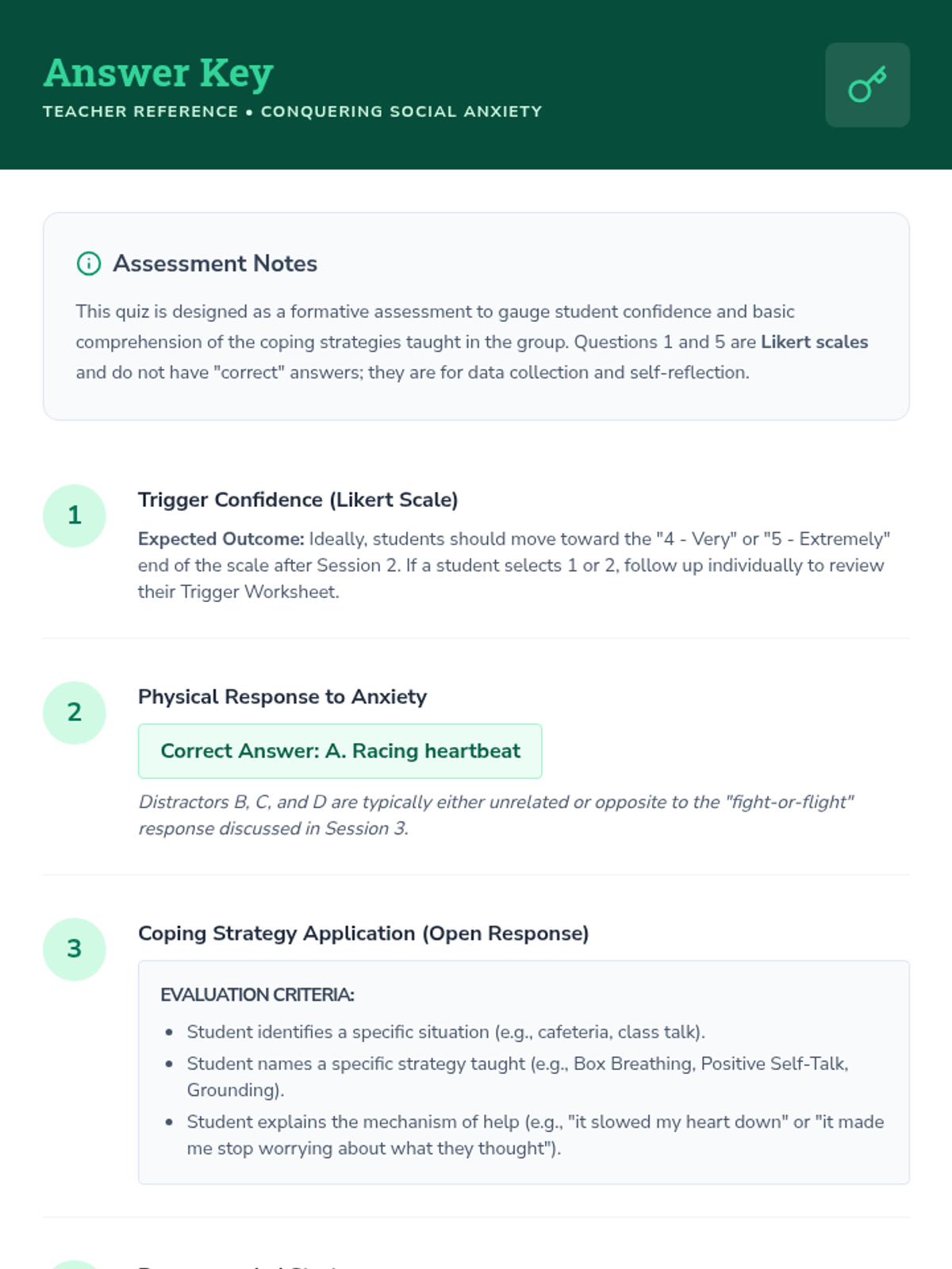 A 5-session comprehensive program for 7th graders to understand, identify, and manage social anxiety through group discussion and role-play.