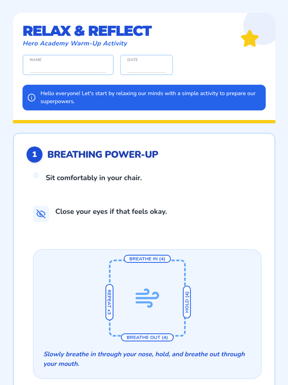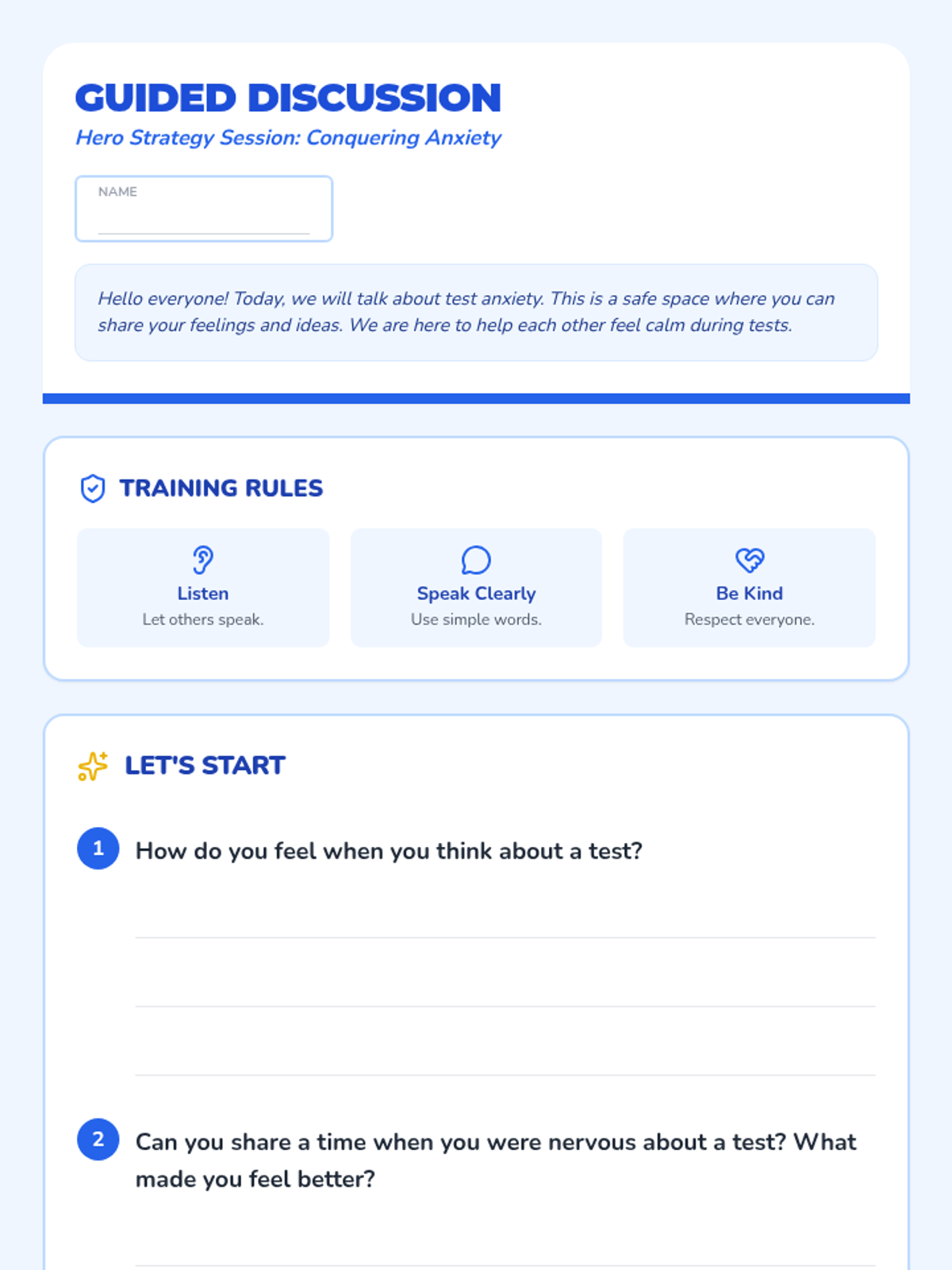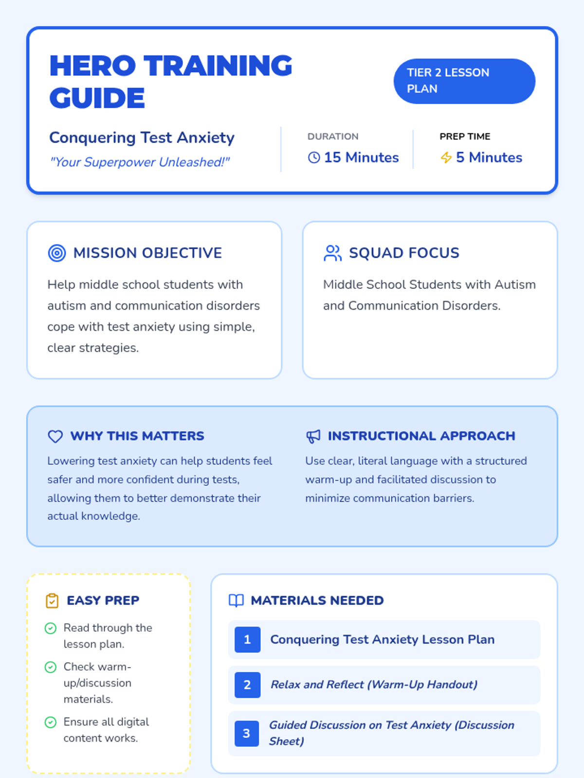 A 15-minute Tier 2 group lesson designed for middle school special education students to manage test anxiety through breathing exercises, positive affirmations, and guided discussion. This lesson empowers students with practical 'superpower' strategies to stay calm and focused.