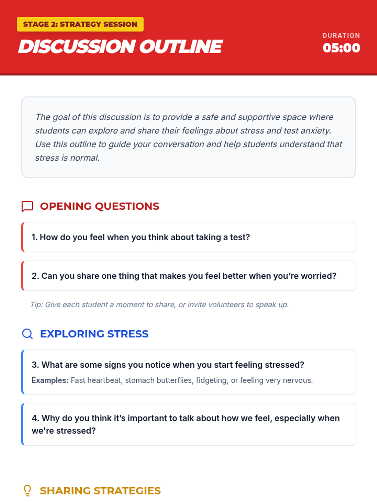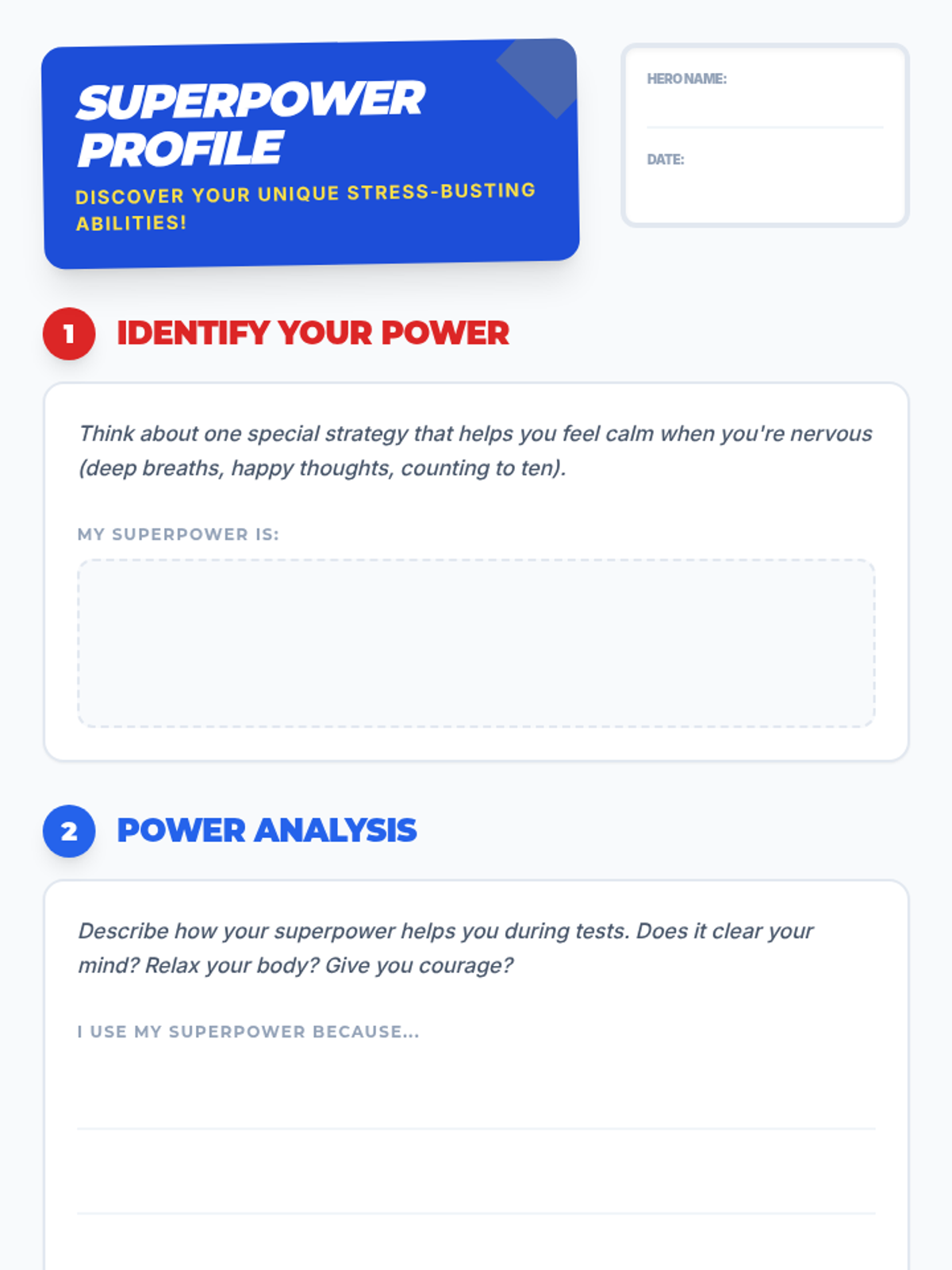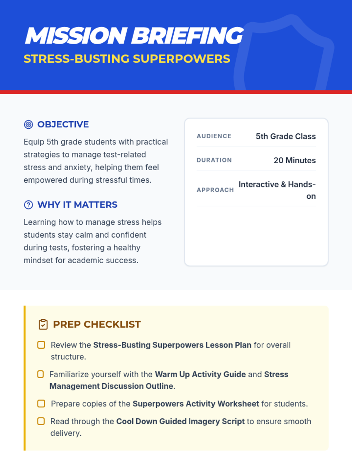 A 20-minute session designed to equip 5th graders with practical stress-management strategies for test anxiety using a superhero theme.