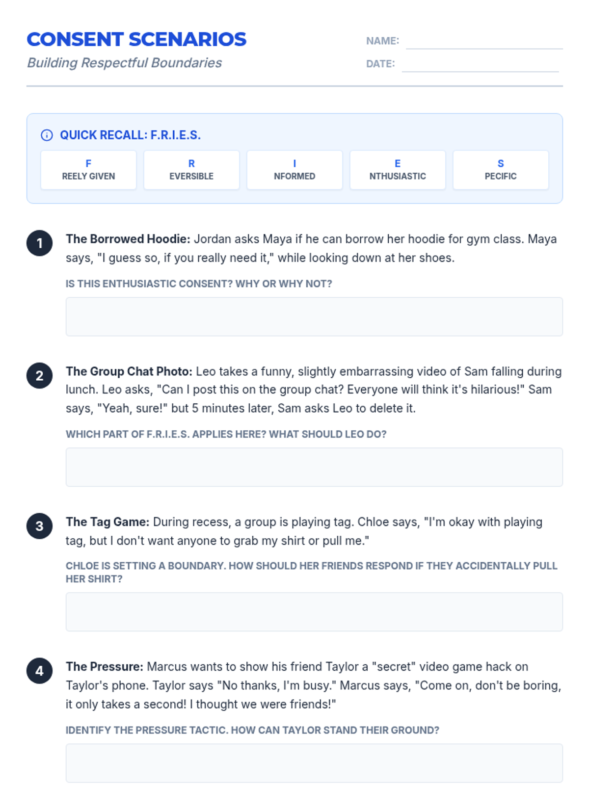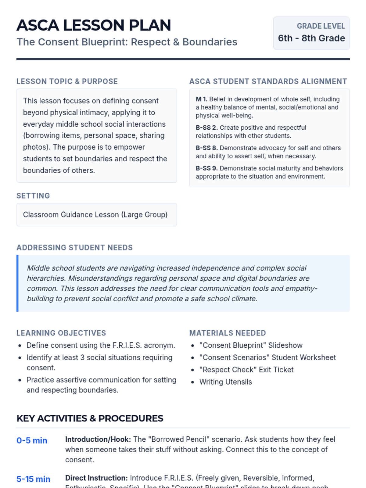 A comprehensive school counseling lesson for grades 6-8 focused on understanding and practicing consent in social and personal contexts, aligned with ASCA standards.