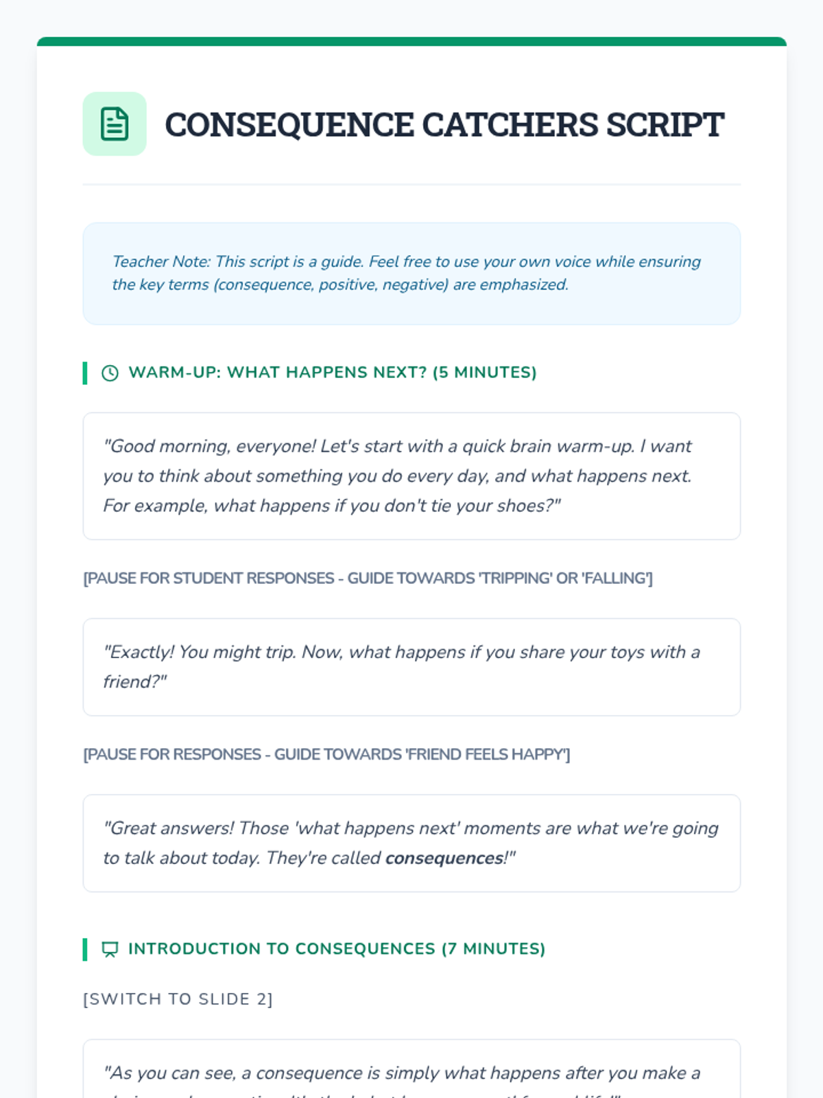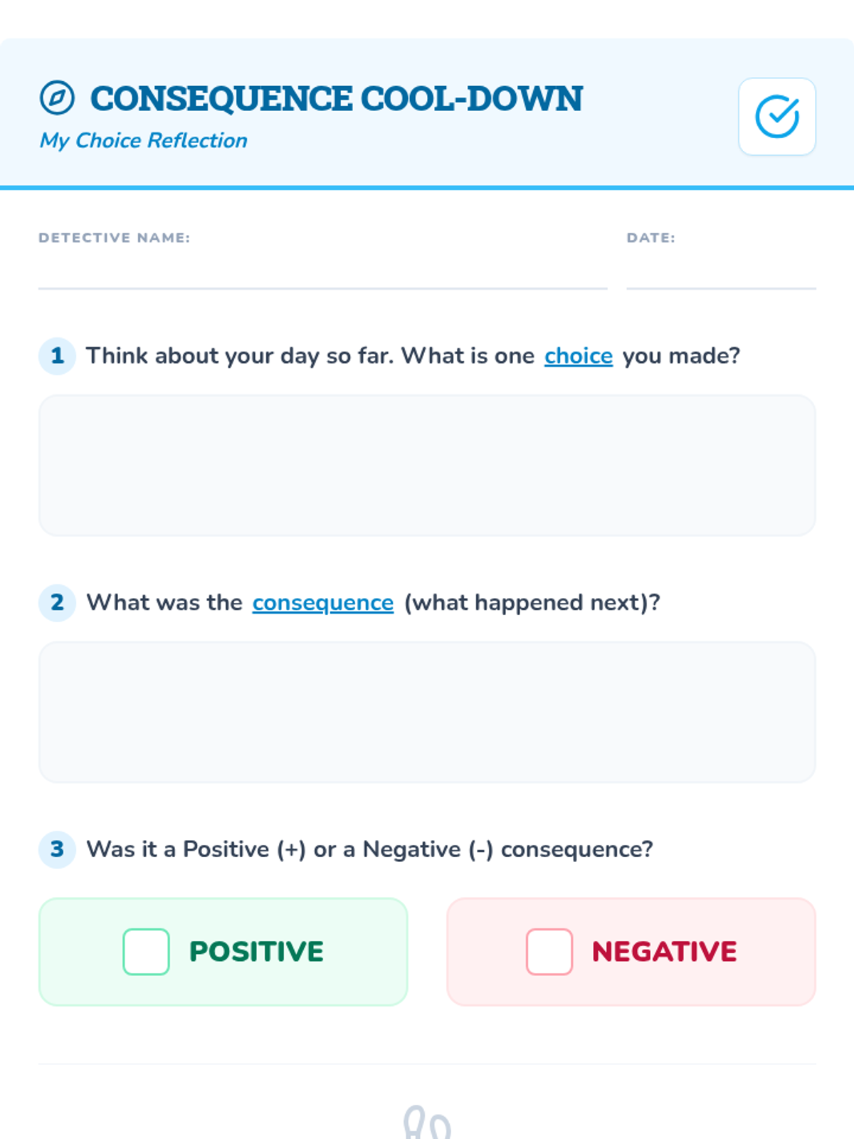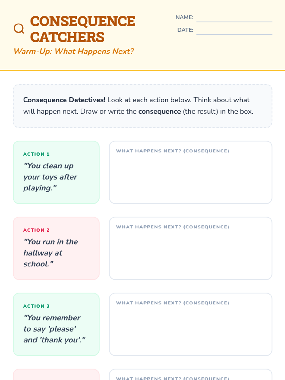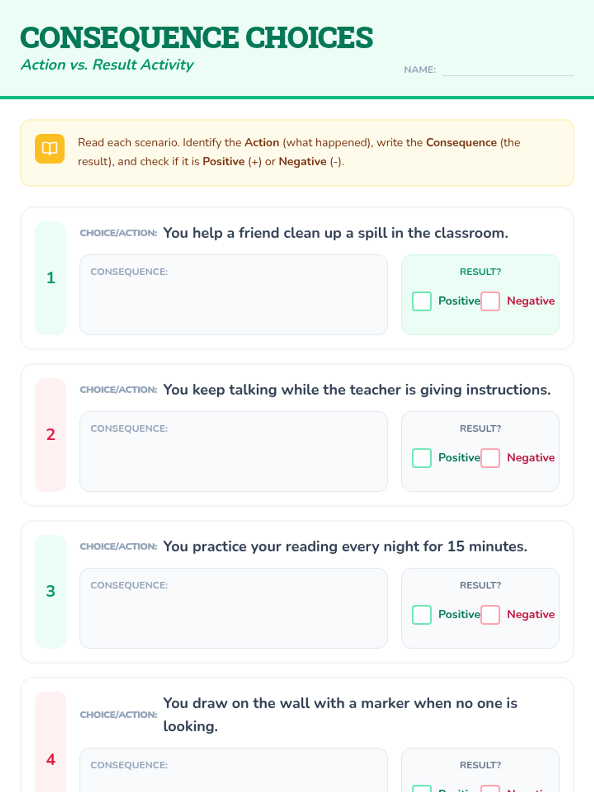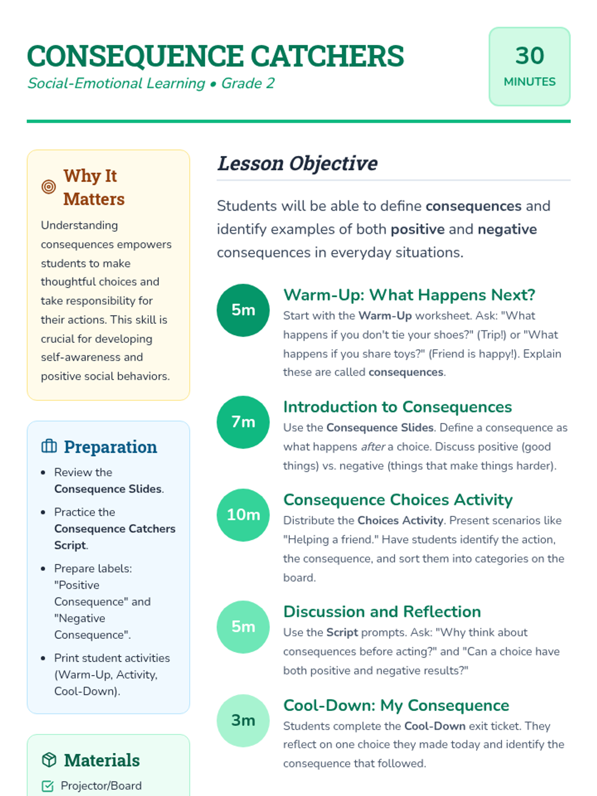 A social-emotional learning lesson for 2nd graders to understand positive and negative consequences and how their choices lead to them.