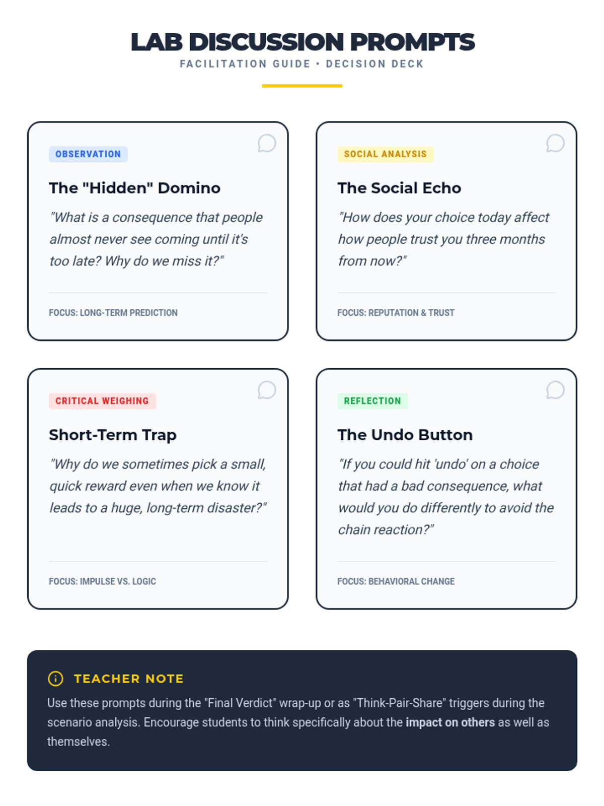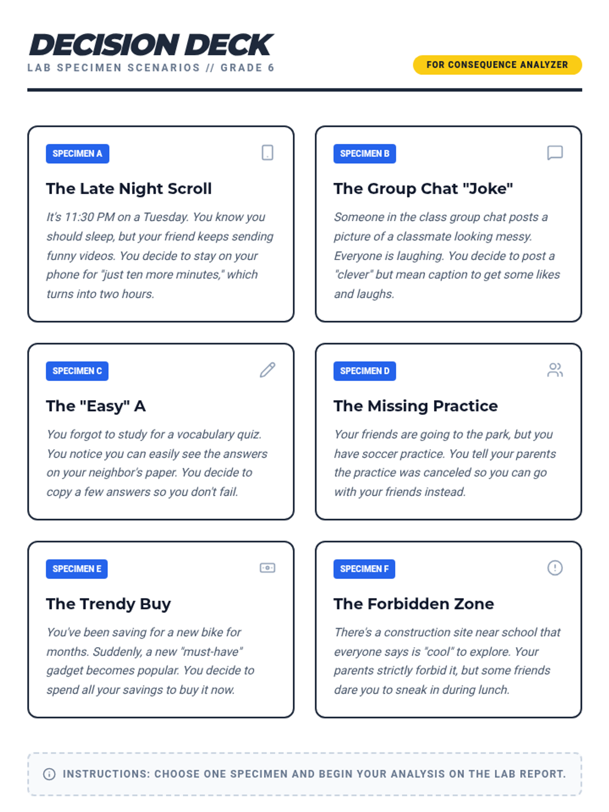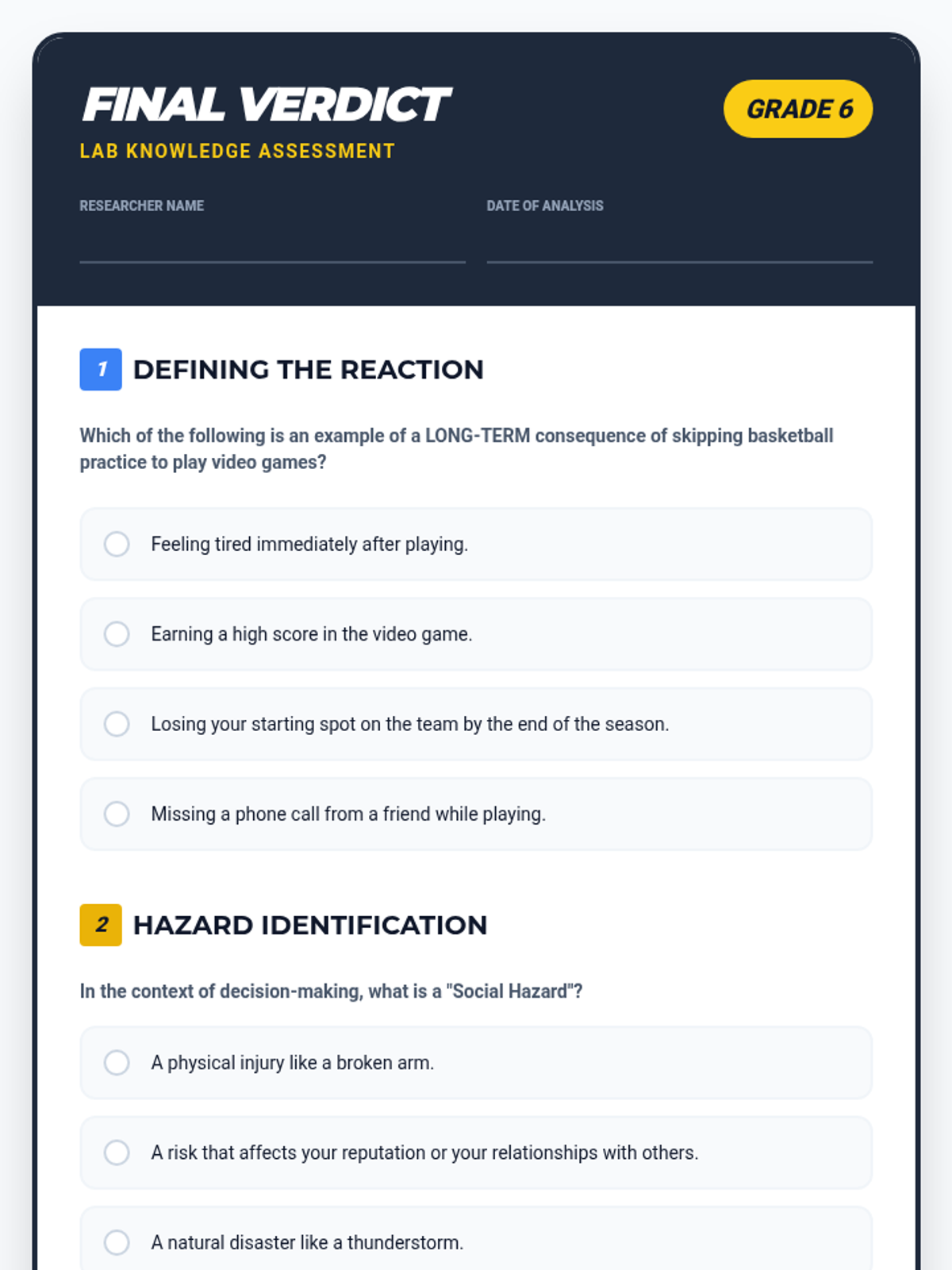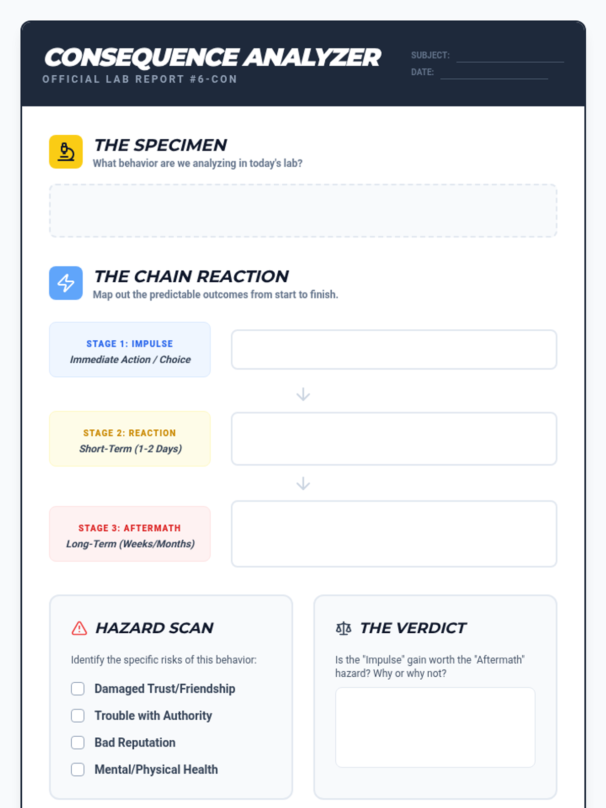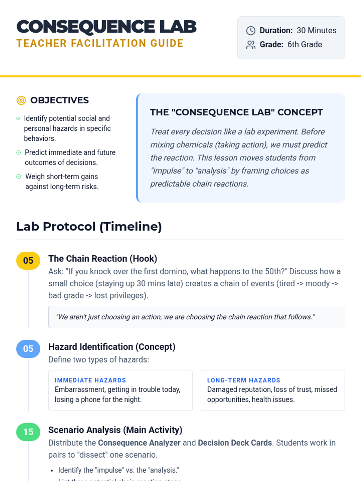 A 30-minute interactive lesson focused on identifying hazards and predicting short-term and long-term consequences for 6th graders. Students use a 'Consequence Lab' framework to analyze personal and social scenarios.