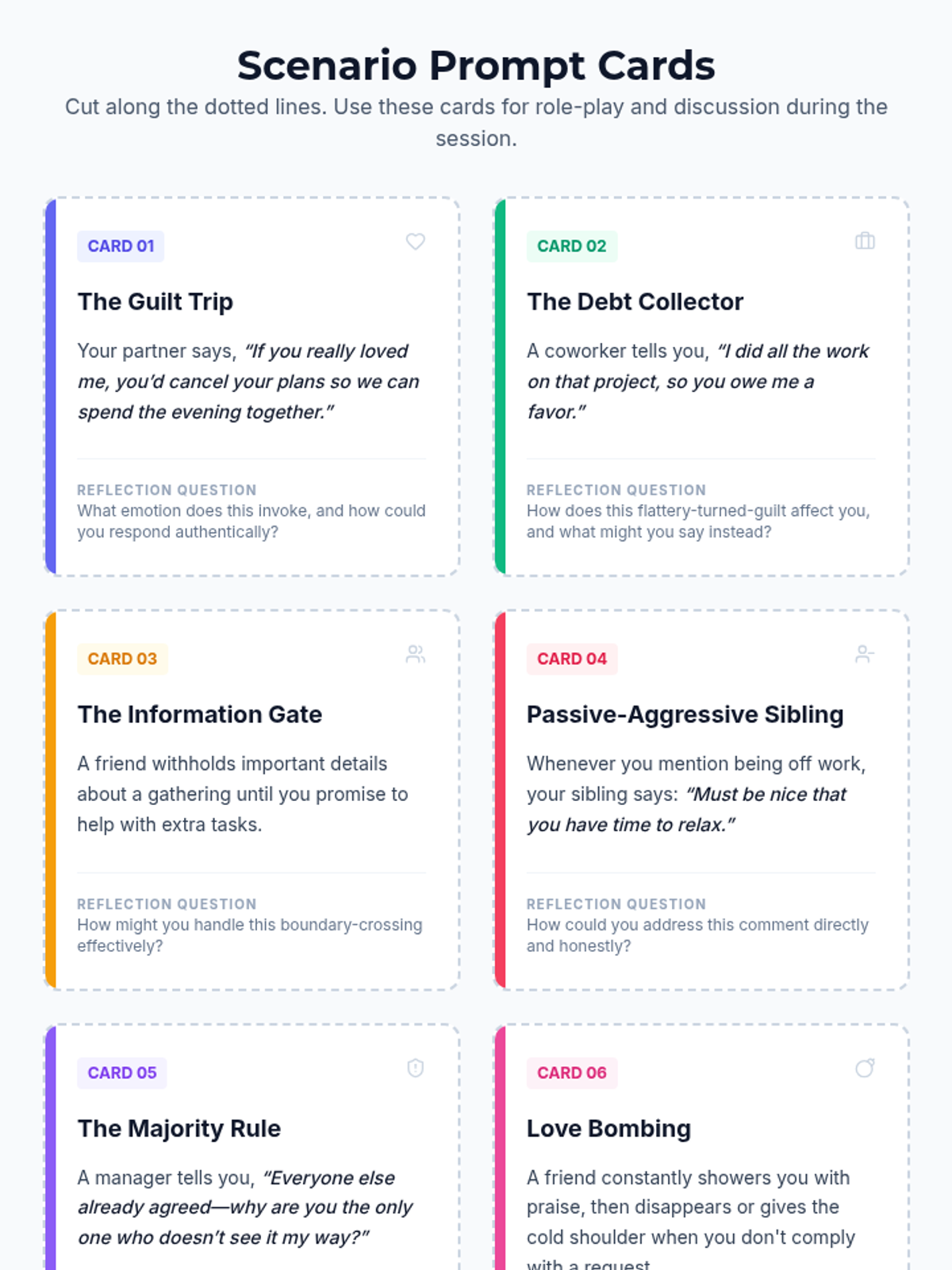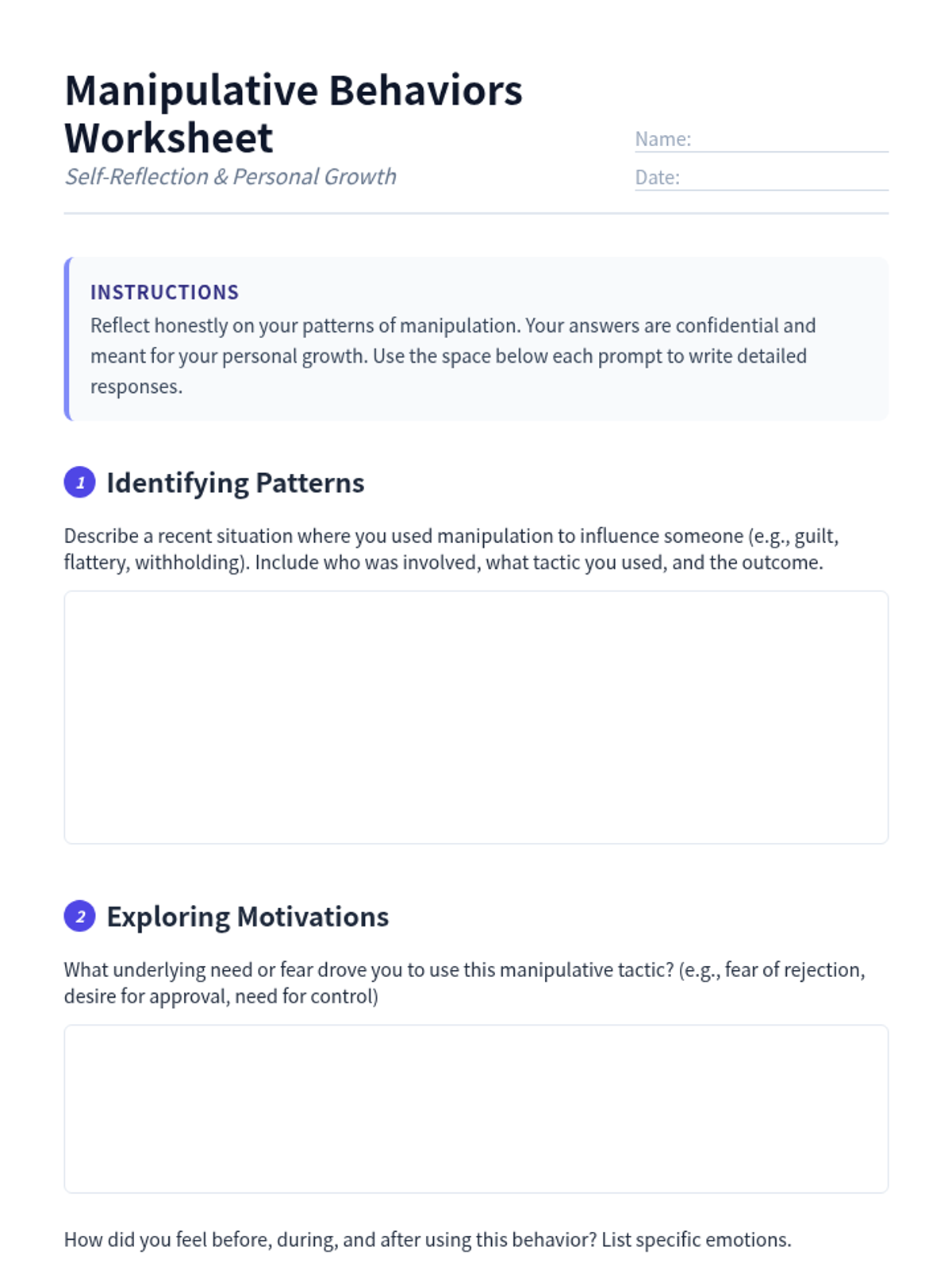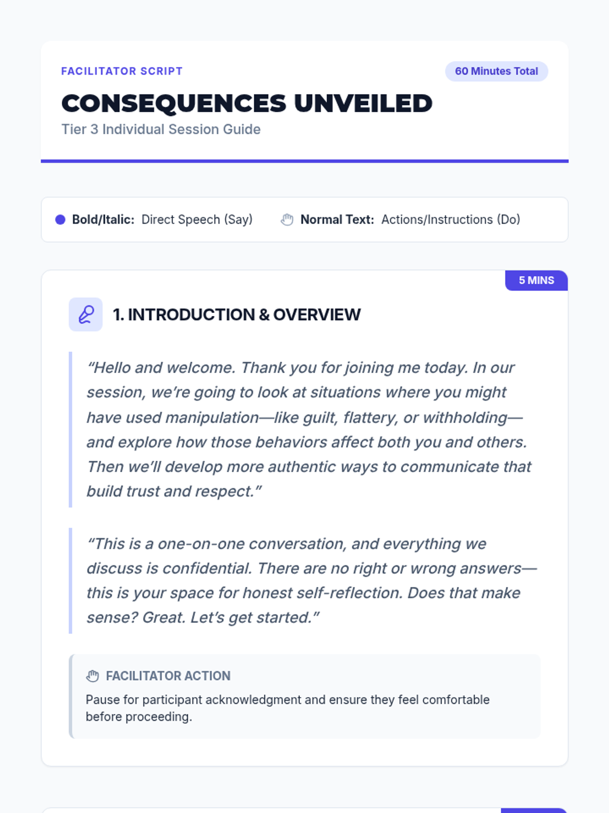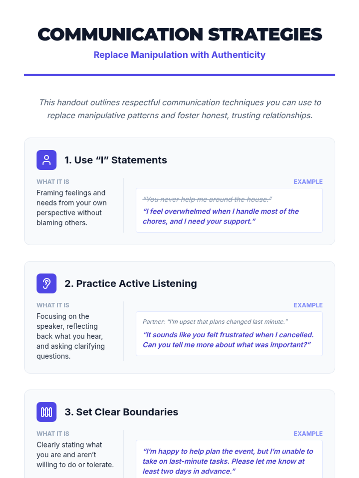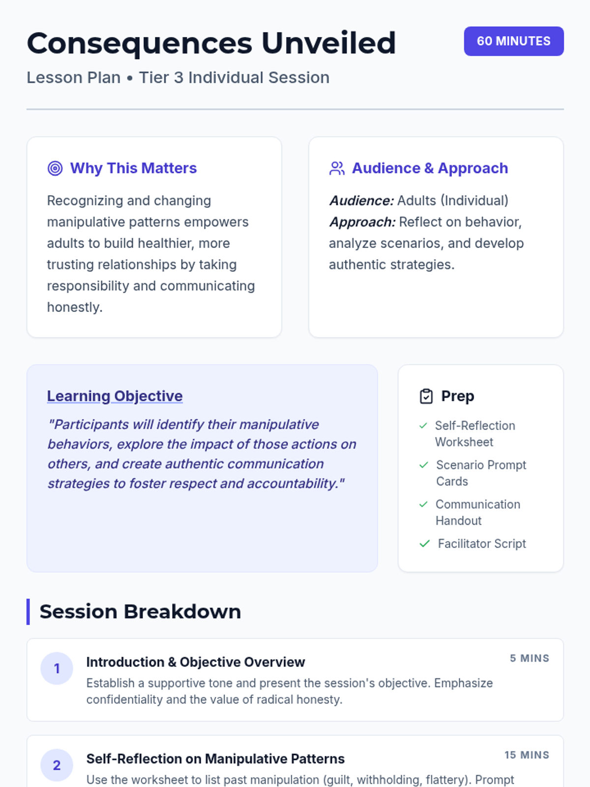A 60-minute individual Tier 3 session for adults focused on identifying manipulative behaviors, understanding their impact, and practicing authentic communication strategies to build healthier relationships.