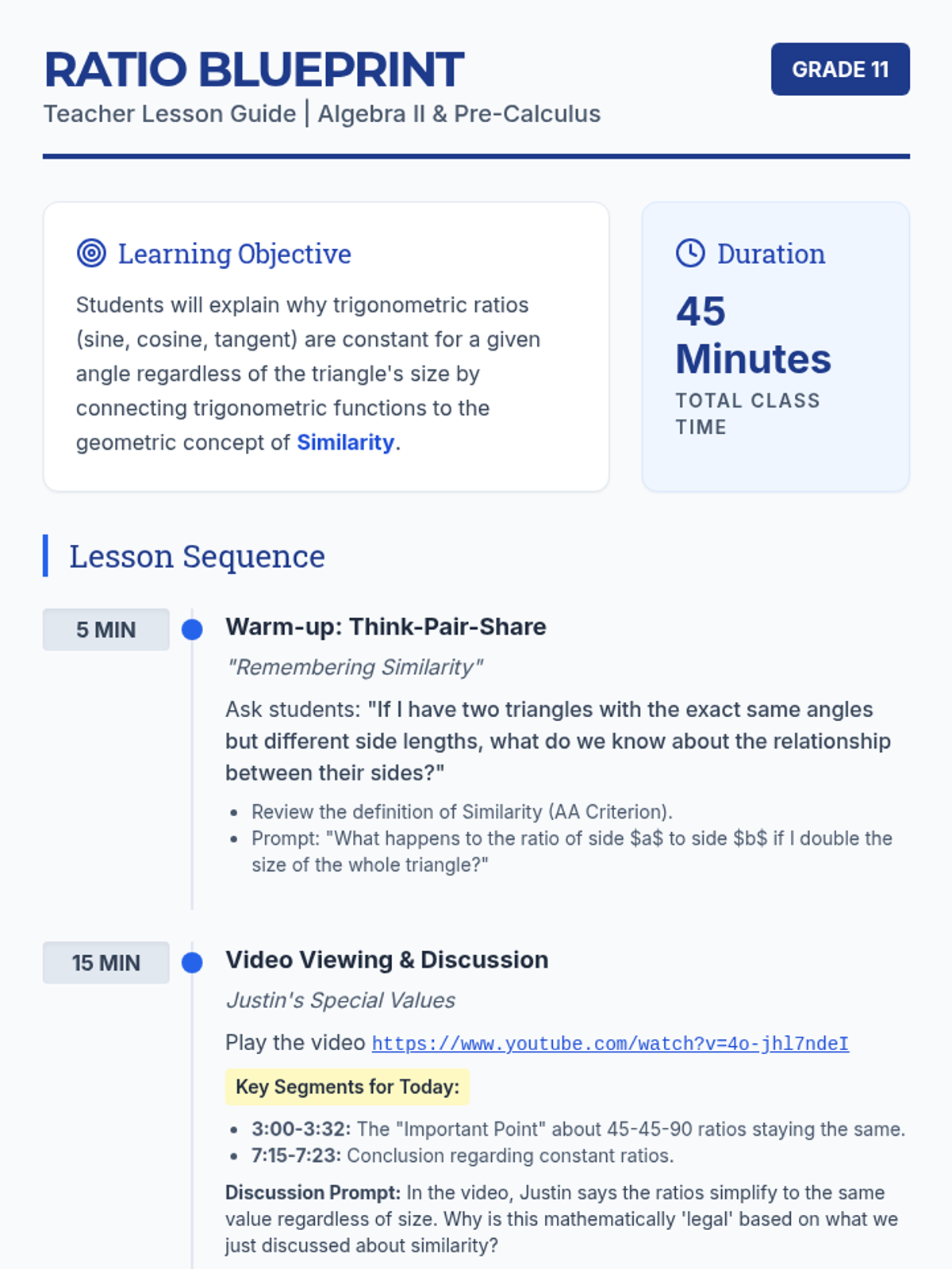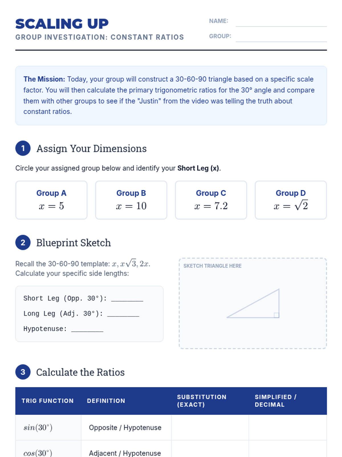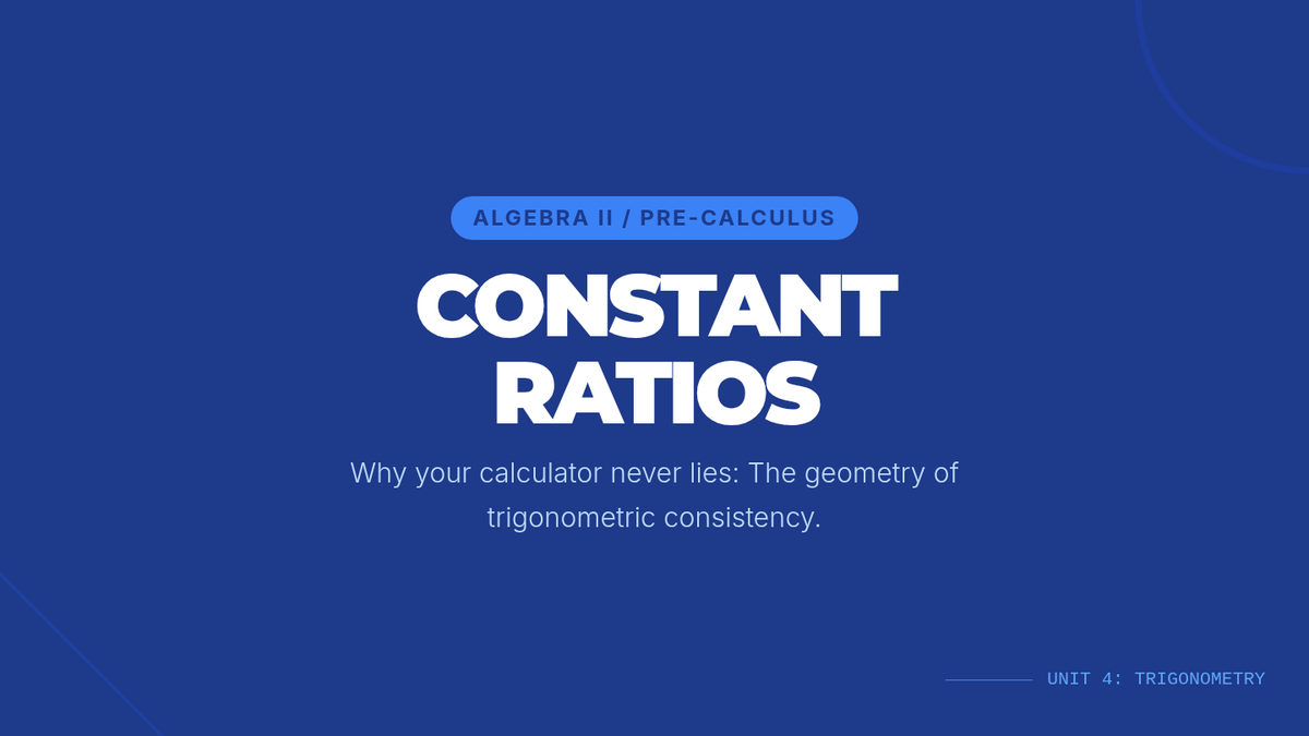 In this Algebra II/Pre-Calculus lesson, students explore the geometric foundations of trigonometry by proving that trigonometric ratios remain constant across similar triangles. Through a combination of video analysis and a hands-on 'Scaling Up' group activity, students connect Geometry's similar triangles to Algebra's constant functions.
