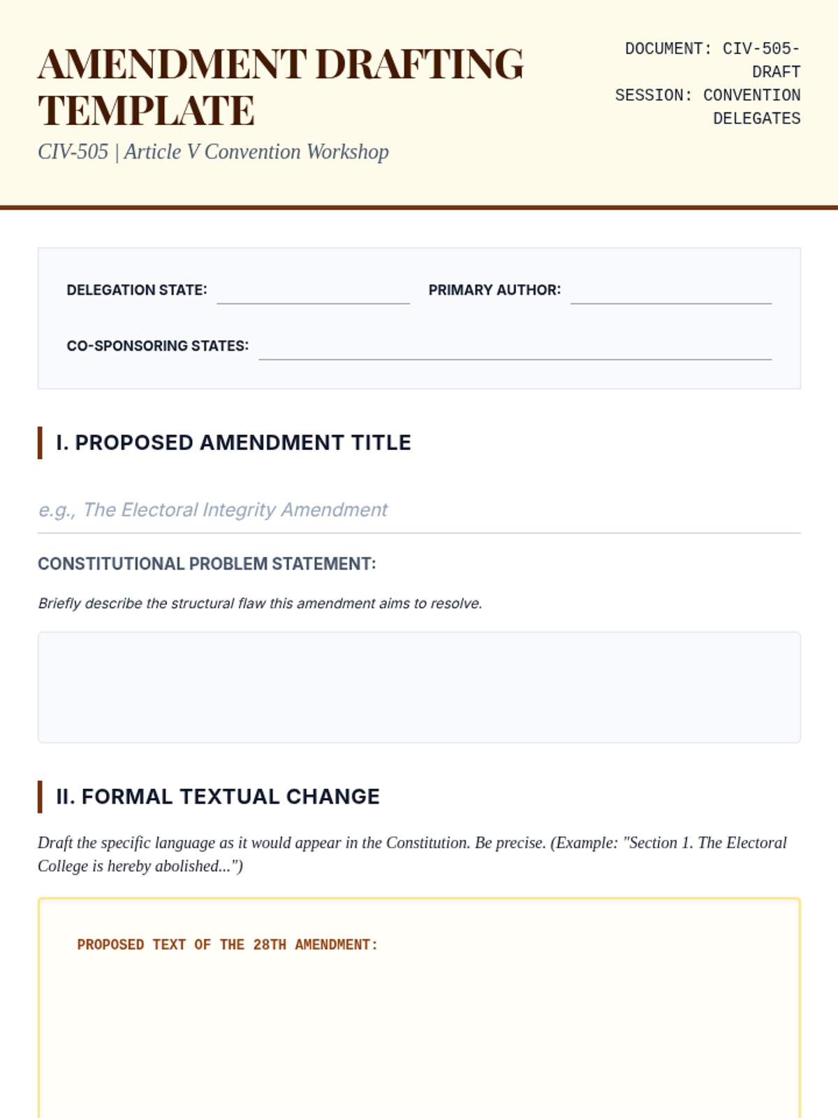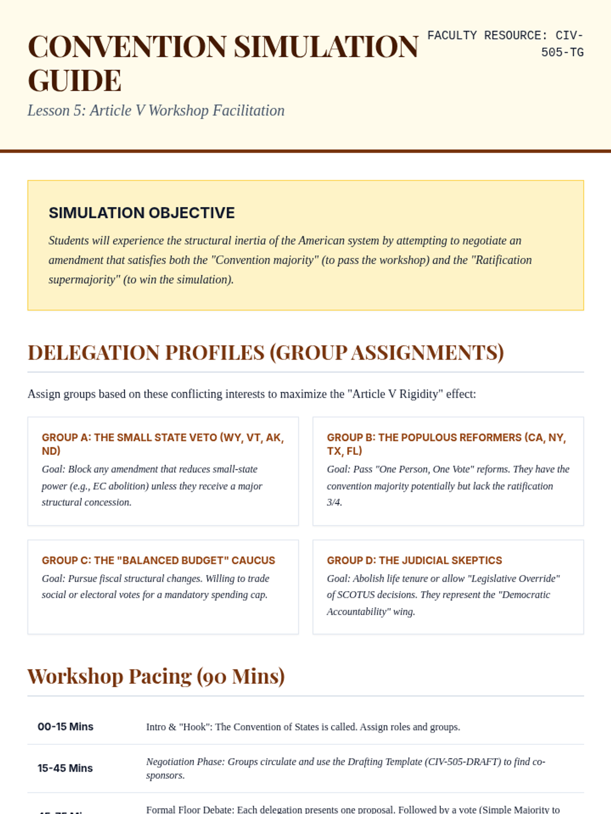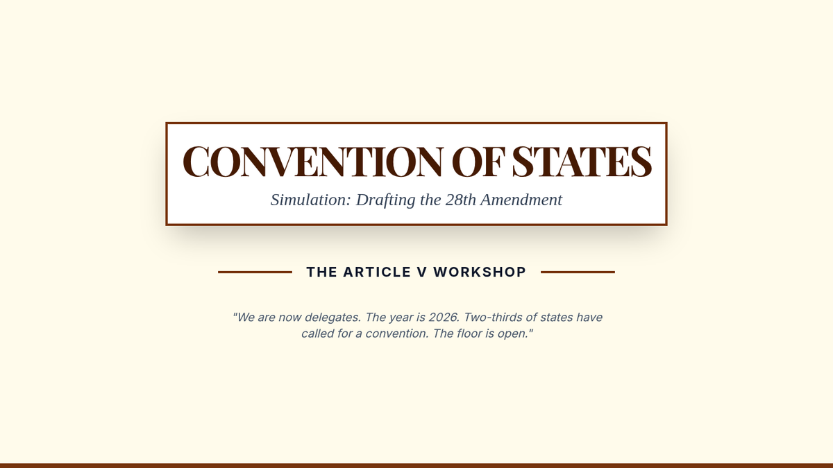 A simulation workshop where students act as delegates to a modern Article V convention to draft and negotiate structural reforms.