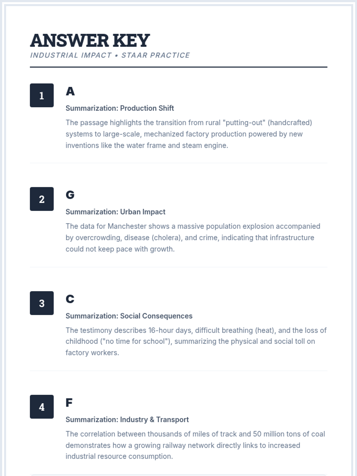 A short practice session focused on analyzing the Industrial Revolution through STAAR-style summarization questions, covering urbanization, technology, and social changes.