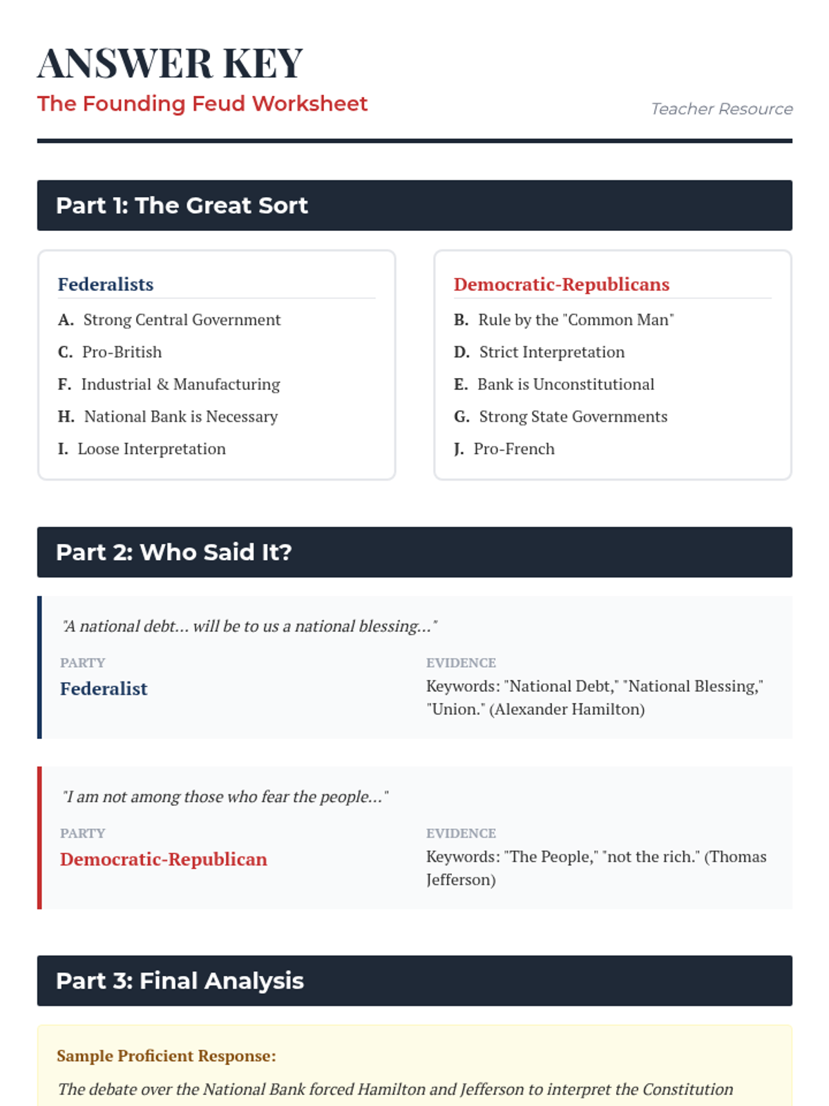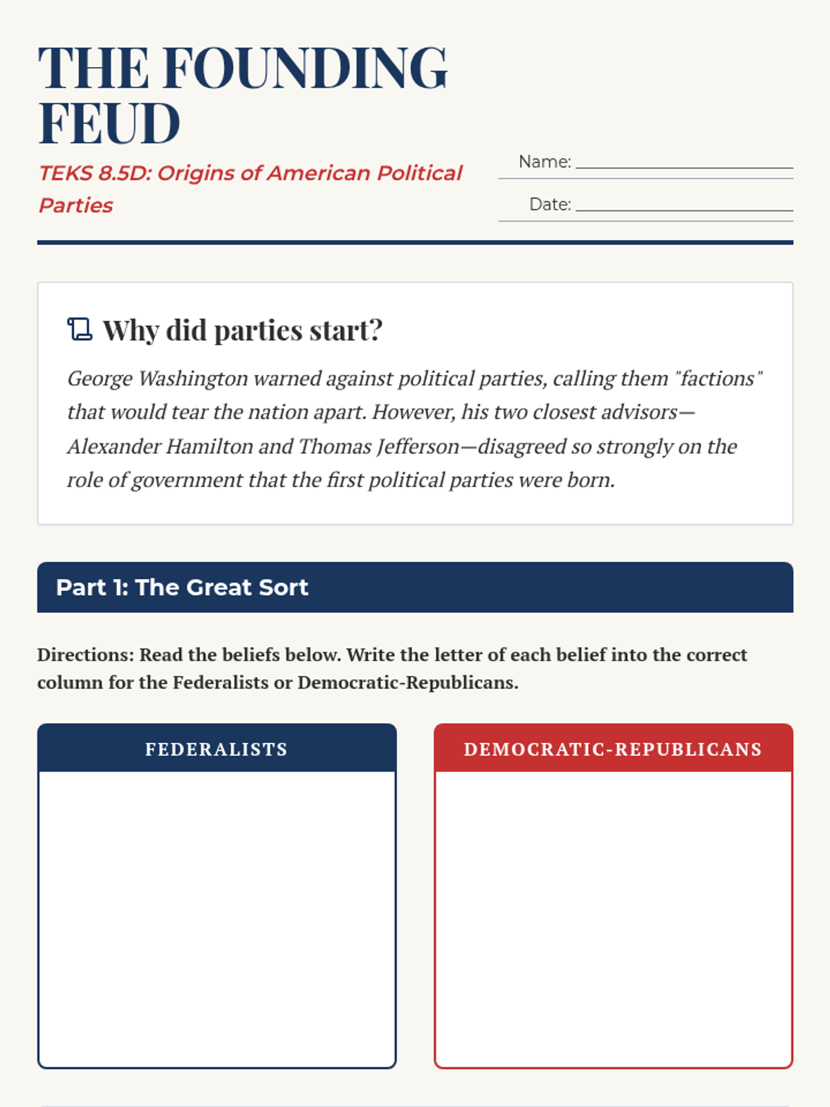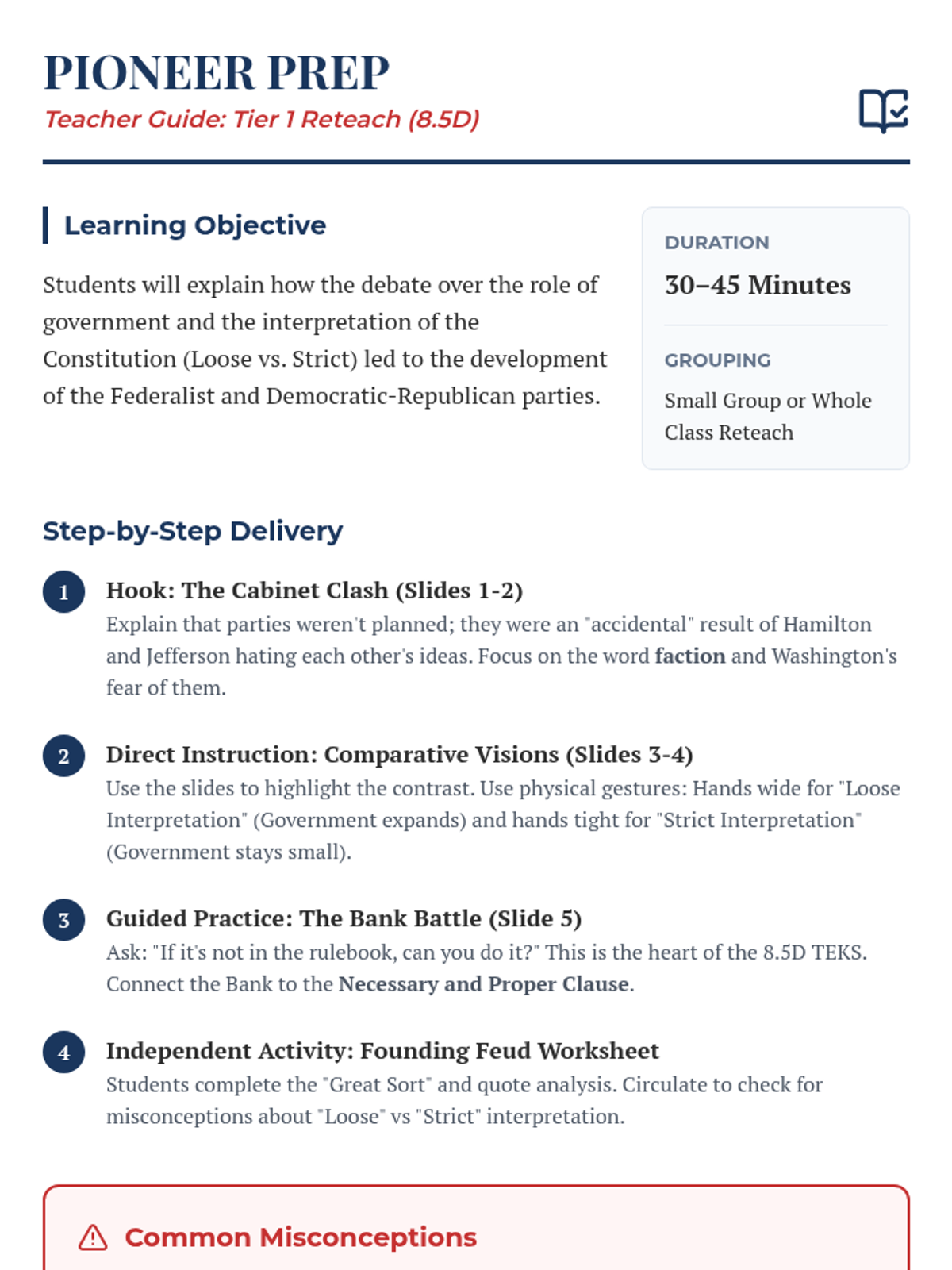 A Tier 1 reteach lesson focused on the origins and development of the first American political parties, comparing the visions of Alexander Hamilton and Thomas Jefferson.