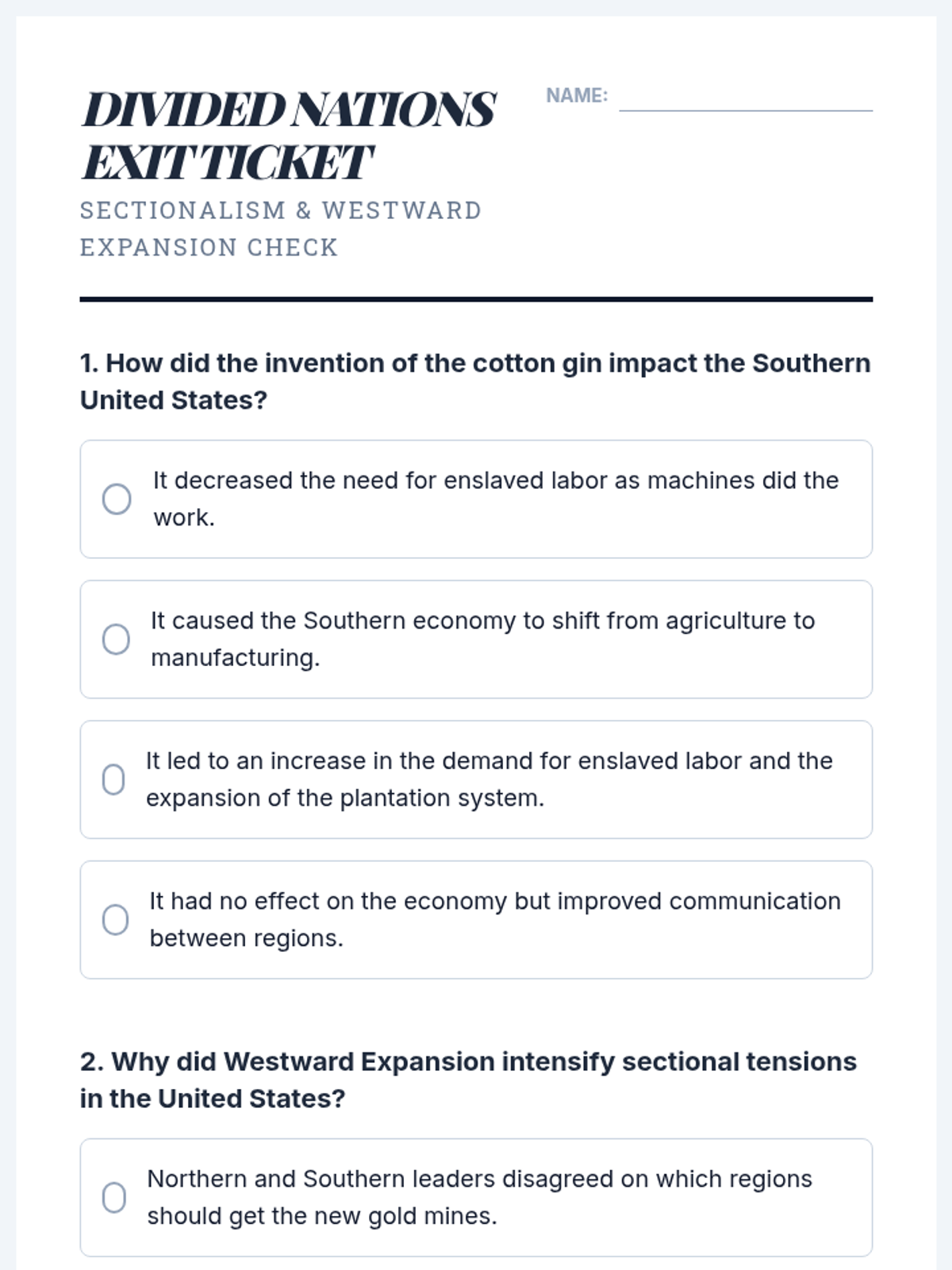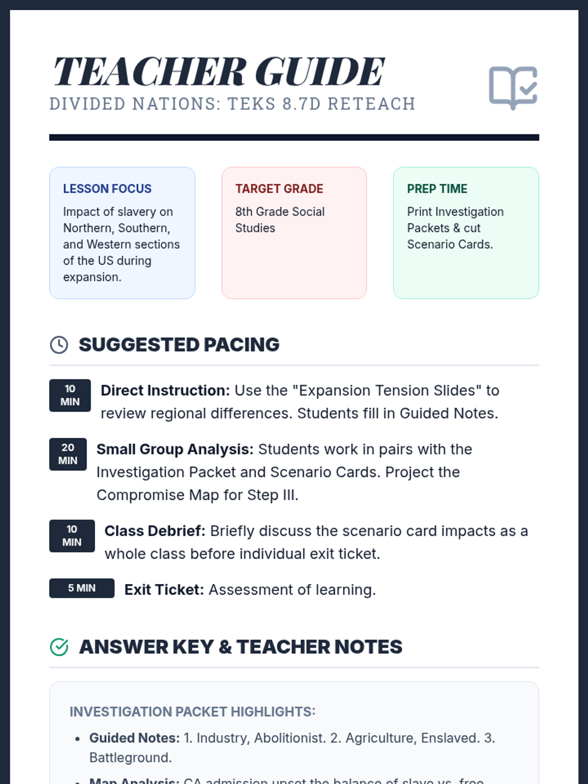 A Tier I reteach lesson focusing on the economic and social impacts of slavery across the North, South, and West during the era of Westward Expansion. Students analyze primary sources and maps to understand how territorial growth intensified sectional tensions.