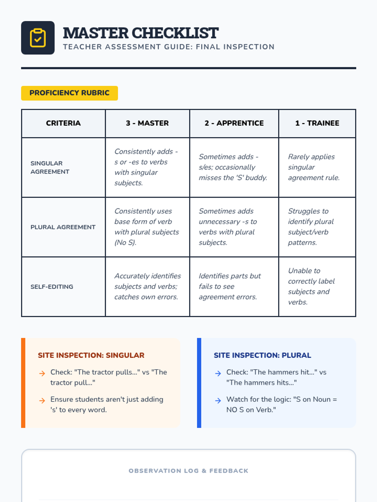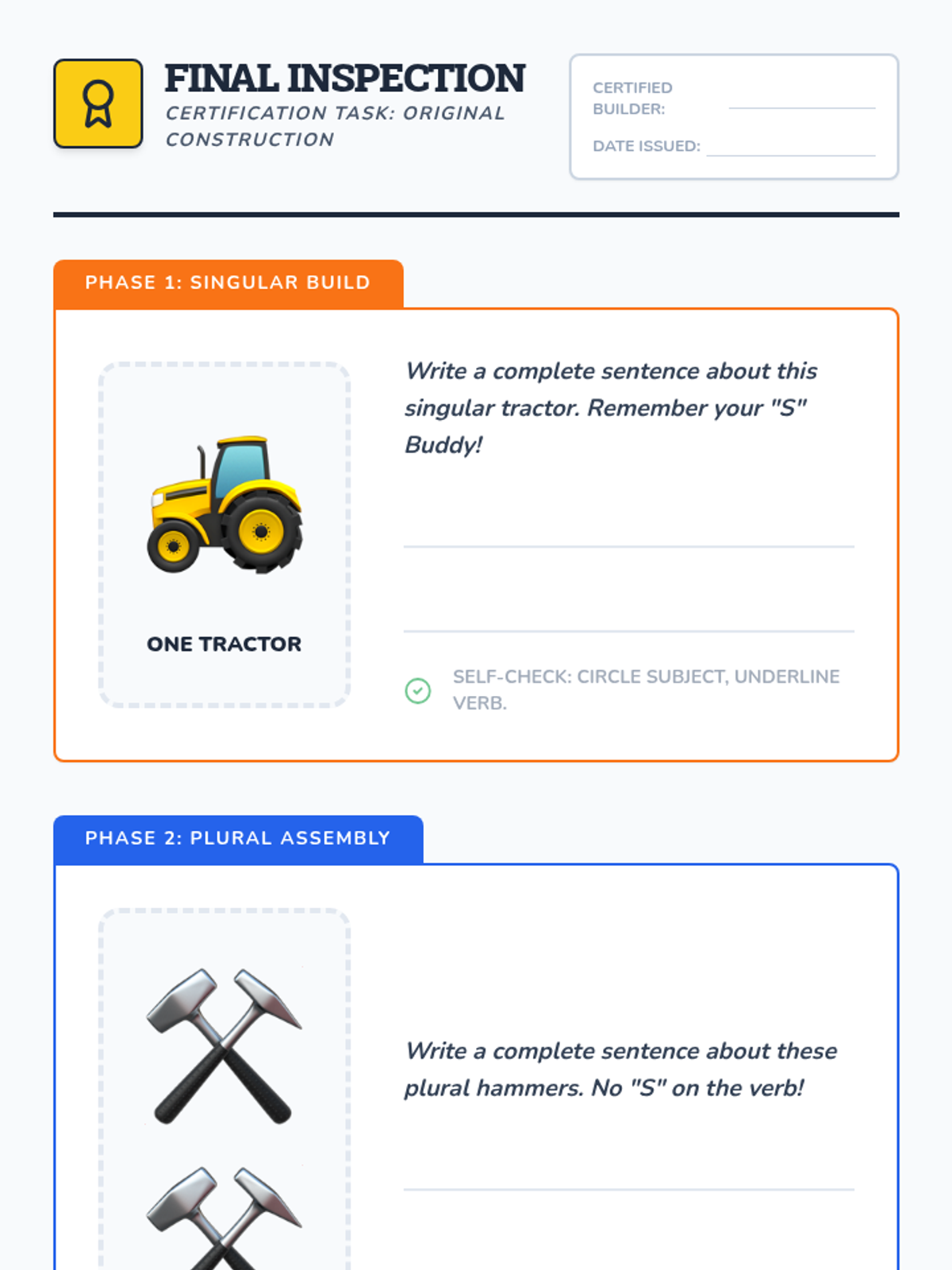 Students apply their knowledge by writing original sentences using provided image prompts. They practice self-checking their work by circling the subject and underlining the verb to ensure they agree.