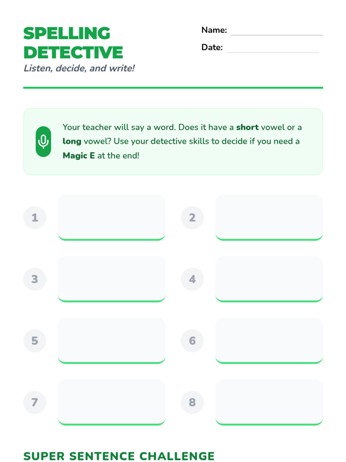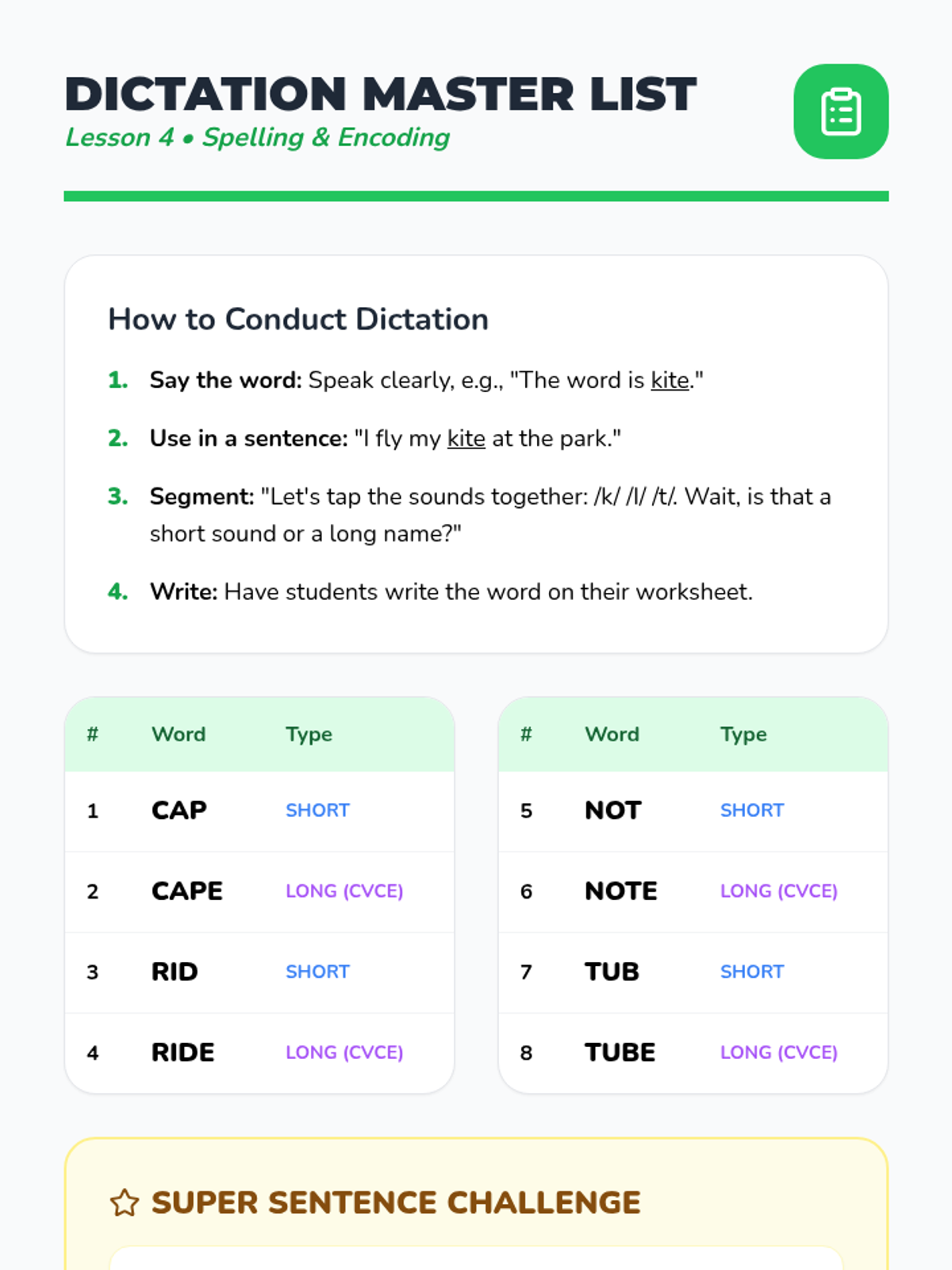 Students practice encoding (spelling) CVCe words, deciding when to apply the silent 'e' rule based on the vowel sound.
