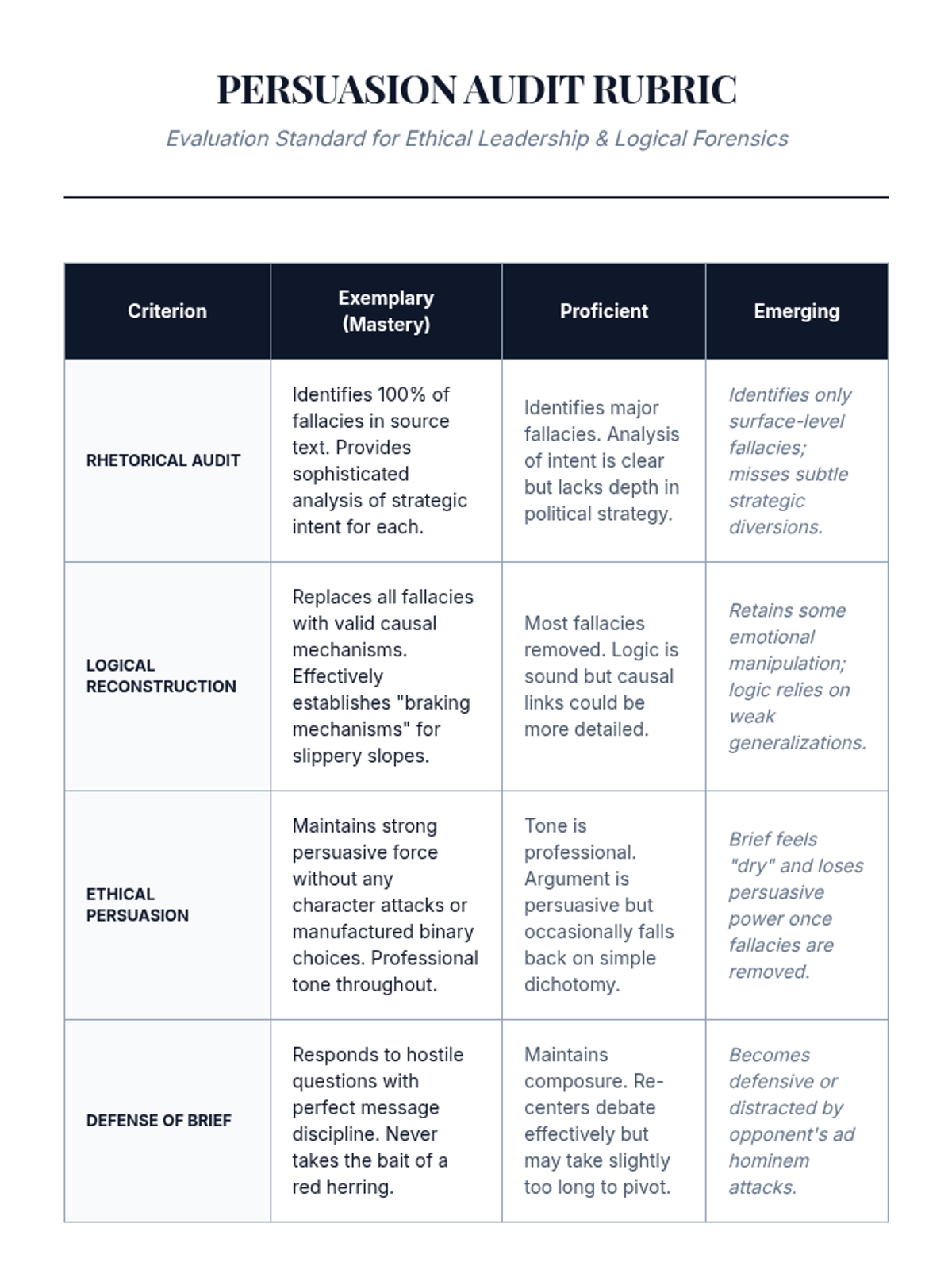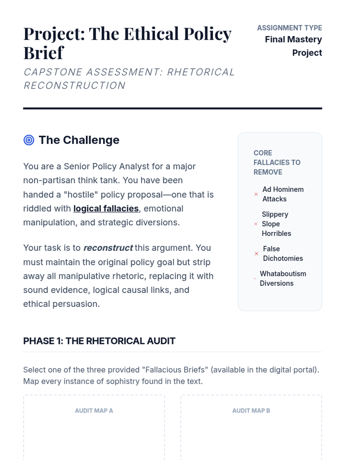 Synthesize learning by constructing an ethically sound policy brief that avoids fallacious reasoning while maintaining persuasive power.
