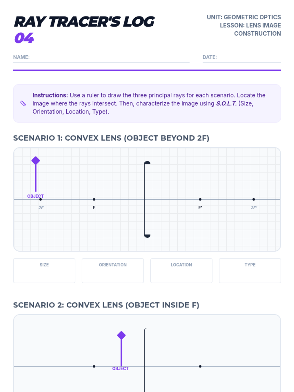 Students learn ray tracing techniques to determine image characteristics for convex and concave lenses.