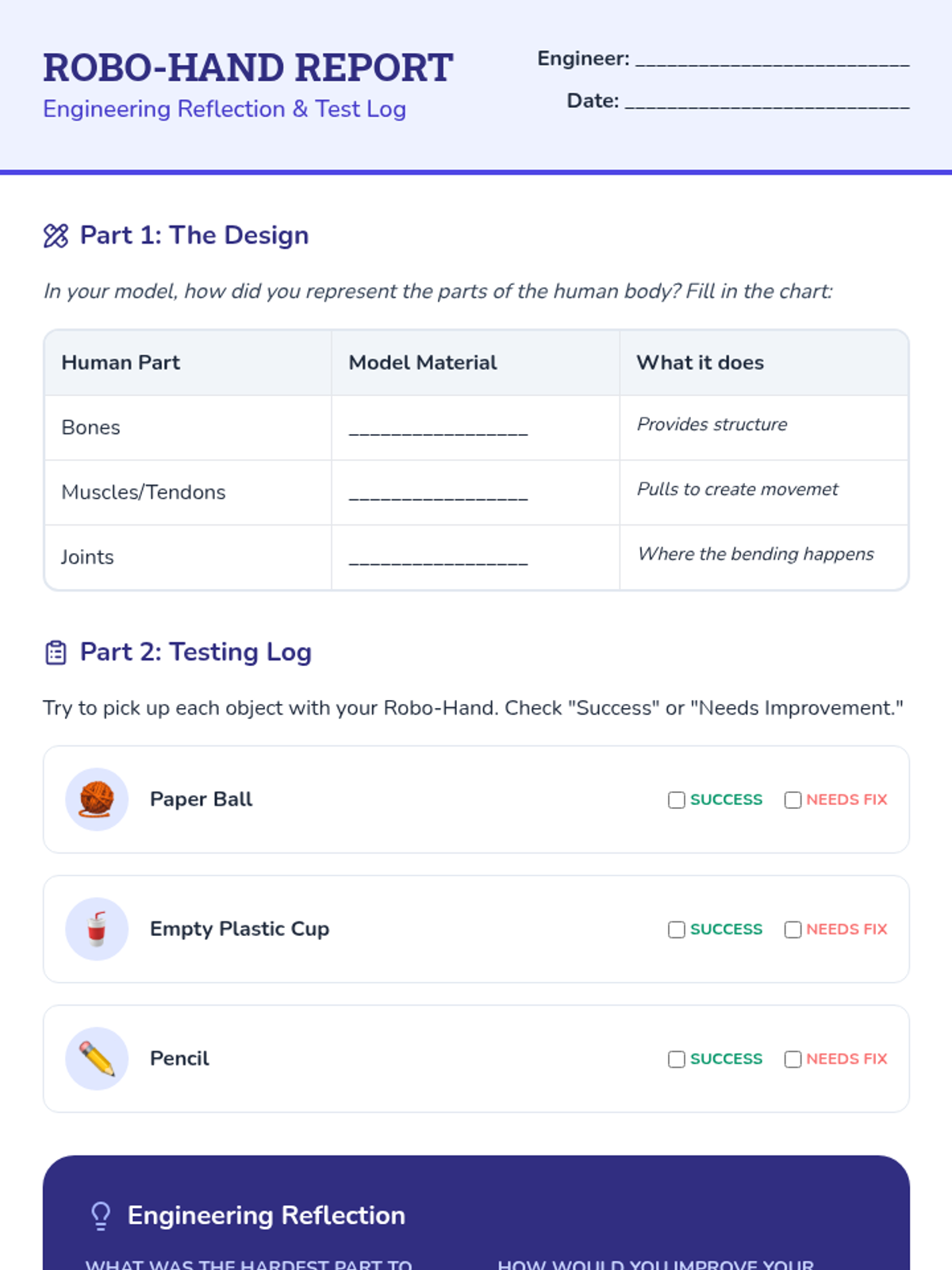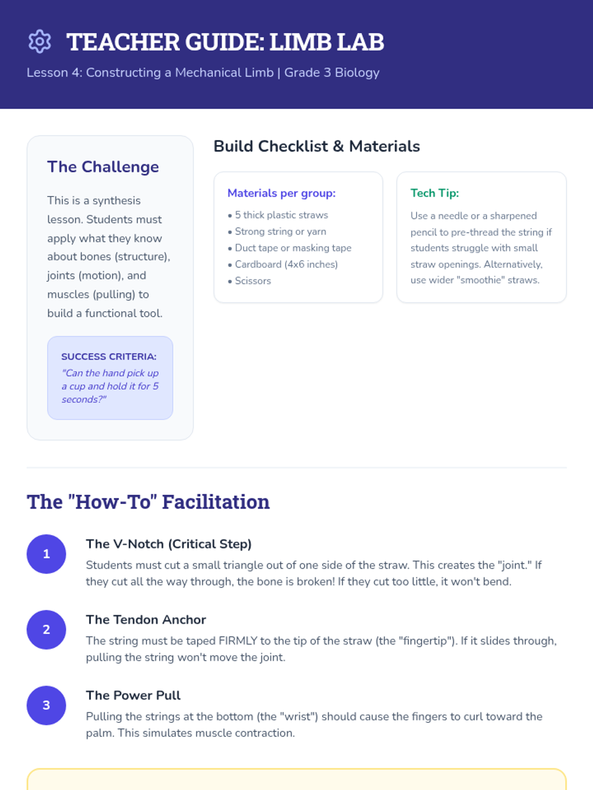 A project-based lesson where students synthesize their knowledge of bones, joints, and muscles to build a functional mechanical arm or hand.