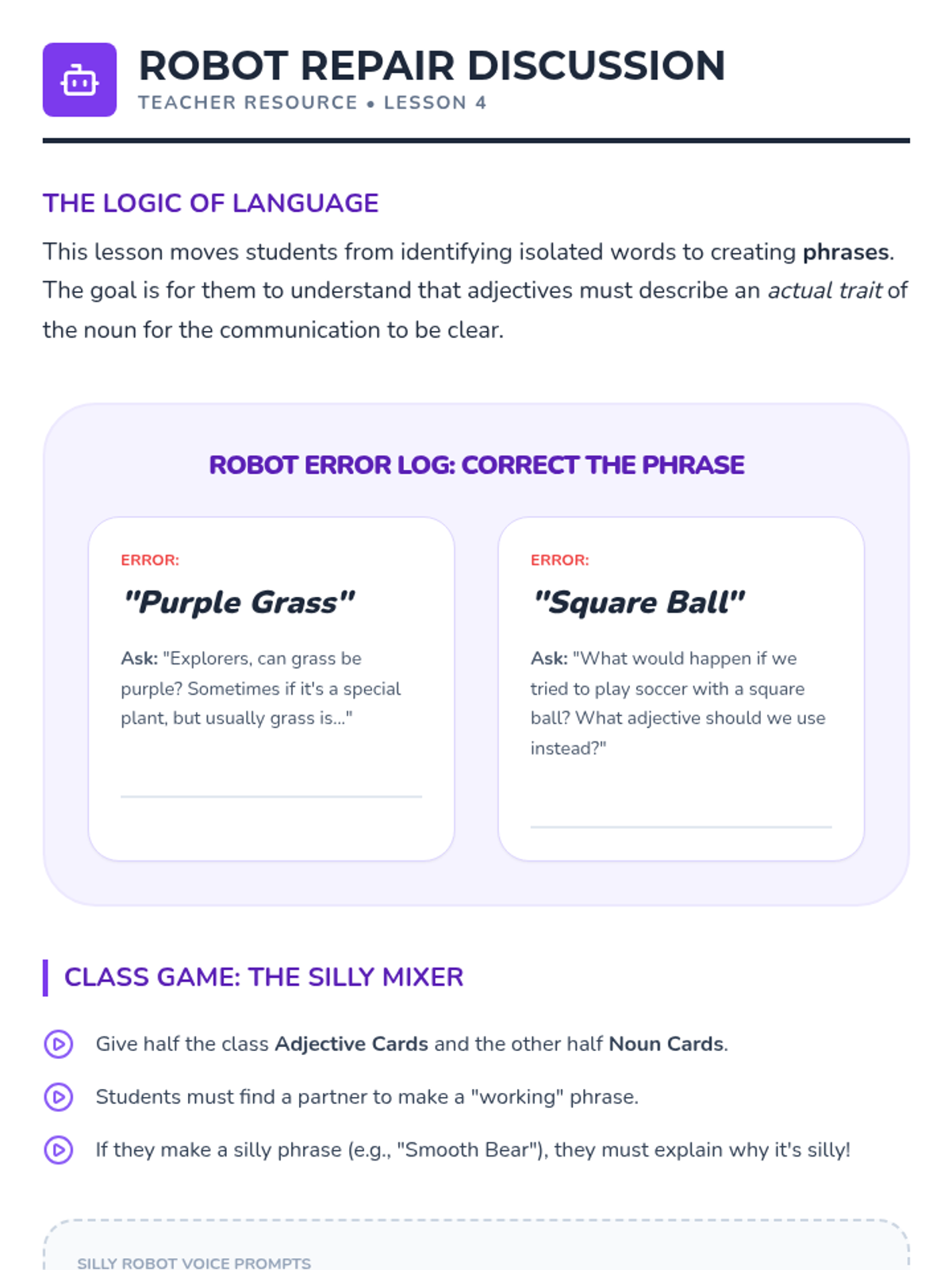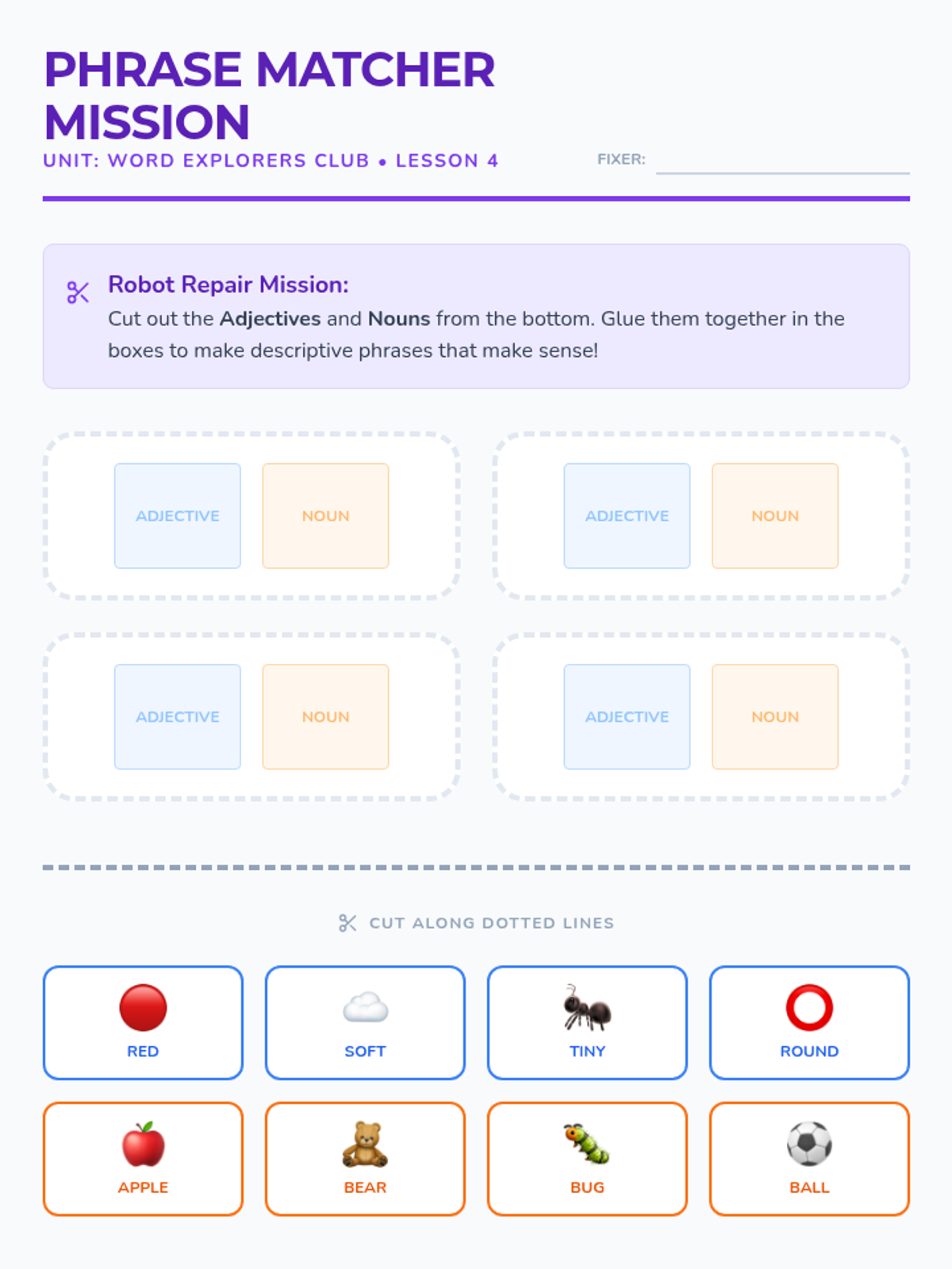 Students practice pairing specific adjectives with nouns to build simple, logical descriptive phrases.