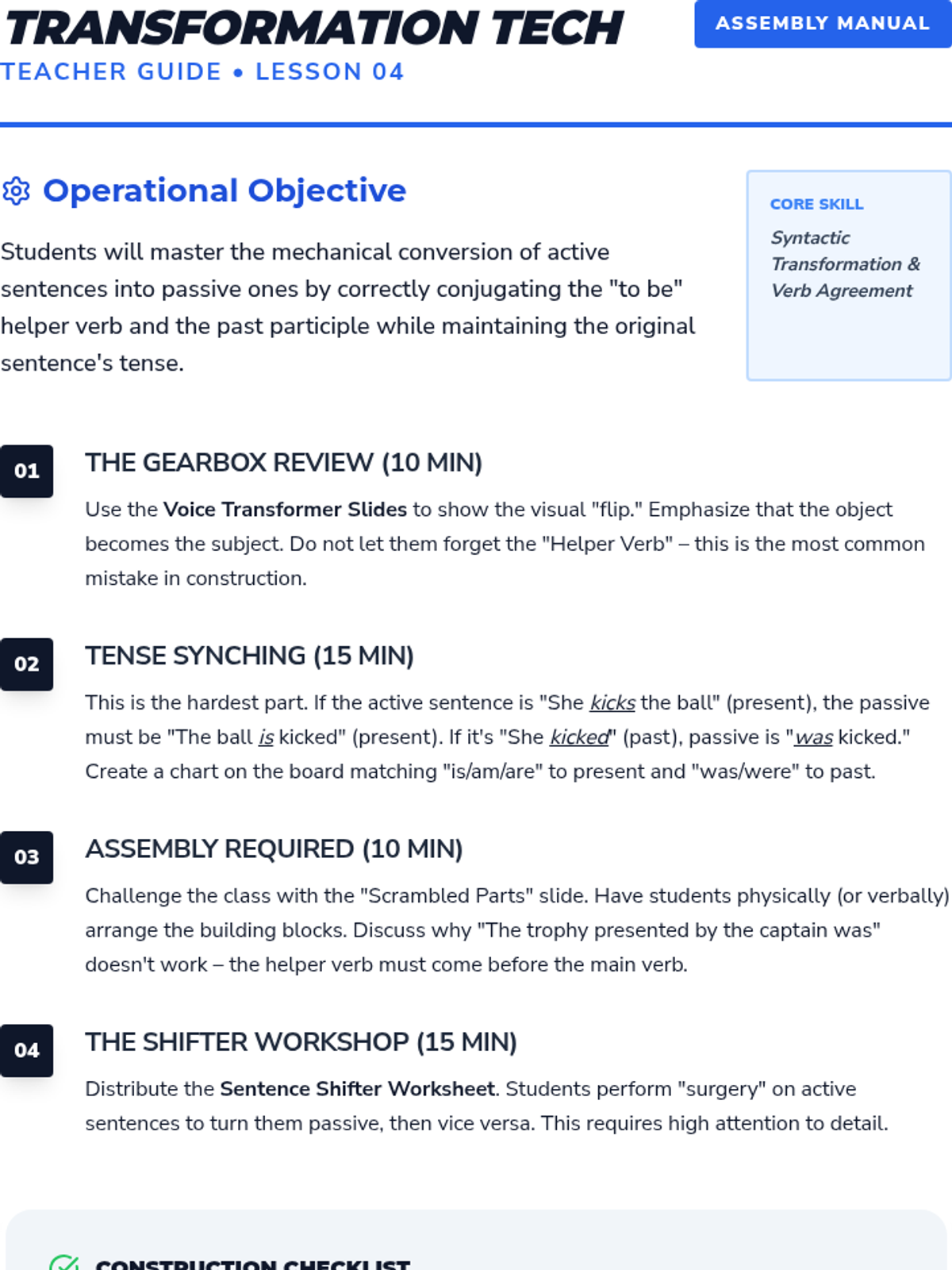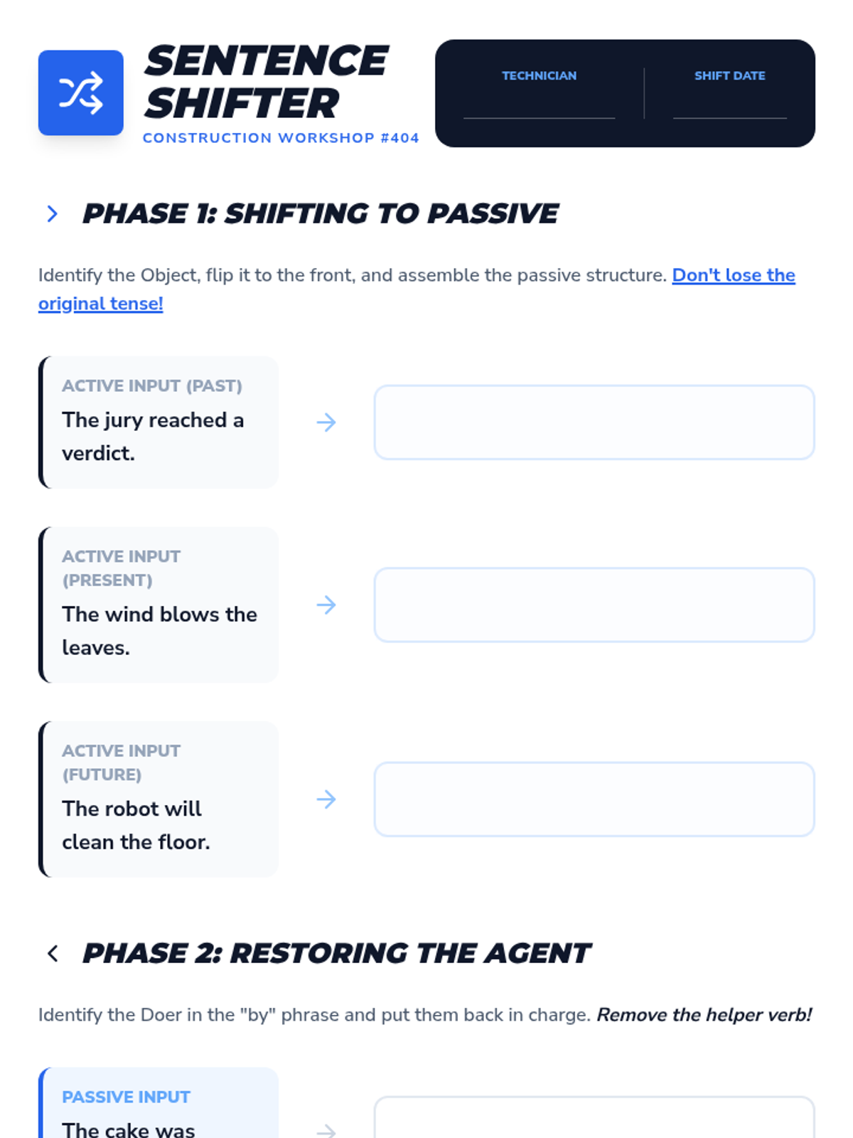 Students practice the mechanics of forming passive voice through verb conjugation and sentence transformation.
