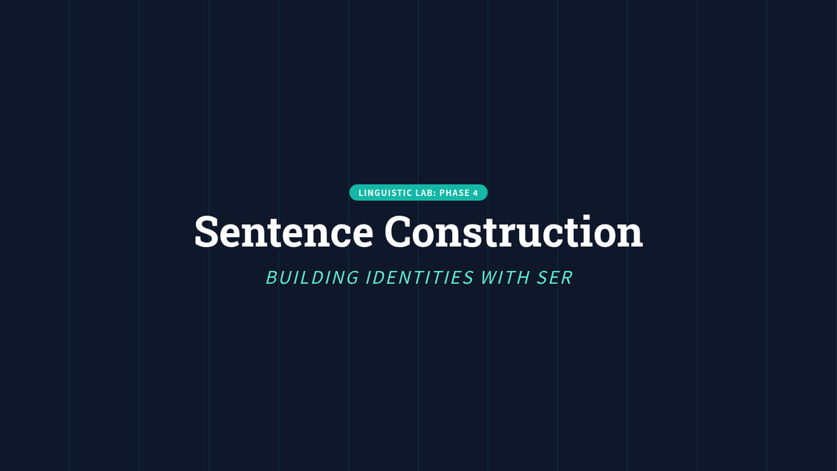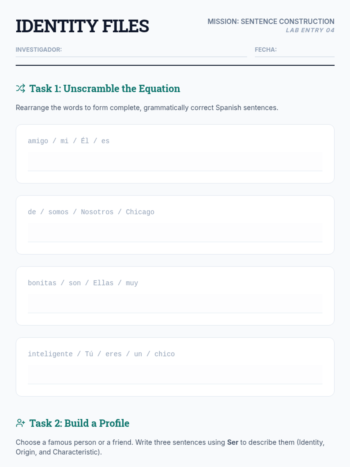 Students combine pronouns, 'Ser', and nouns/adjectives to create full sentences identifying people and their traits. The focus is on the 'Equation' sentence structure: Subject = Identity.