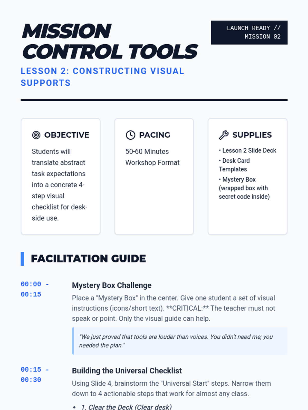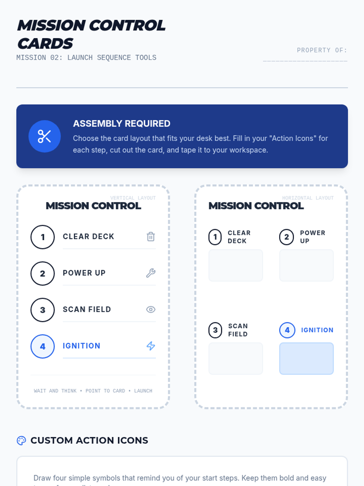 Students co-create a universal 'Task Start Checklist' and customize it into personal visual tools like desk cards or planner inserts.