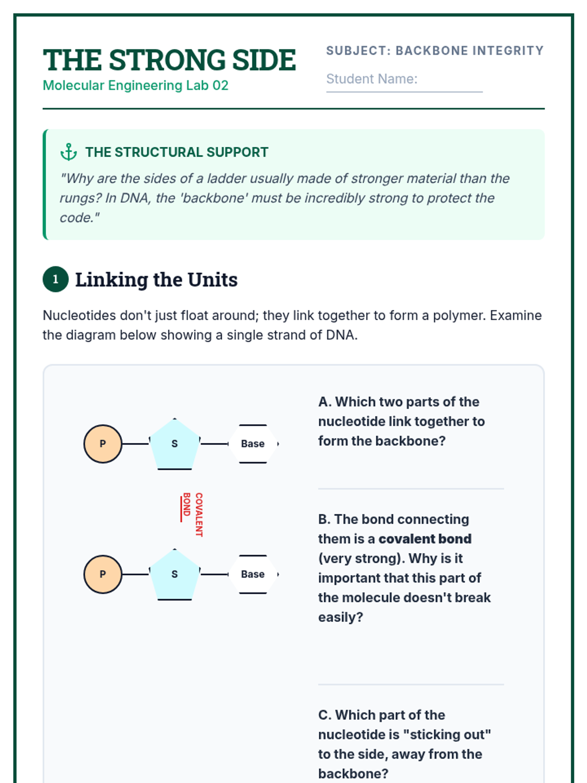 Learners discover how nucleotides link vertically to form the sturdy sugar-phosphate backbone, the "sides of the ladder" that protect genetic information.