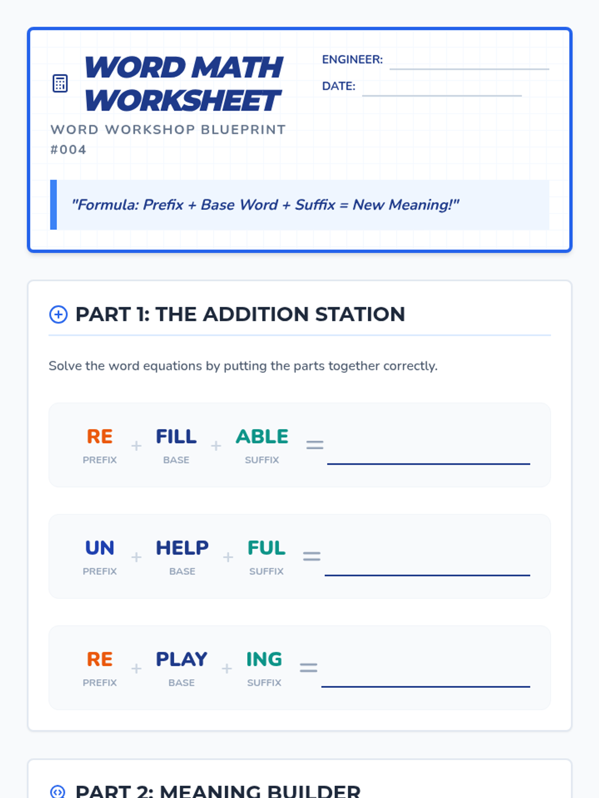 Students treat vocabulary like math equations, creating 'word sums' by combining prefixes, roots, and suffixes. This reinforces spelling and structural analysis.