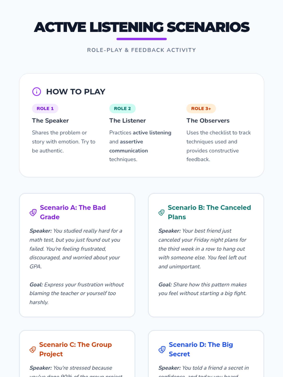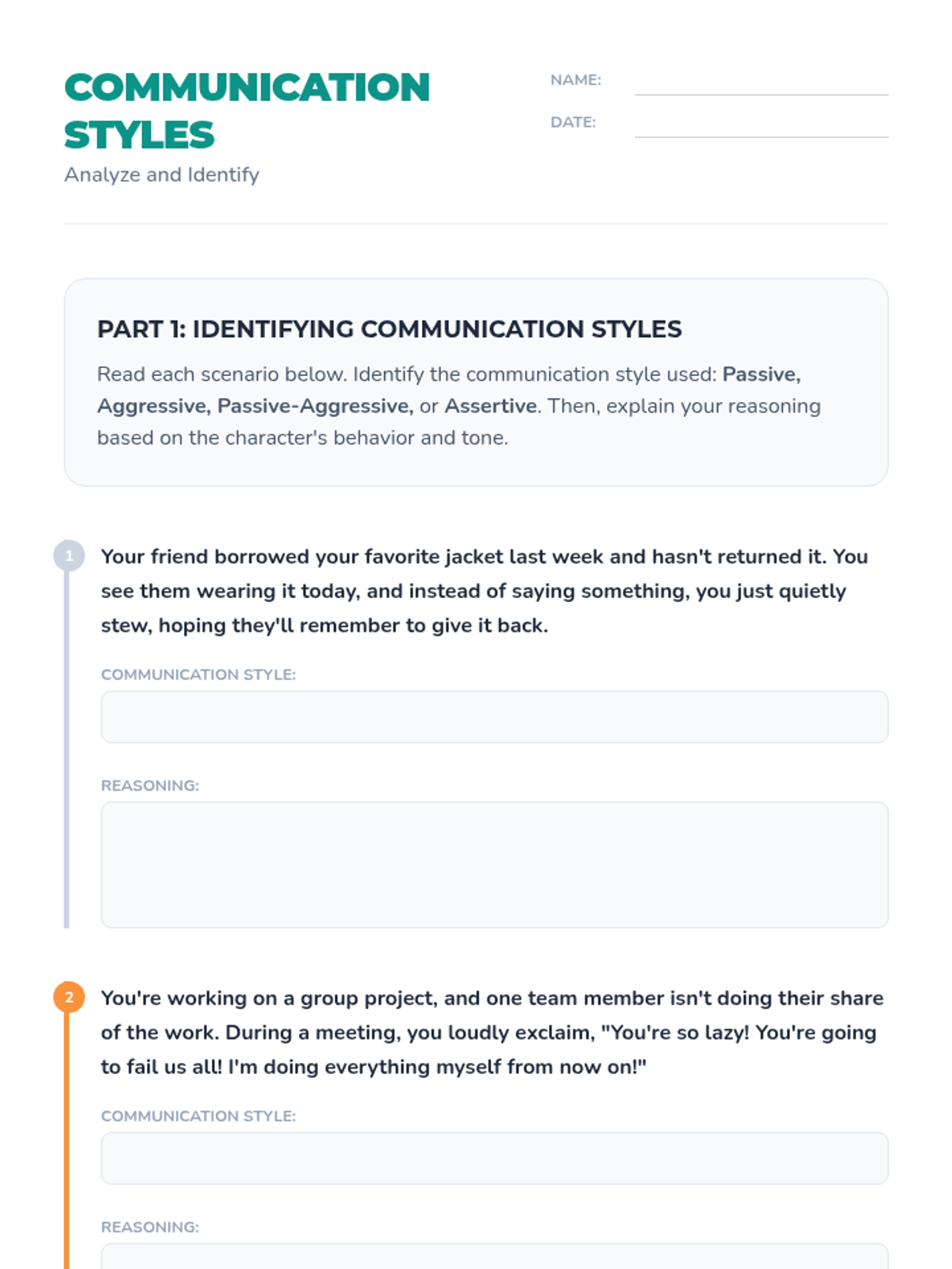 This lesson explores the art of constructive communication, helping students build healthier relationships by focusing on clear, empathetic, and respectful dialogue. Students analyze communication styles (Passive, Aggressive, Passive-Aggressive, Assertive) and practice active listening techniques.