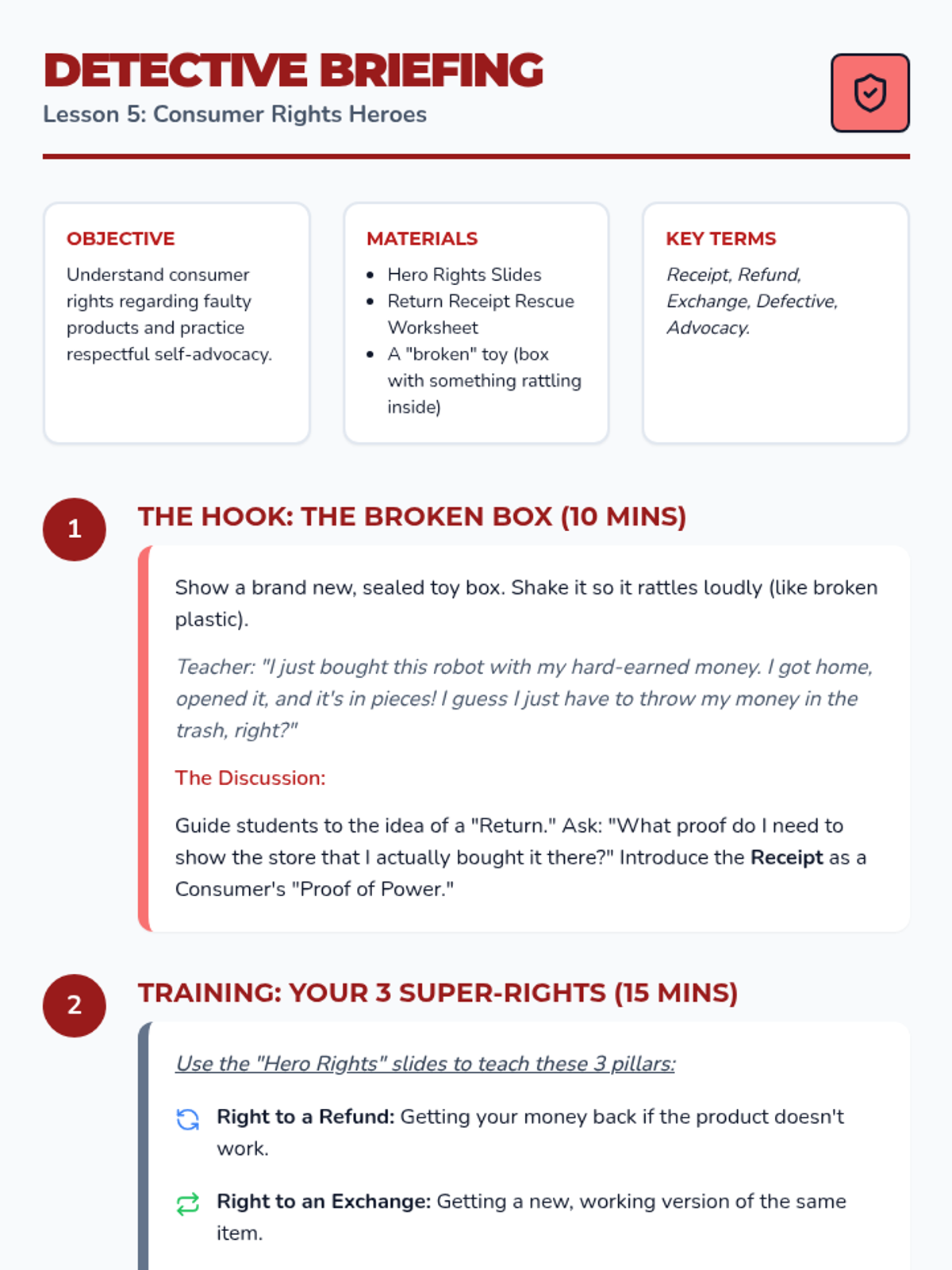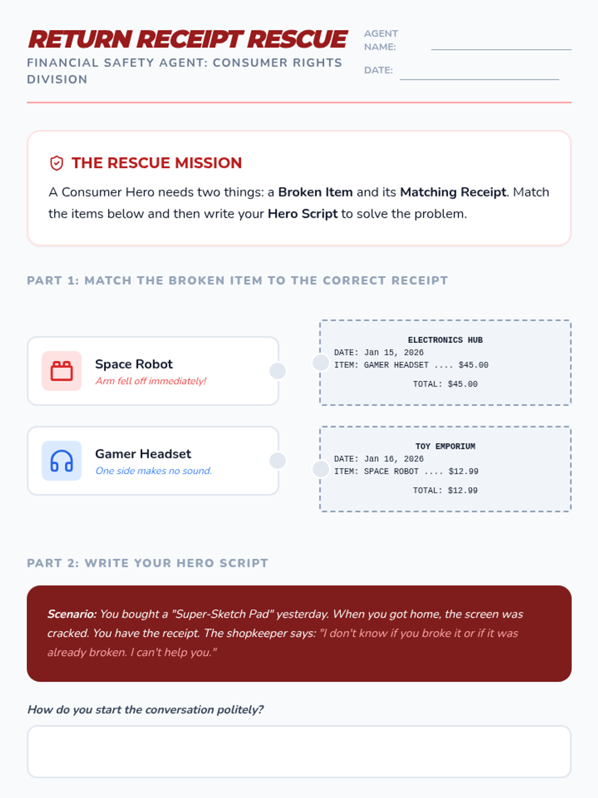 Students learn about their rights as consumers, specifically regarding returns and exchanges. They practice how to respectfully but firmly advocate for themselves when a product is broken or not as described.