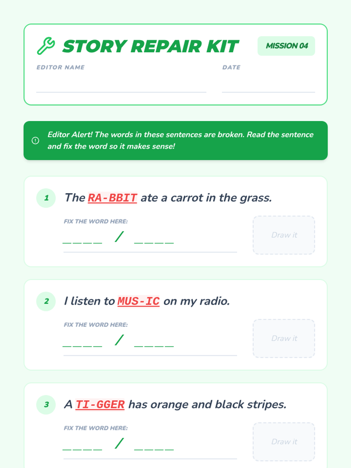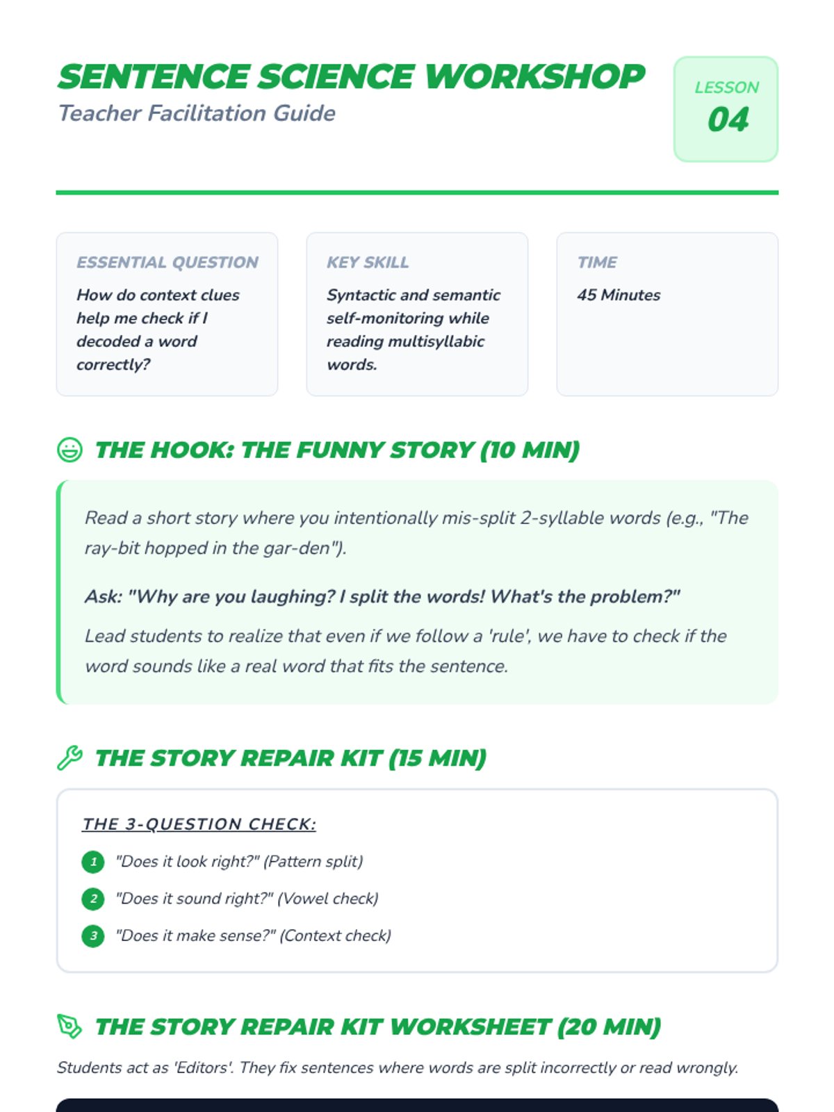 Students learn to use context clues alongside syllabication strategies to ensure their decoding makes sense within a sentence.