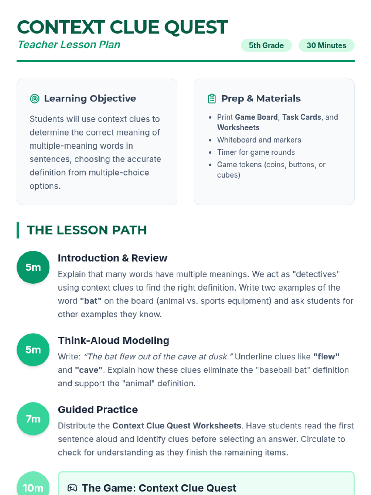 A high-energy, small-group lesson where 5th graders master multiple-meaning words using context clues through guided practice and a competitive board game.