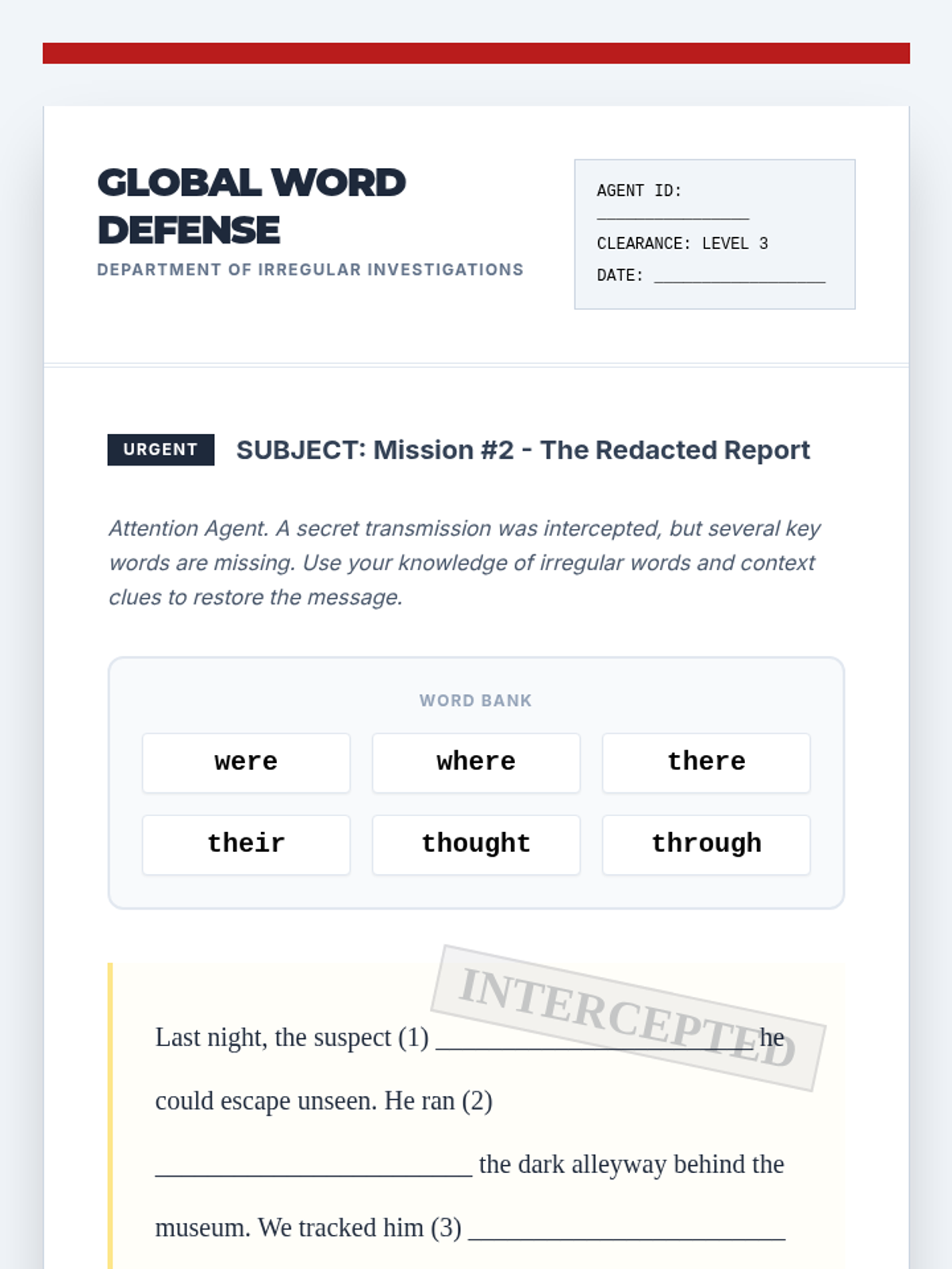 Students use sentence context and syntactic awareness to identify the correct irregular words in 'cloze' reading passages.
