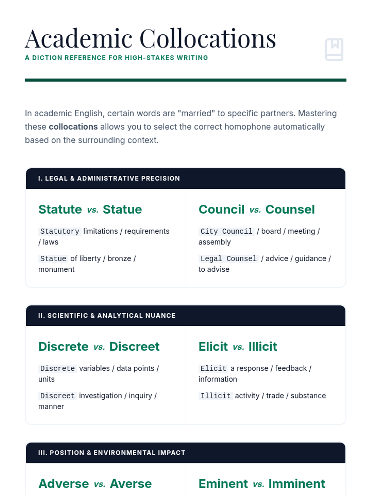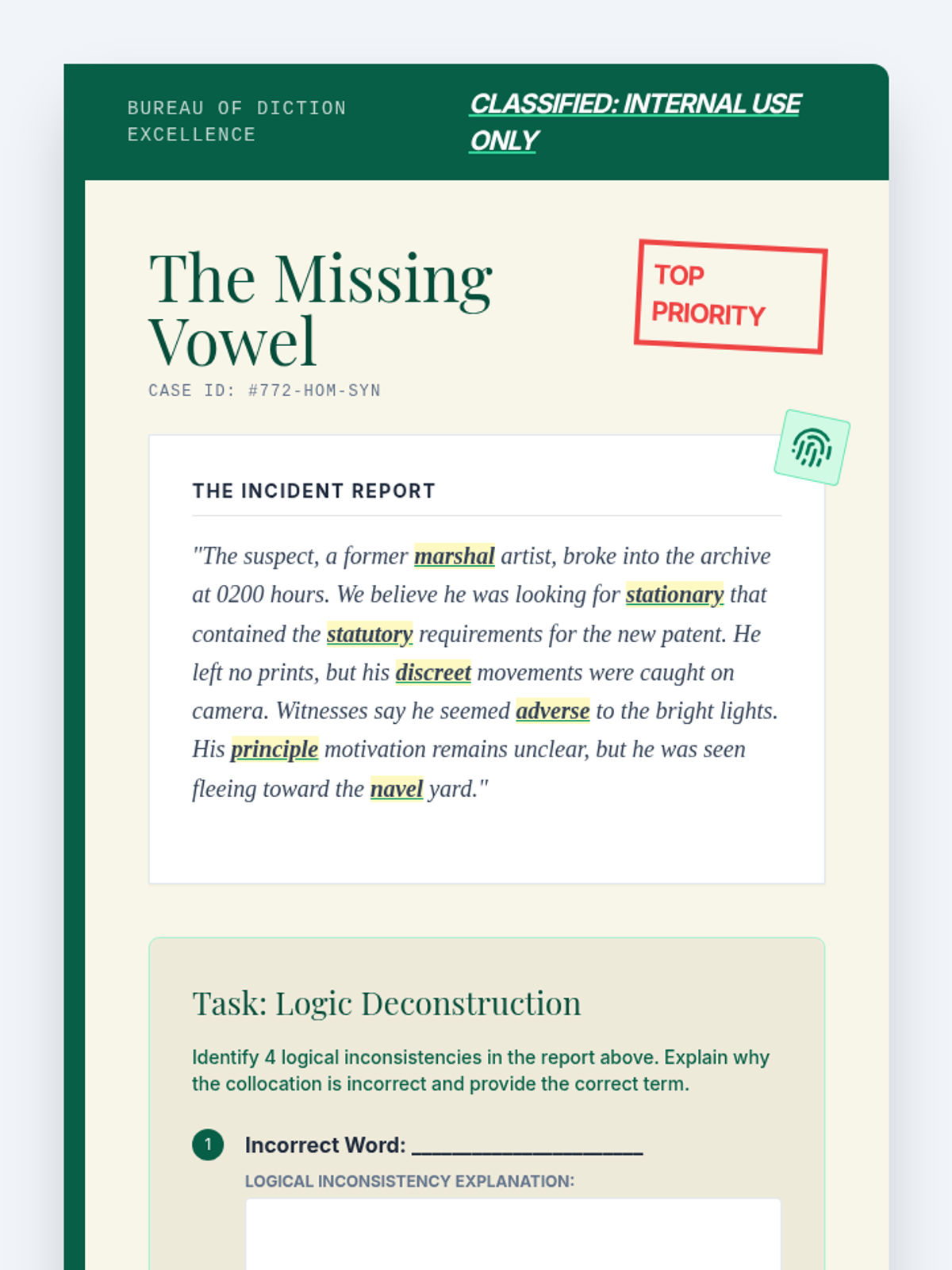 Students investigate how context clues and collocations dictate word choice. They engage in a detective-style activity to identify logical inconsistencies caused by homophone errors.