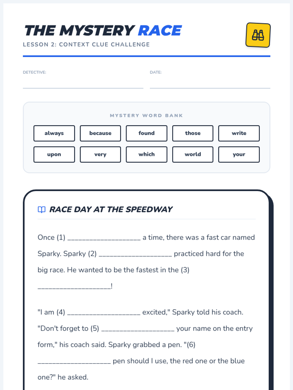 Students practice using context clues to identify sight words within sentences and stories, connecting isolated recognition to comprehension.