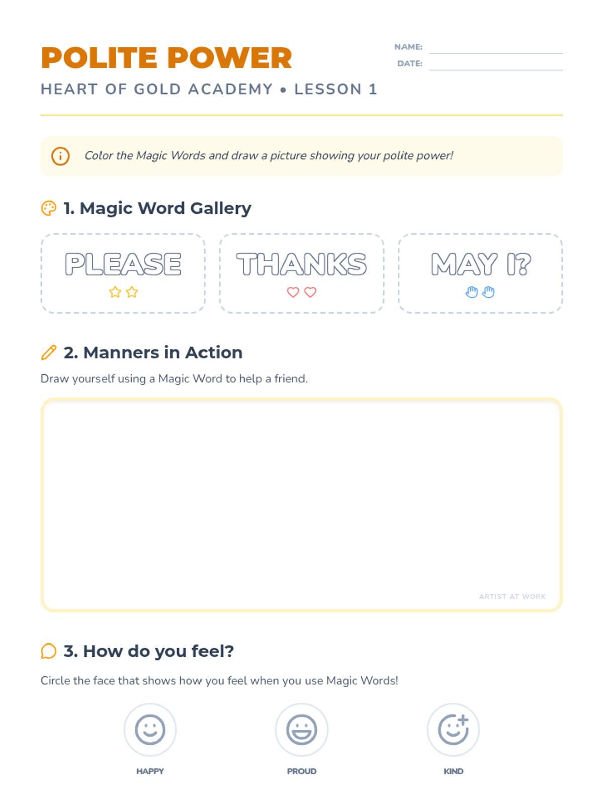 Introducing young learners to the foundational 'magic words' of courtesy and the importance of polite manners in everyday classroom life.