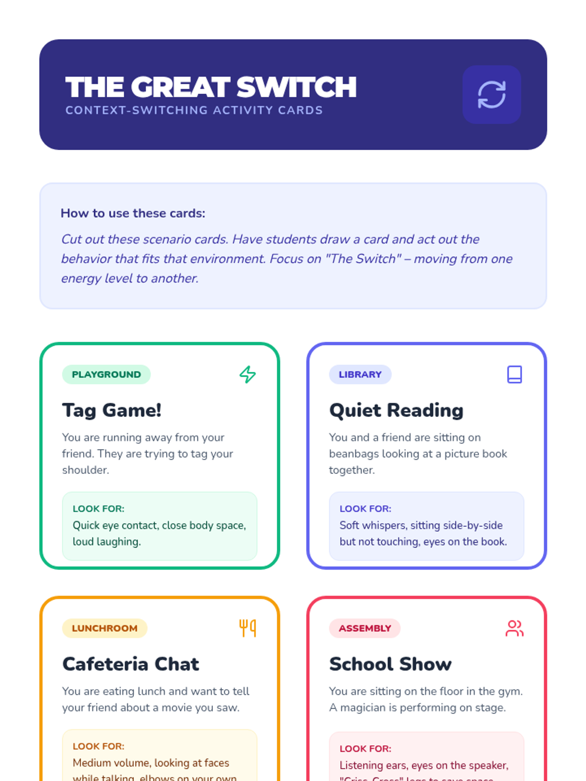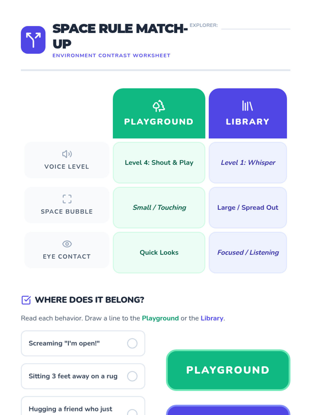 Students contrast the social rules of high-energy environments (playground) with quiet environments (library), practicing context-switching for space and eye contact.