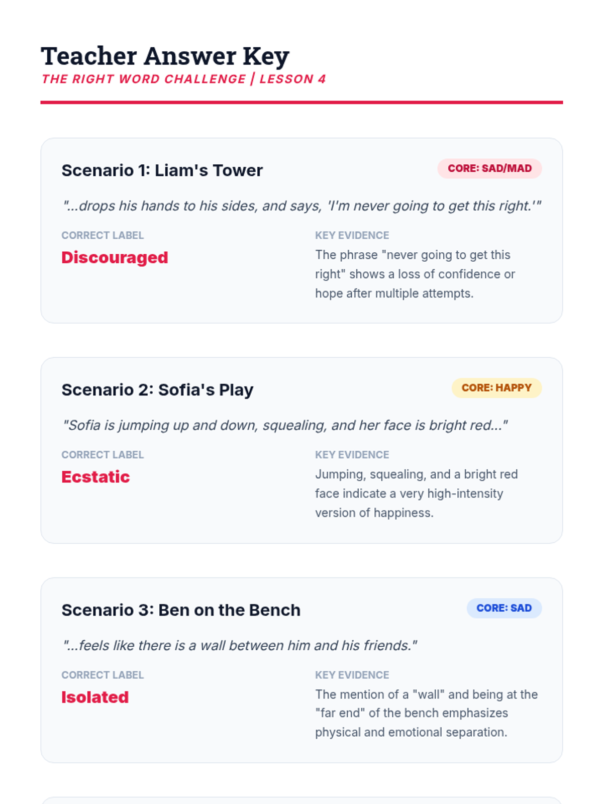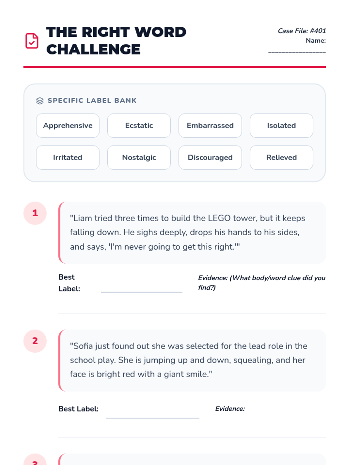 Students apply their expanded vocabulary to real-world scenarios, using context clues to select the most precise emotional labels and defending their choices with evidence.