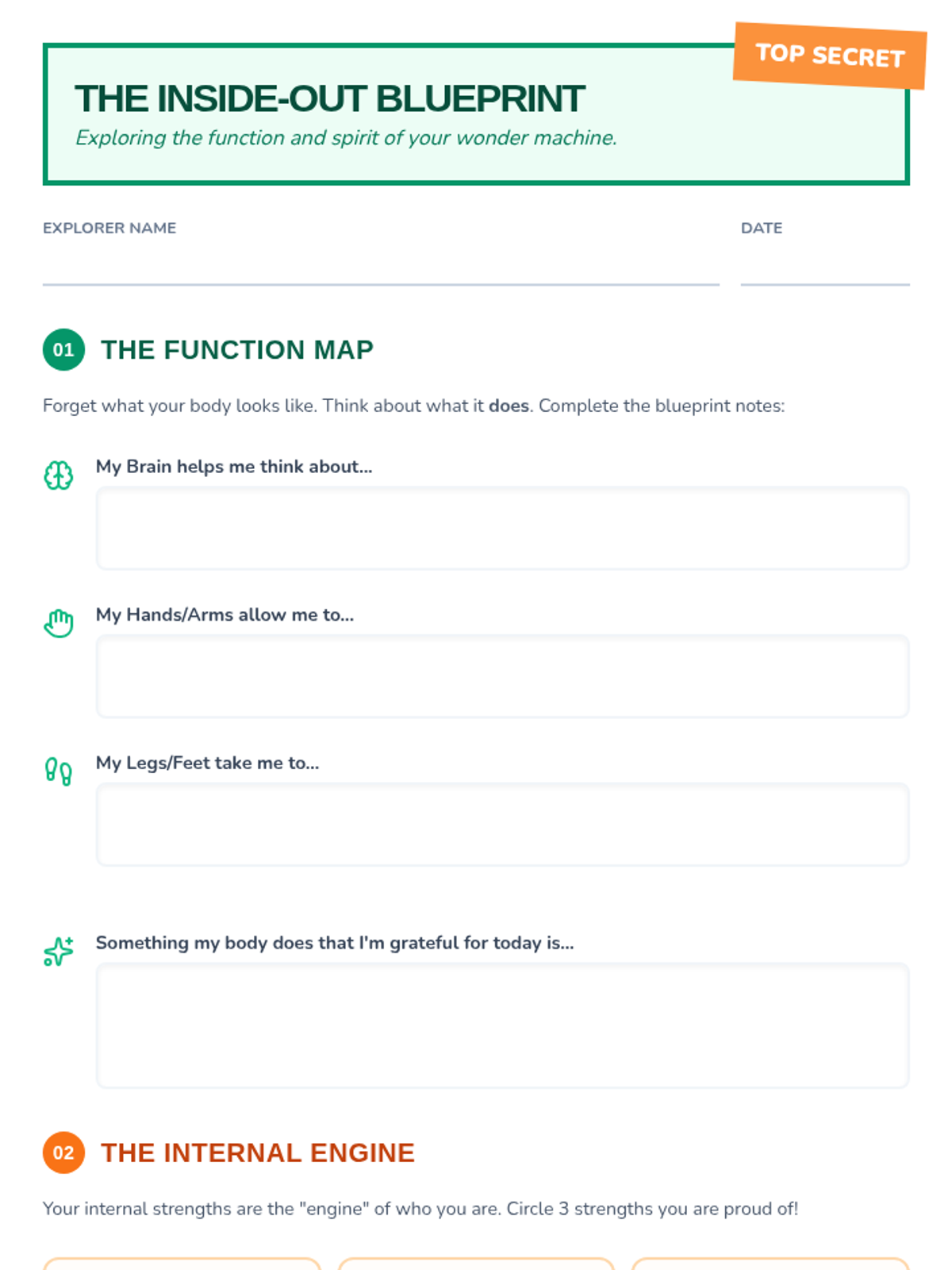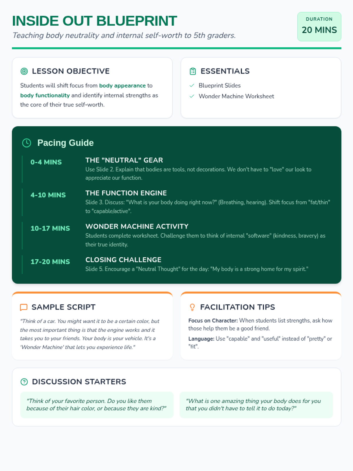 A 20-minute lesson focusing on body neutrality, functionality, and internal strengths to shift focus from appearance to self-worth and capability for 5th grade students.