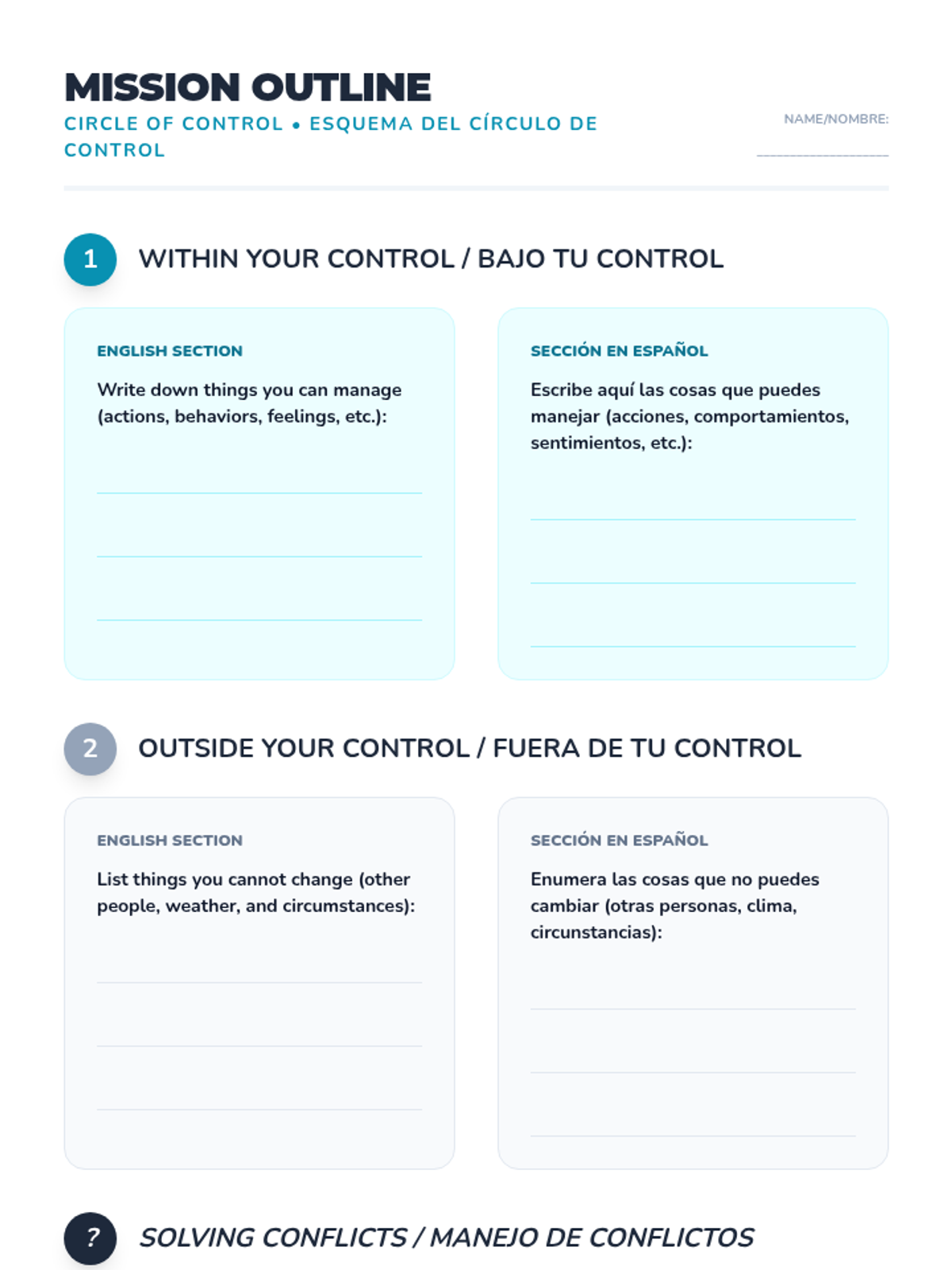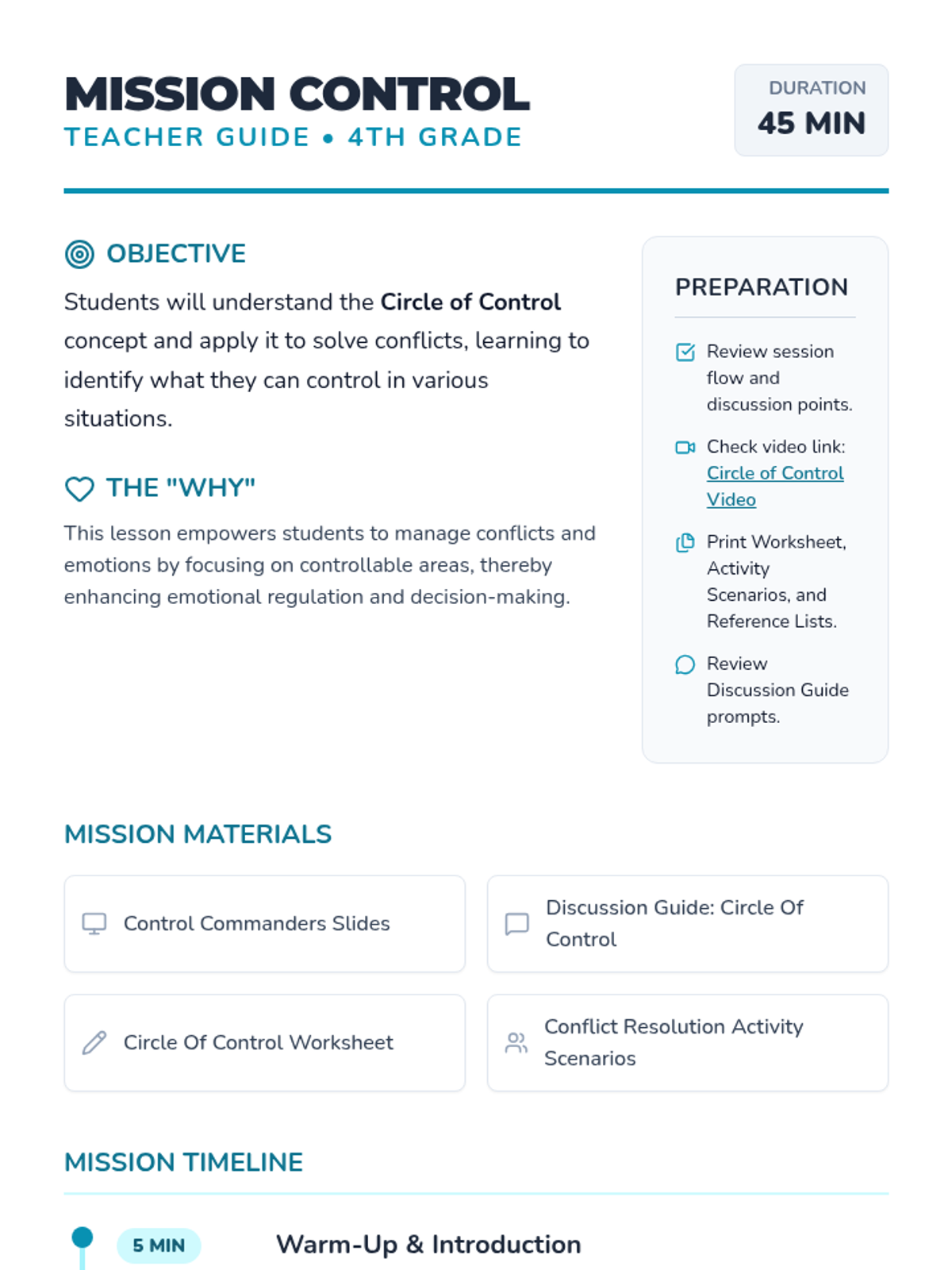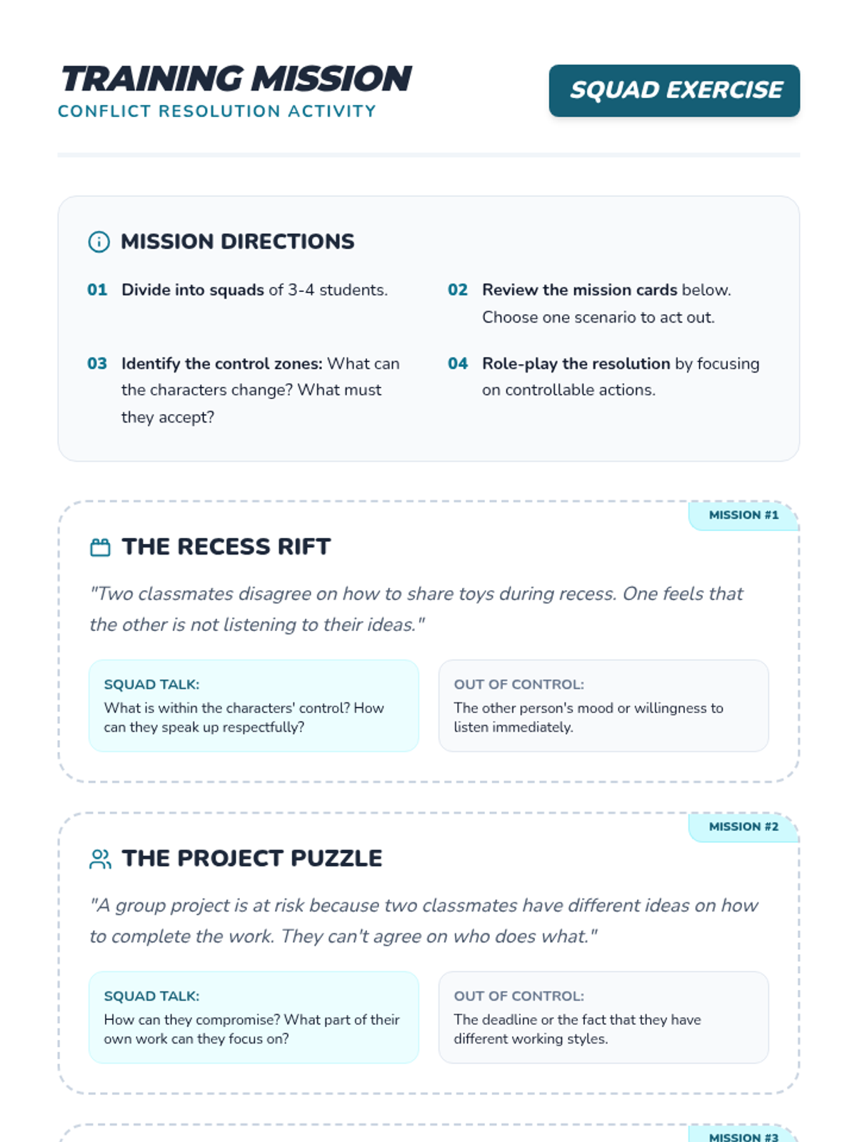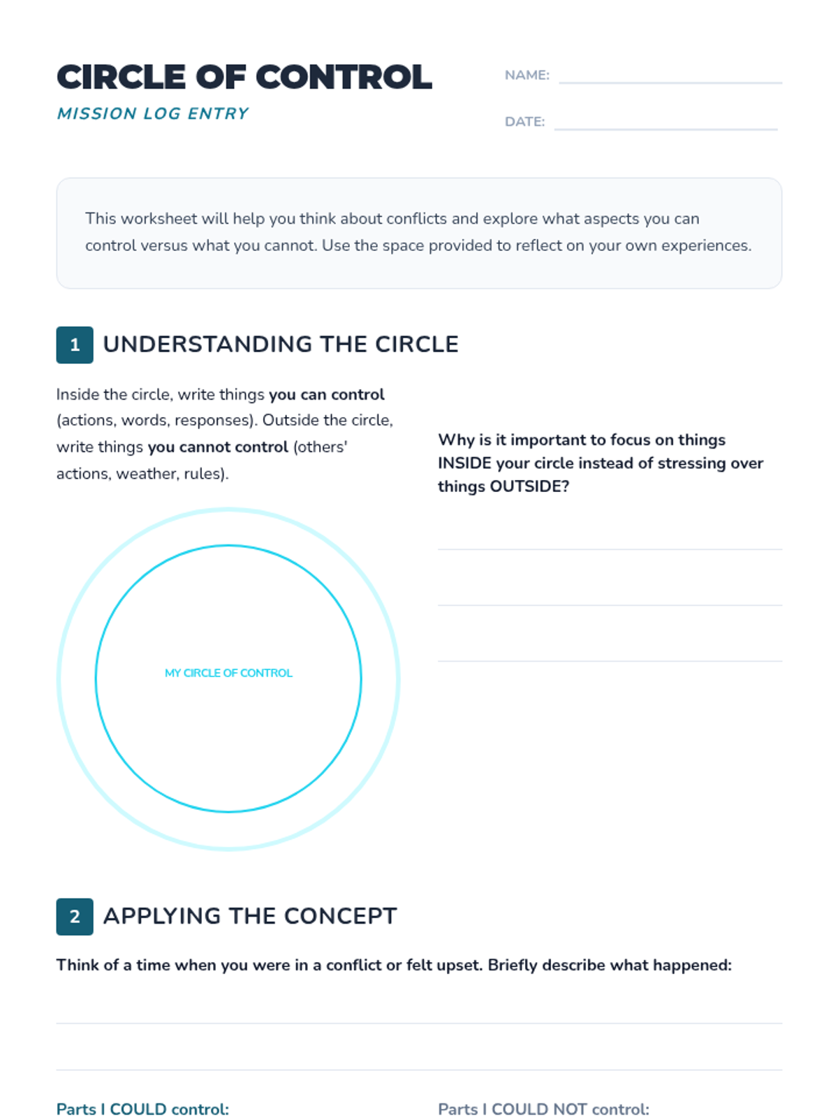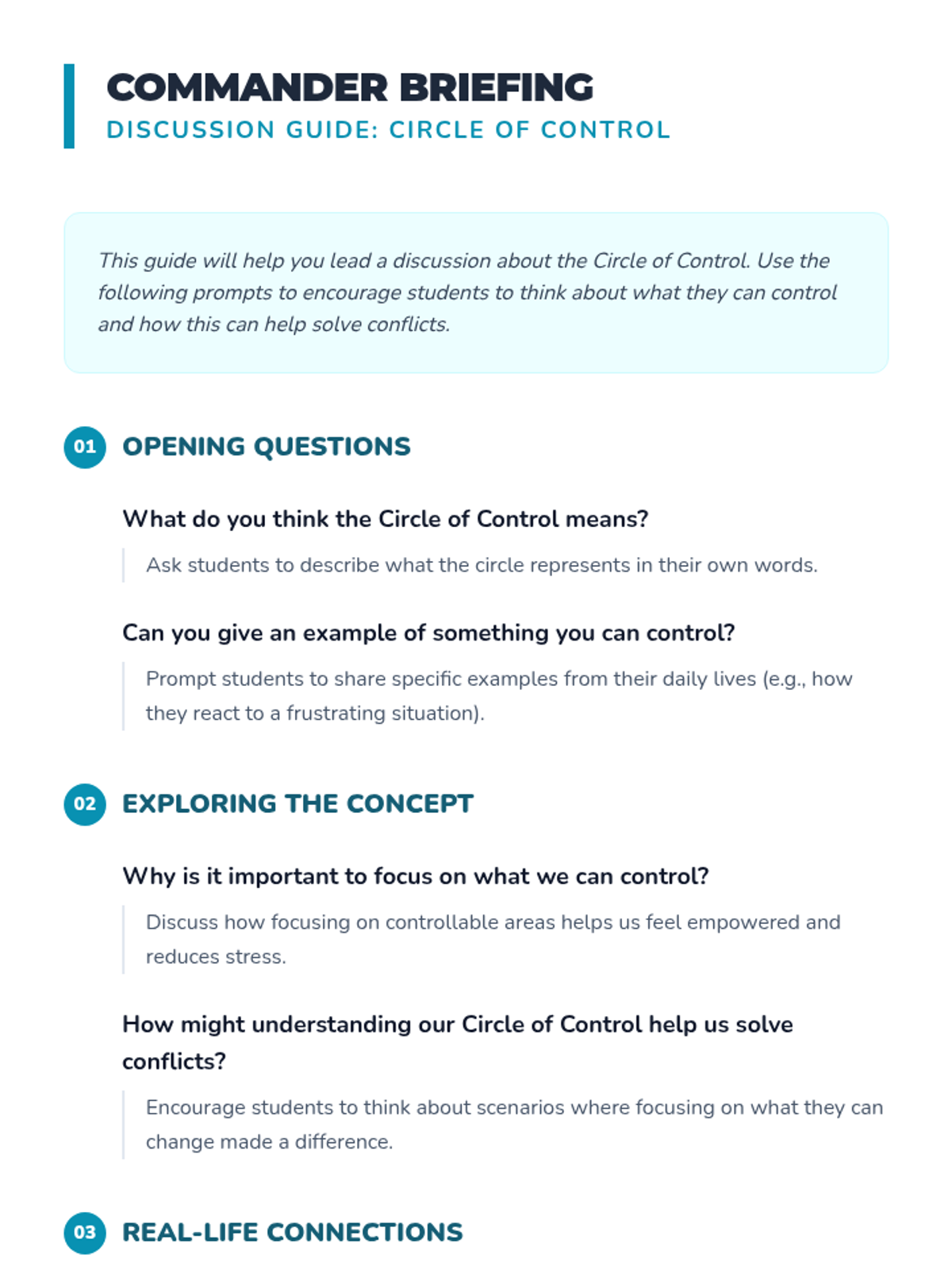 Students learn to distinguish between what they can and cannot control to navigate conflicts effectively and build emotional resilience.