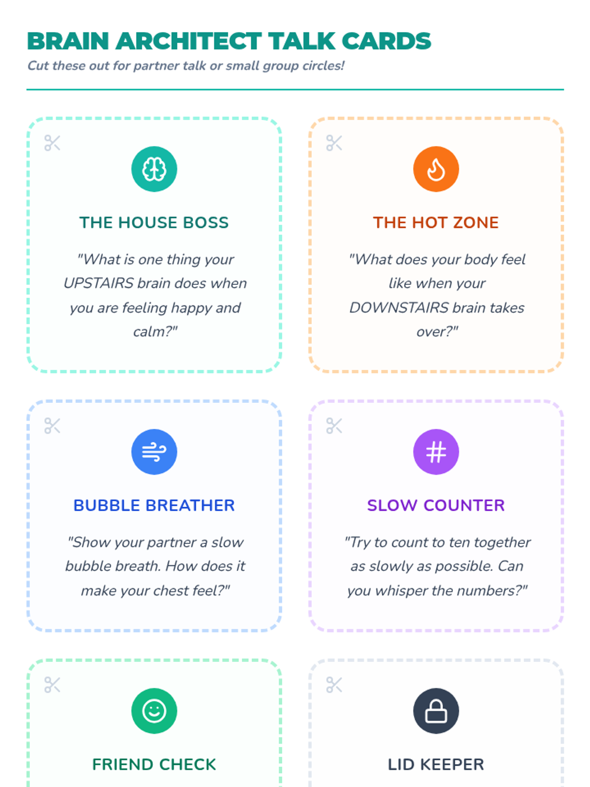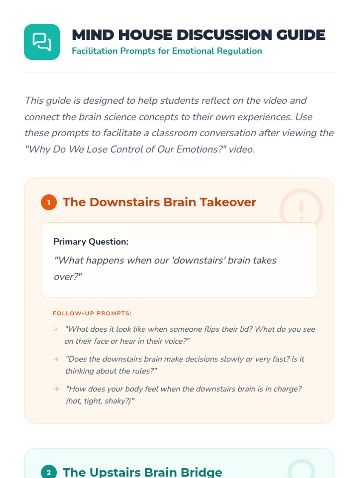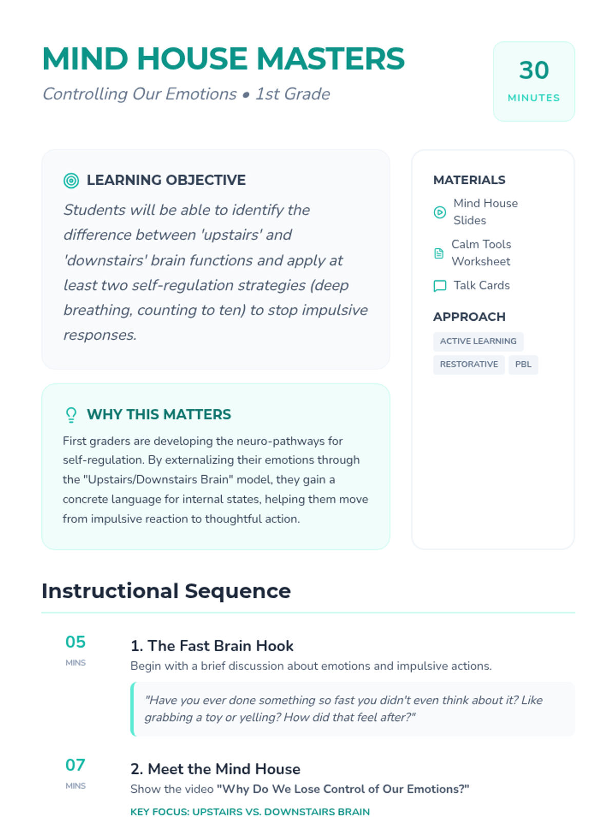 This lesson helps 1st graders understand the 'upstairs' and 'downstairs' brain to manage big emotions. Students will learn practical strategies like deep breathing and counting to ten to prevent impulsive reactions and stay in control of their 'Mind House'.