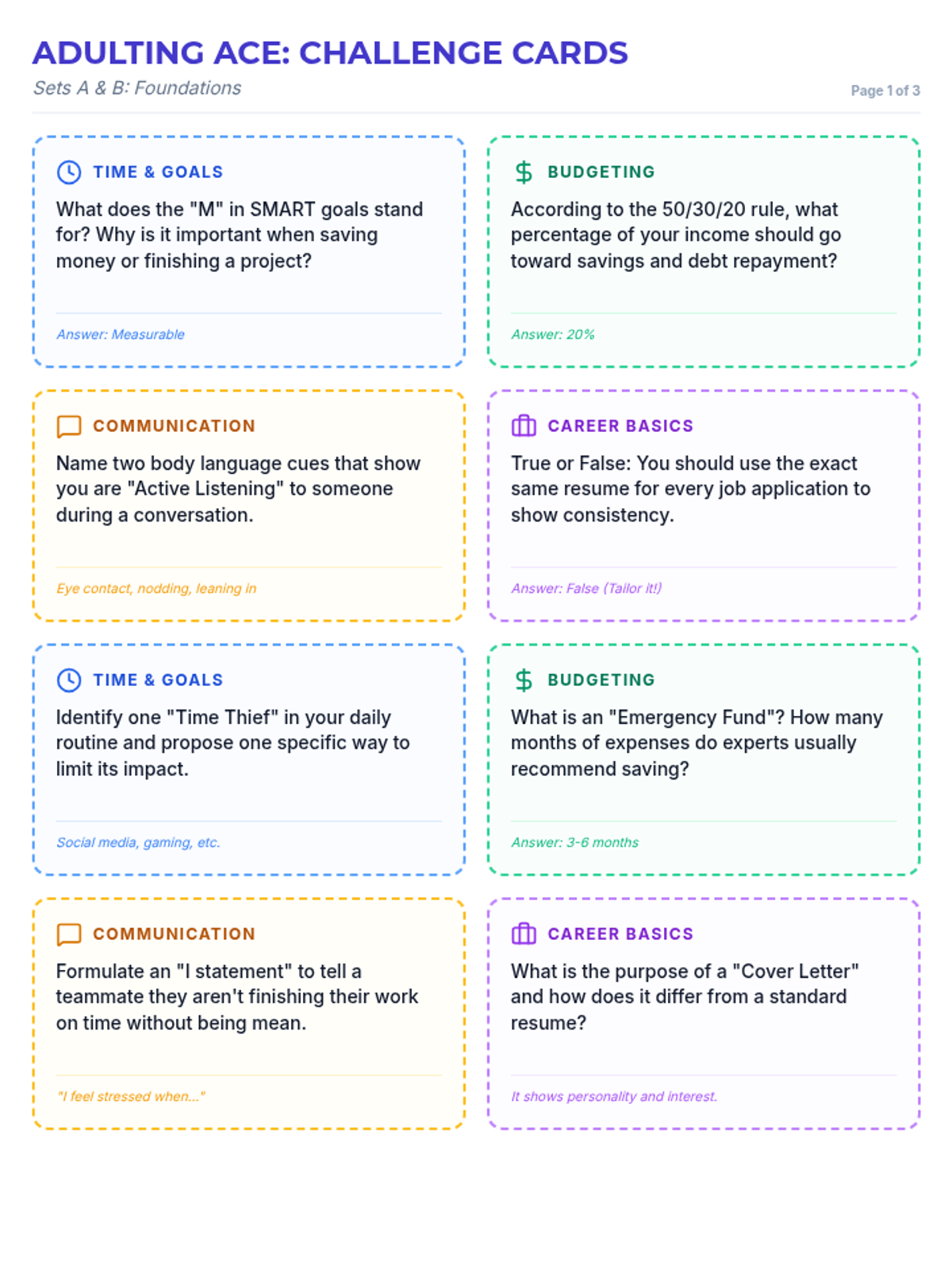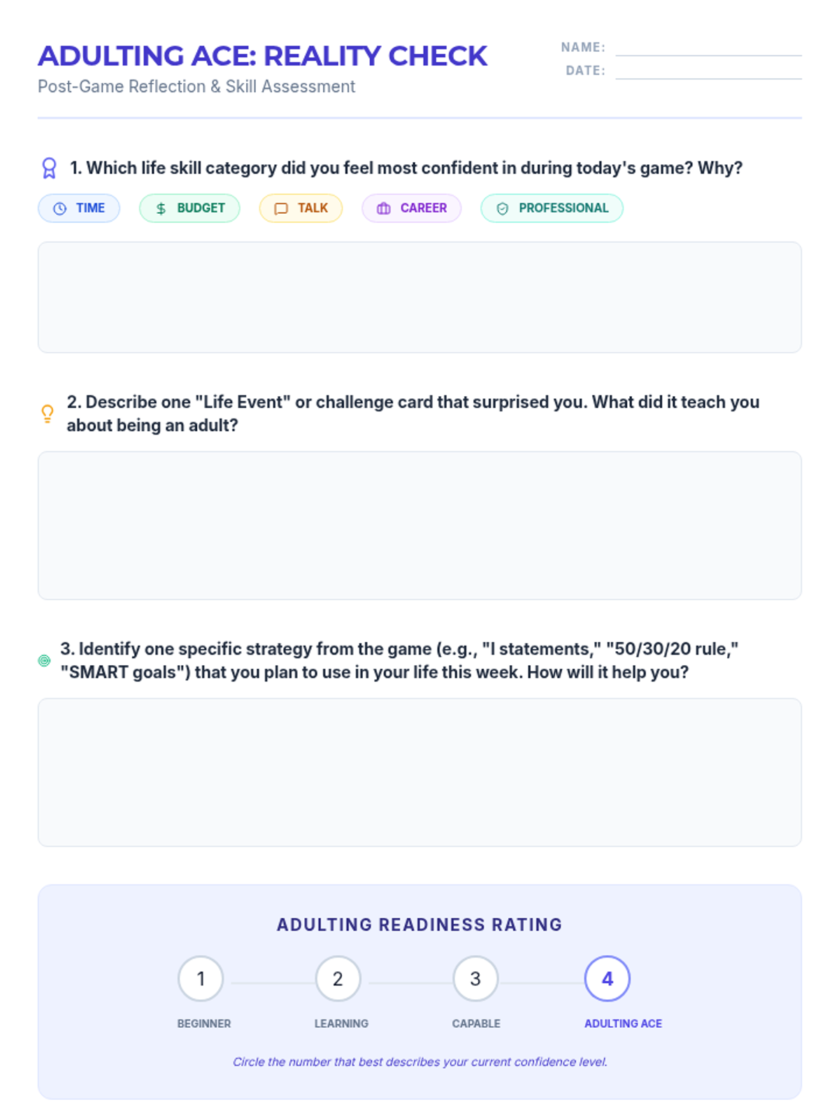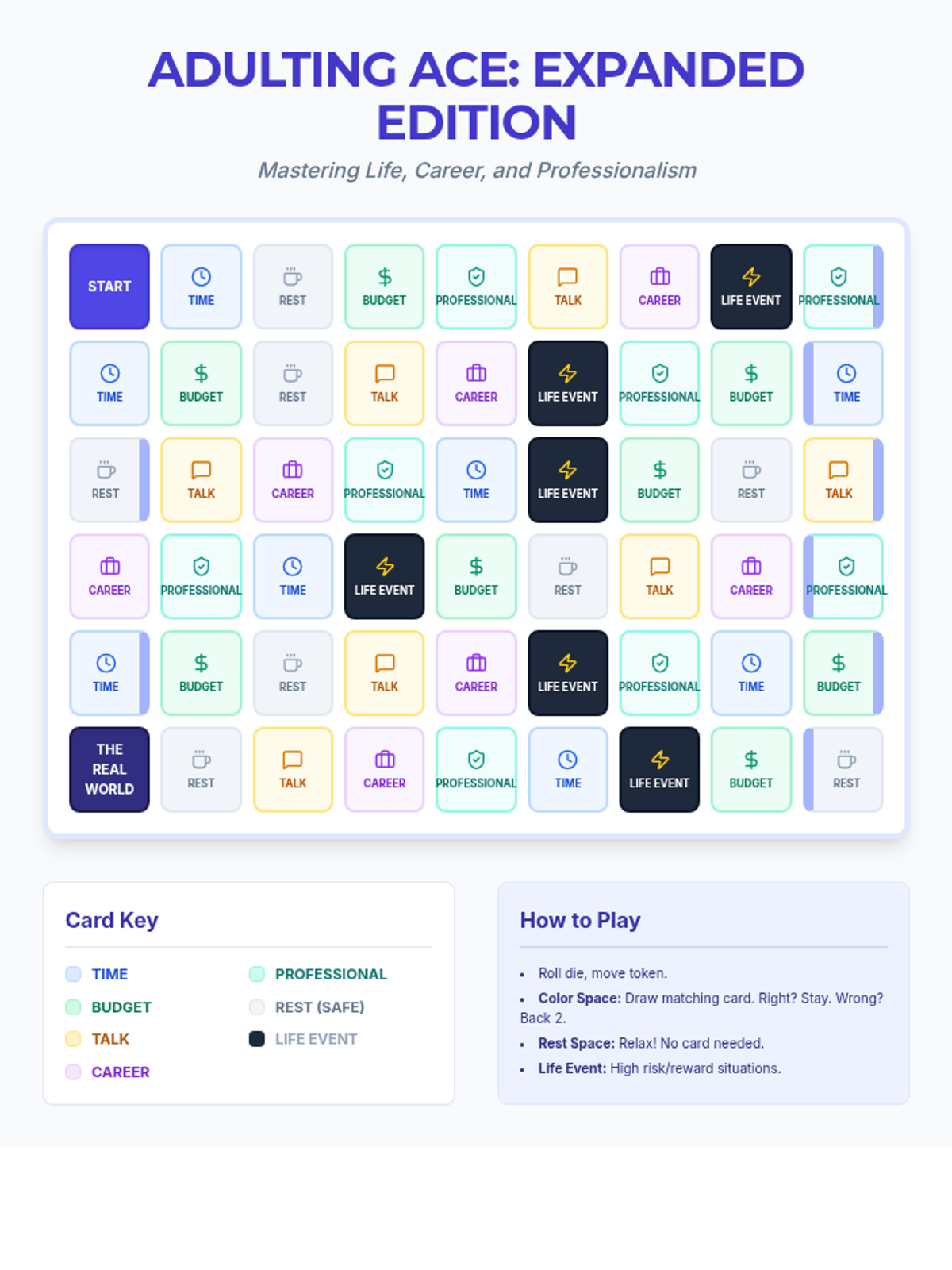 An interactive board game experience covering essential life skills including financial literacy, time management, communication, and career readiness.