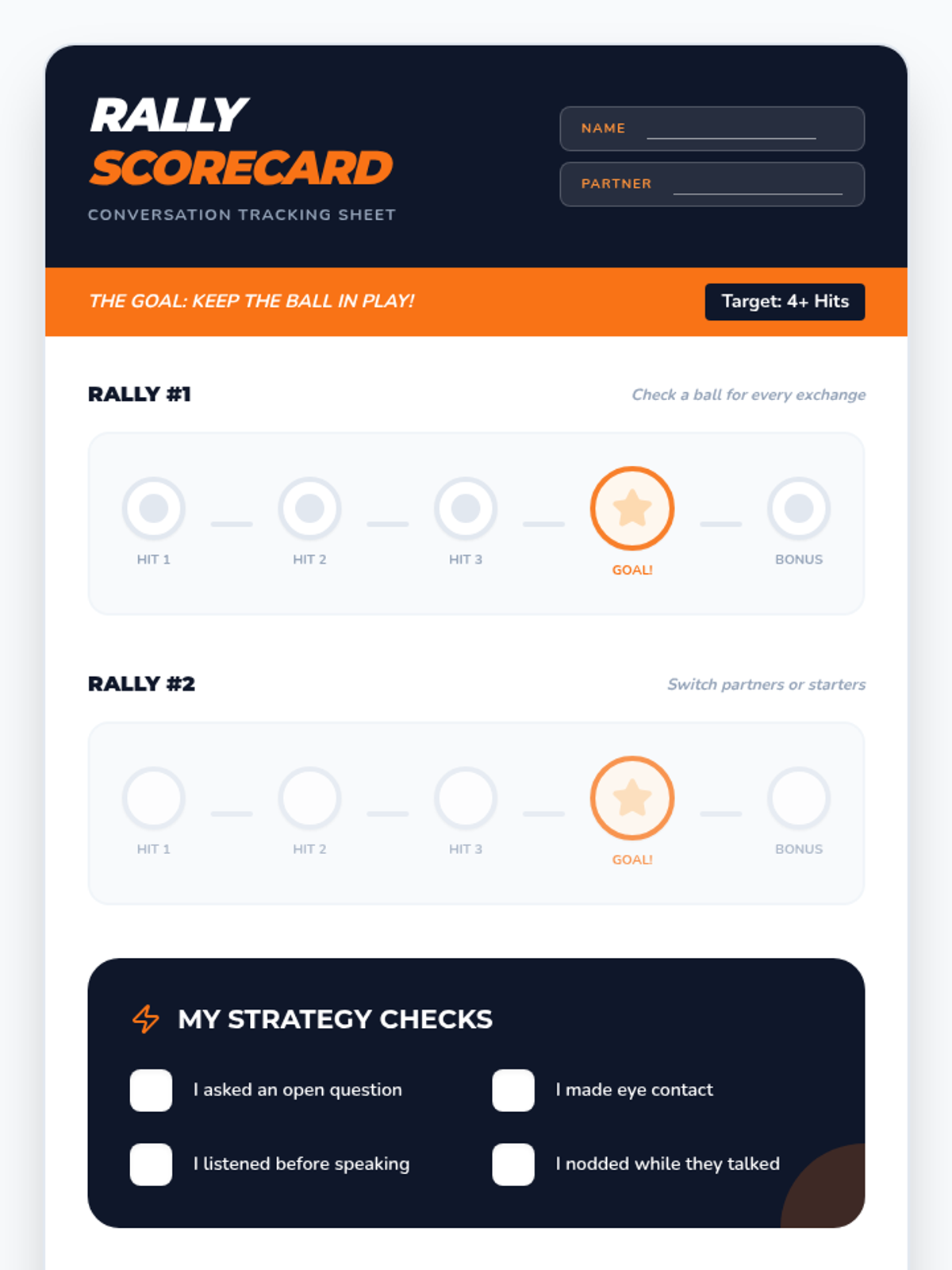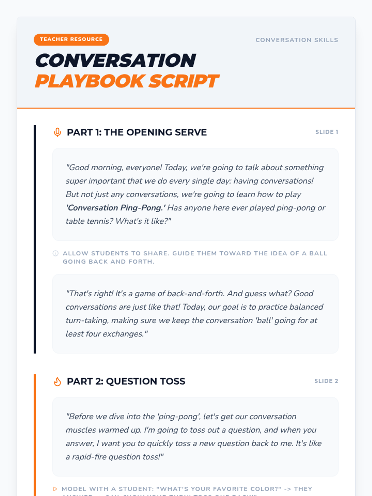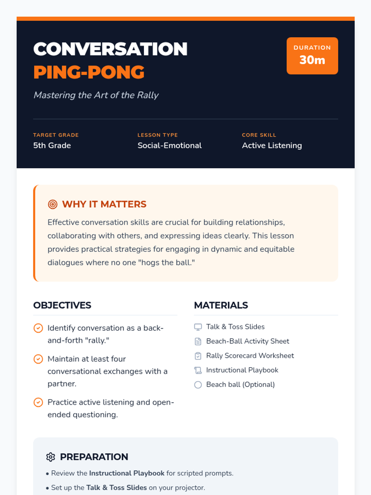 A 30-minute lesson for 5th graders to master balanced turn-taking in conversations using a sports-themed "ping-pong" analogy. Students will practice maintaining rallies of at least four exchanges with partners.
